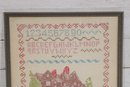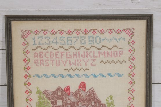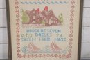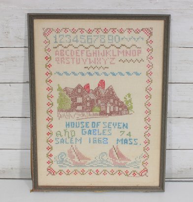 Charming vintage framed needlework sampler featuring a detailed depiction of the historic “House of Seven Gables” in Salem, Massachusetts, dated 1688. The sampler includes alphabet and numeric rows across the top, along with decorative borders and a colorful central house motif accented by trees and a coastal scene with sailboats.