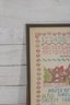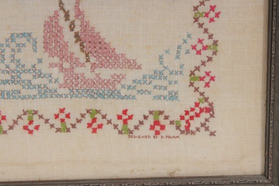 The piece is noted as a vintage sample designed by D. Primm (visible along the lower edge), adding to its collectible appeal. The soft pastel threads and classic cross-stitch design give this piece a warm, nostalgic quality perfect for traditional or colonial-style décor.