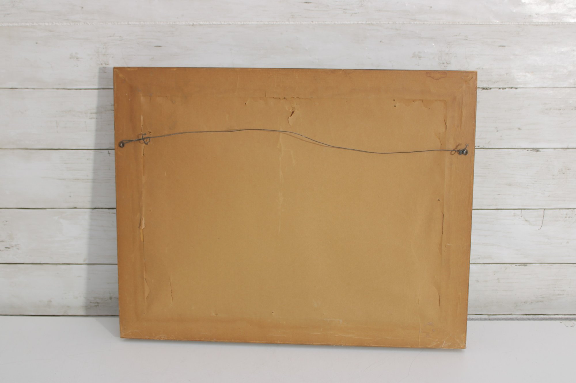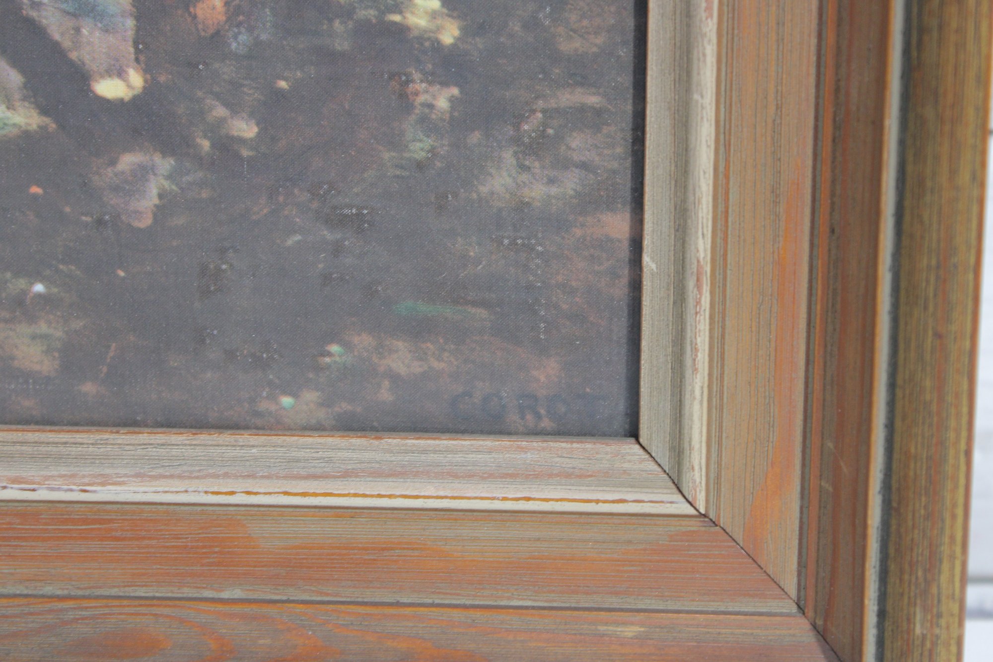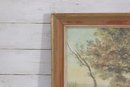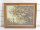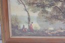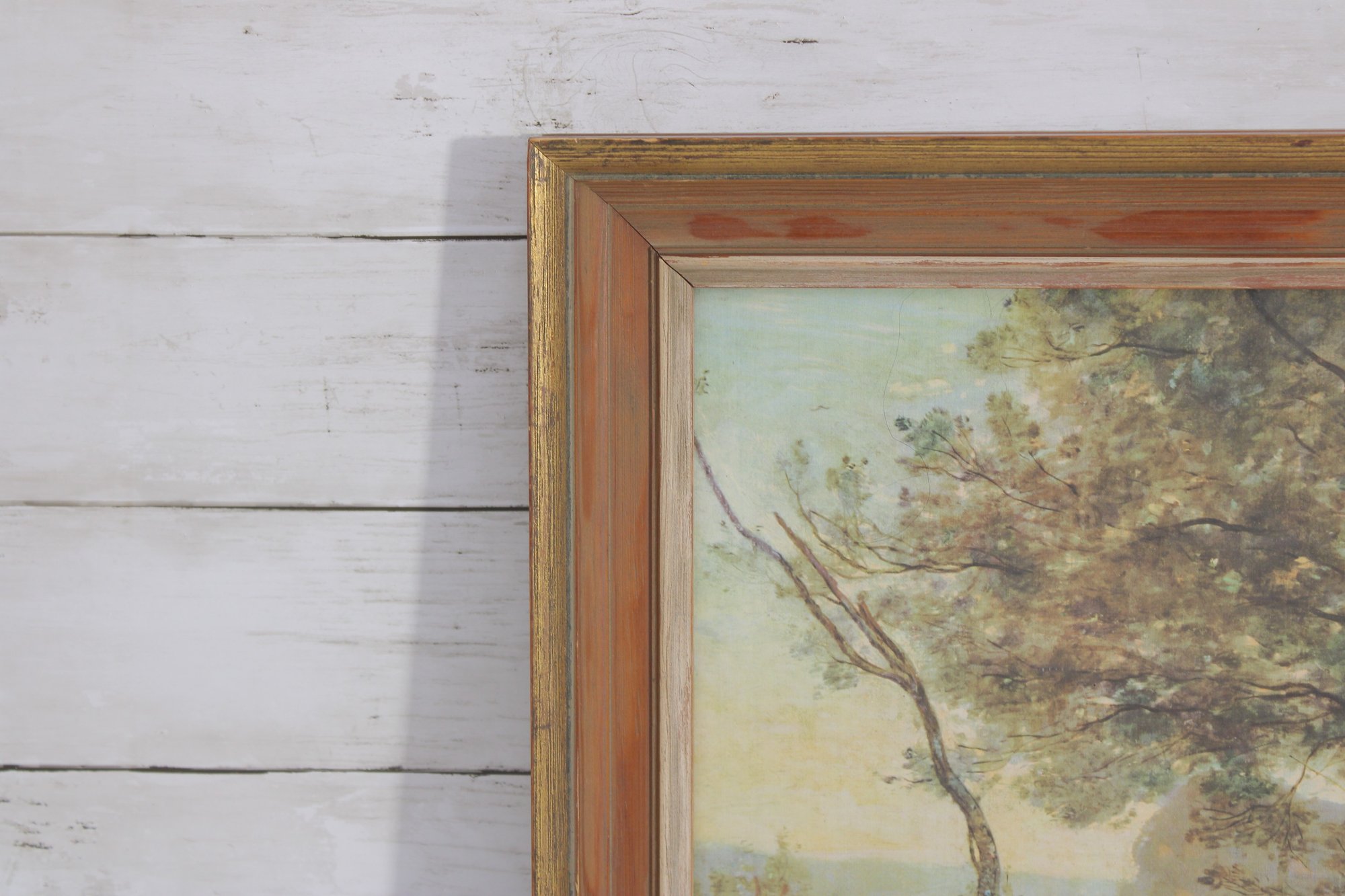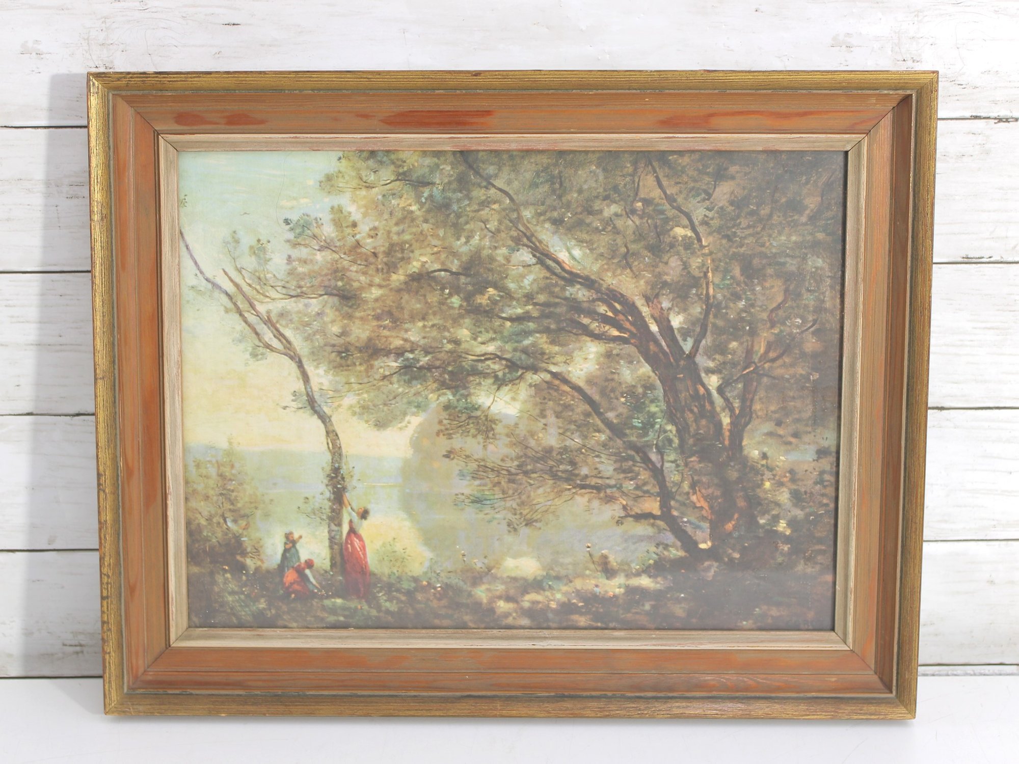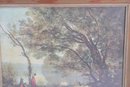 vintage framed pastoral landscape print depicting a peaceful countryside scene with figures resting near a lakeshore beneath large trees. The composition features soft earth tones and atmospheric scenery, with a woman in a red dress and companions gathered near the water’s edge.