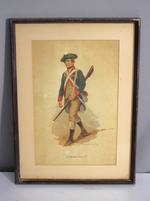 This vintage framed print depicts a historically accurate illustration of a soldier from the 2nd Maryland Infantry, 1777. The artwork, rendered with meticulous attention to detail, showcases the soldier in full Revolutionary War uniform, including a tricorn hat, musket, and traditional military attire of the period. The piece is signed by the artist, adding to its charm and historical significance.