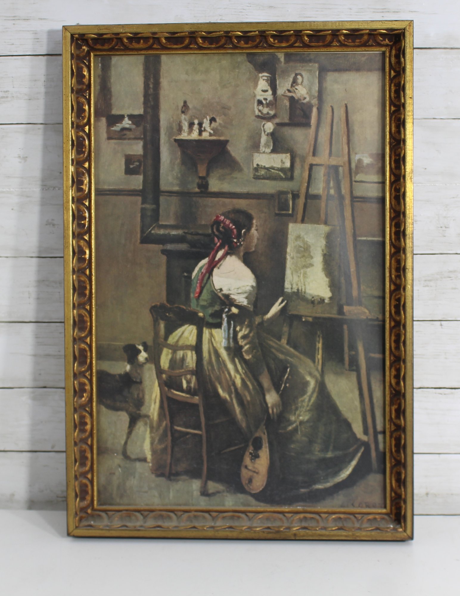 Capture timeless beauty and artistic charm with this vintage framed print depicting a woman artist at her easel, accompanied by her faithful dog. The detailed composition and warm tones evoke classic 19th-century style and make this piece a perfect accent for traditional or vintage-inspired interiors.