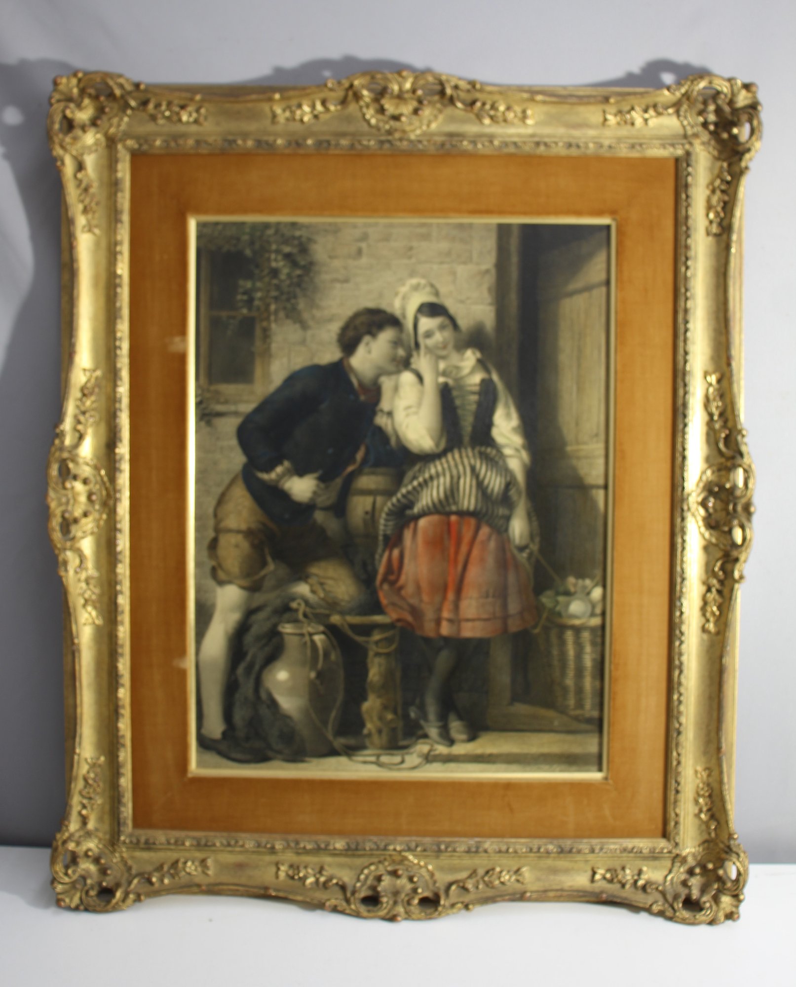 This charming vintage print captures a romantic moment between a young couple, beautifully framed in an ornate, gilded frame. The intricate details of the frame add a sense of elegance and sophistication to the piece, enhancing its nostalgic appeal. The artwork portrays a scene of intimate conversation, rendered with subtle colors that bring out the emotions of the subjects. Perfect for adding a touch of romance and vintage charm to any room. Frame shows some wear consistent with age, but the overall piece remains a stunning decorative item.