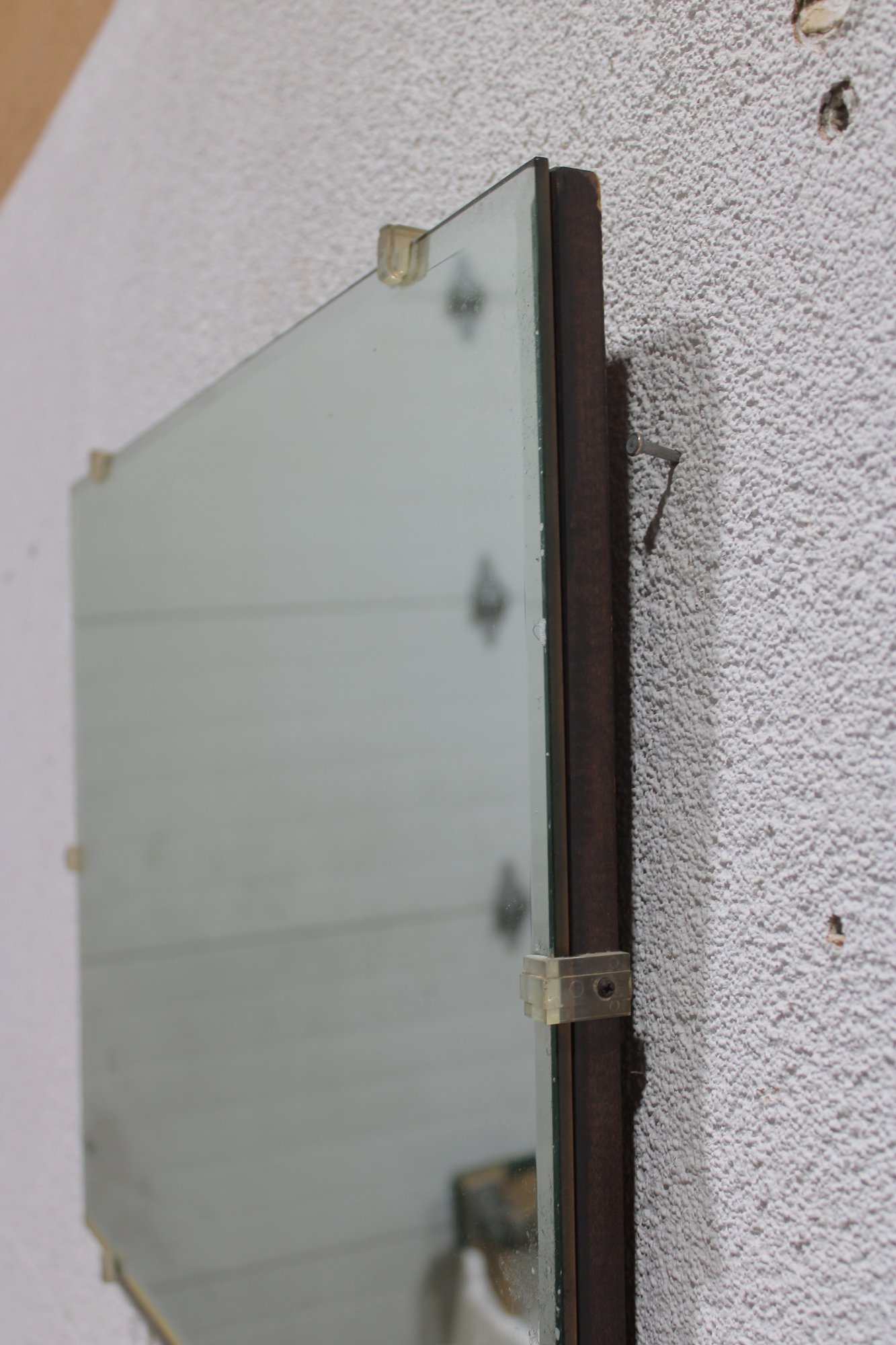 The mirror is mounted on a solid wood backing and includes attached hanging wire for easy wall installation (see photos). The exposed brass mounting clips add subtle character and vintage charm while maintaining a sleek profile.