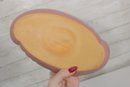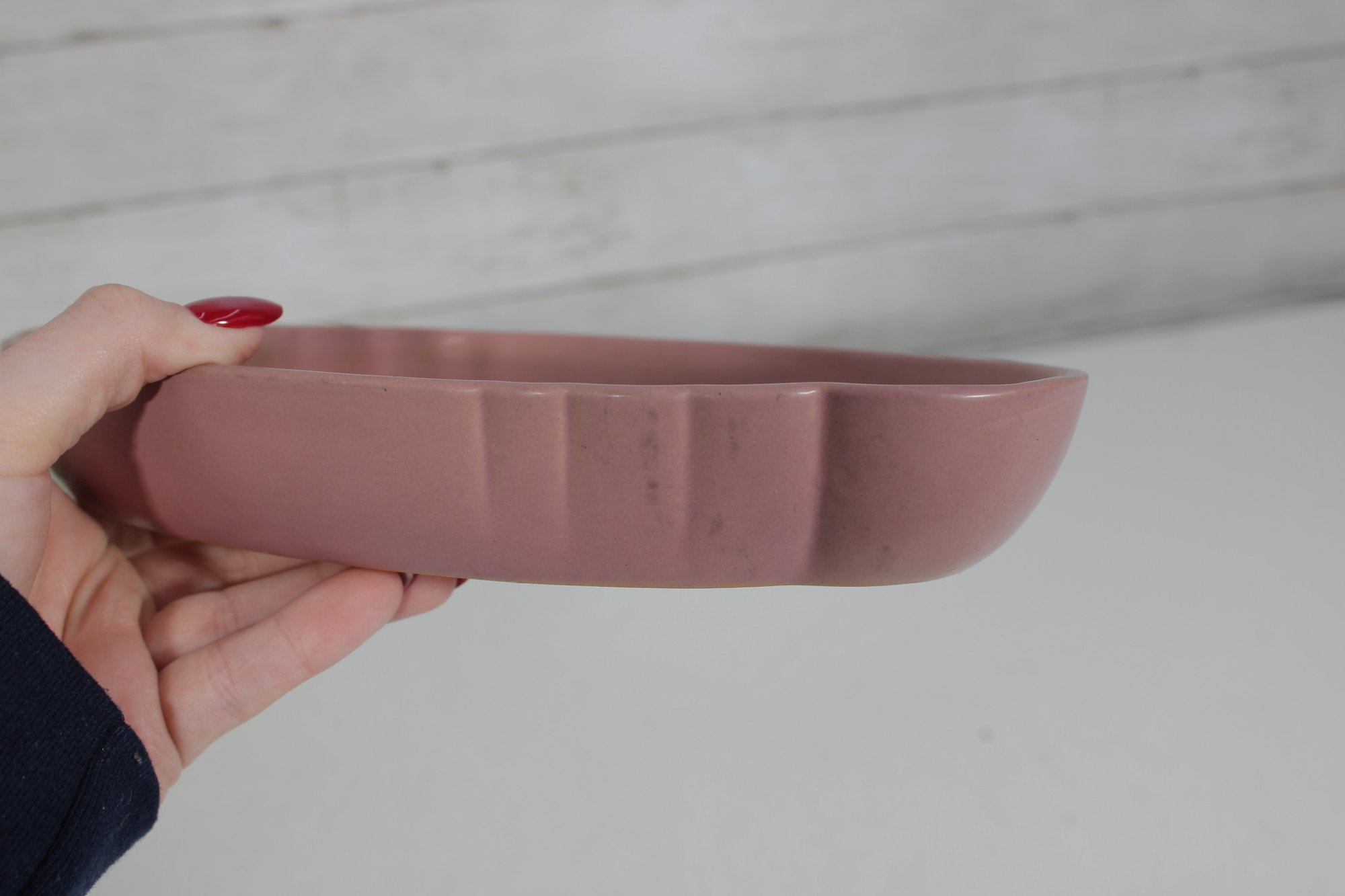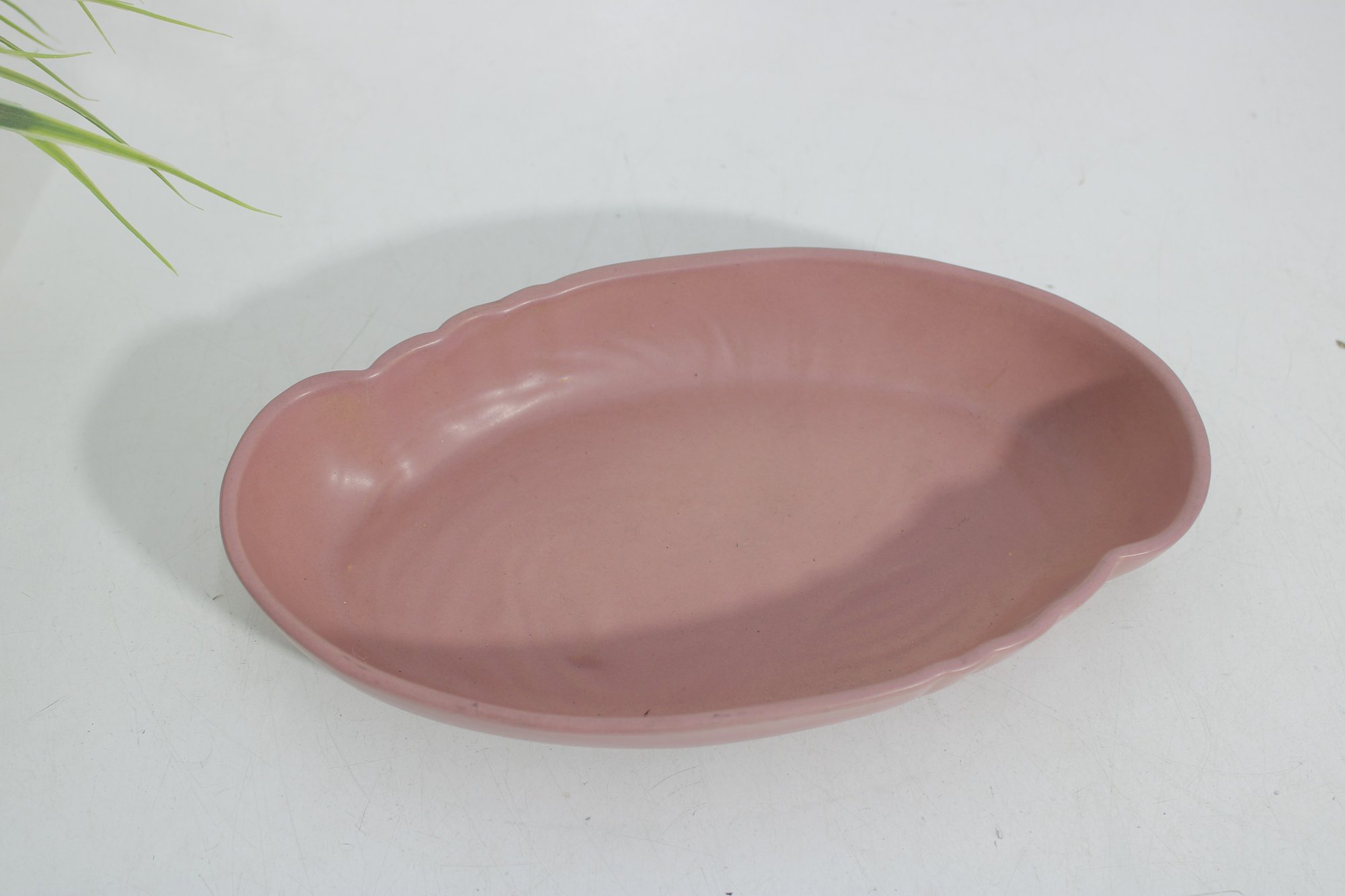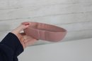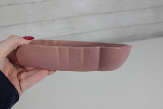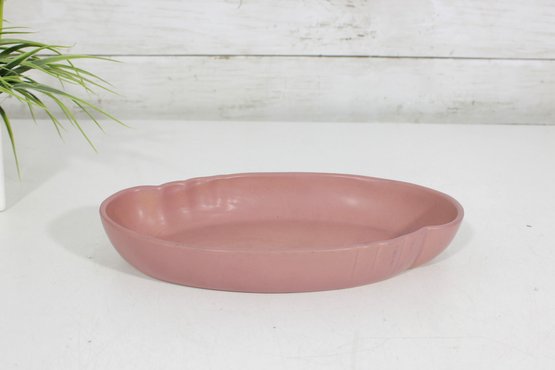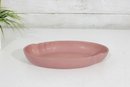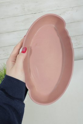 vintage Frankoma Pottery oval serving dish, showcasing a soft pink glaze and classic mid-century design. Measuring approximately 10 inches long by 6 inches wide, this piece features a gently scalloped rim and a solid, well-crafted form typical of Frankoma ceramics.