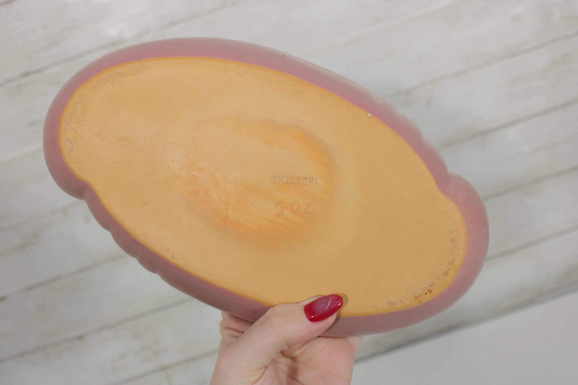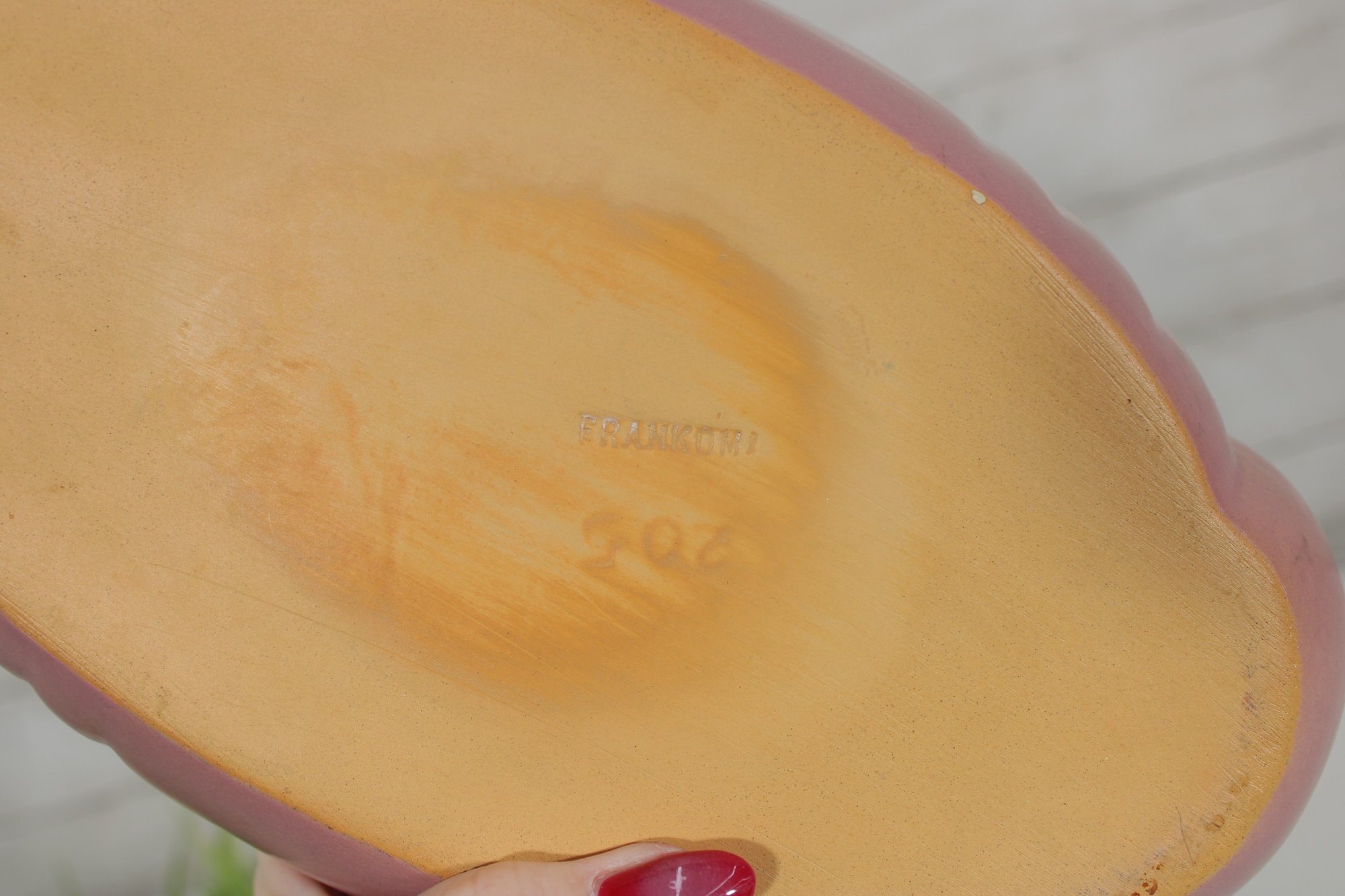 The underside displays the impressed Frankoma mark along with the mold number, confirming its authenticity. The warm clay base and matte glaze give it a distinctive look that blends both rustic and modern aesthetics.