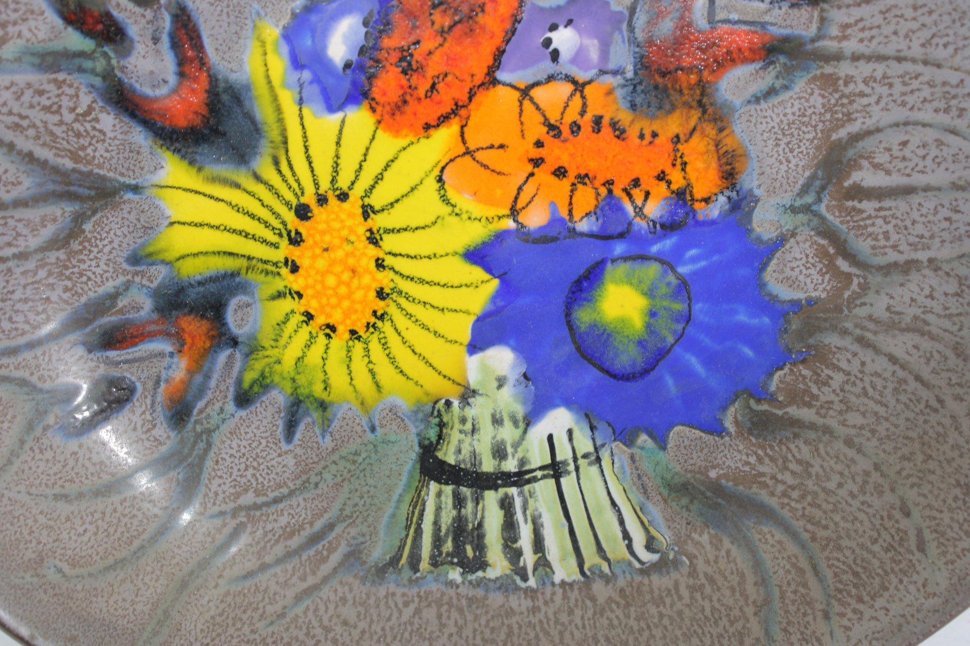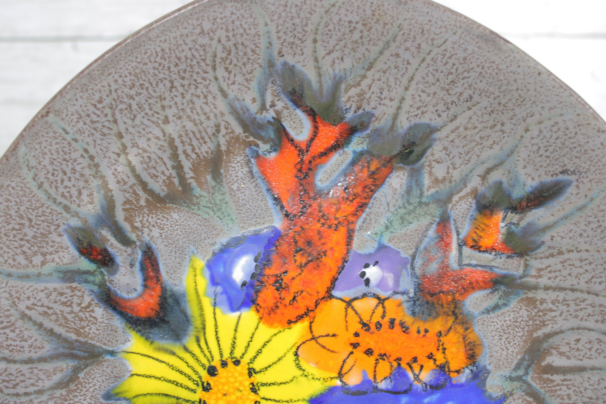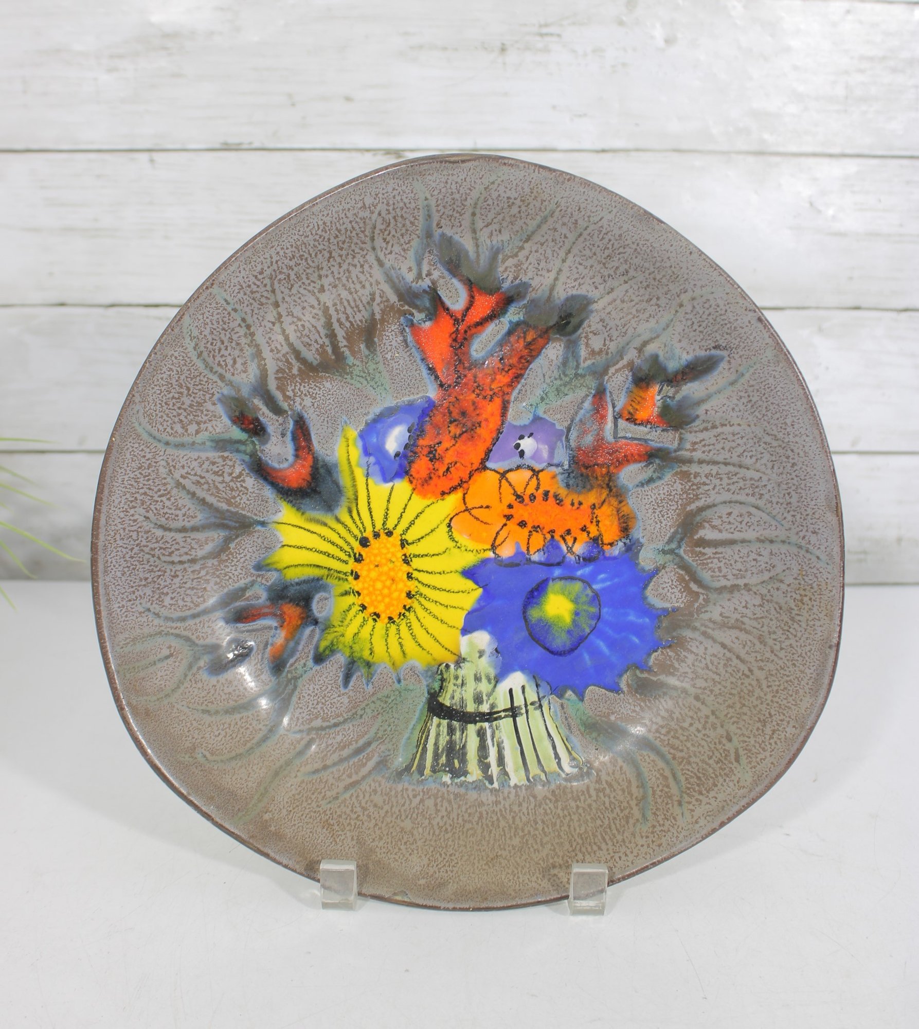 Beautiful vintage French decorative bowl featuring a striking abstract enameled floral design. The interior showcases a vibrant bouquet motif in bold colors including yellow, orange, blue, and purple, set against a textured neutral background with artistic drip-style enamel effects.