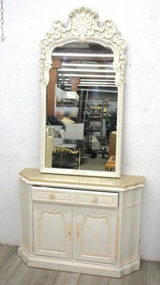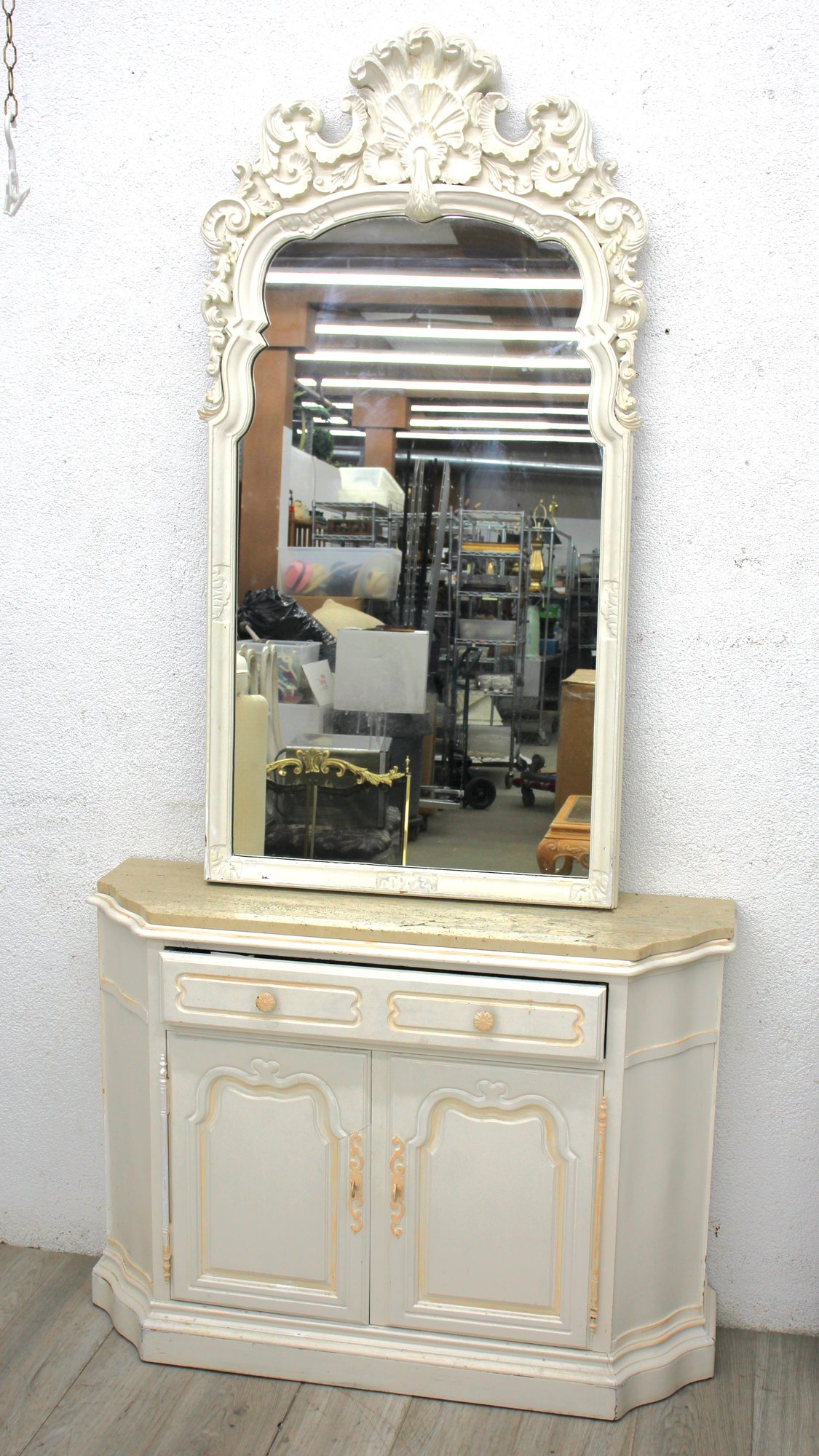 This elegant vintage French Provincial console set features a beautifully crafted marble top console with an ornate matching mirror. The console is painted in a soft, distressed white finish with light gold accents that highlight its intricate details, adding a timeless charm. The top is made of polished marble, offering both durability and a sophisticated touch.