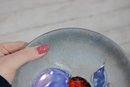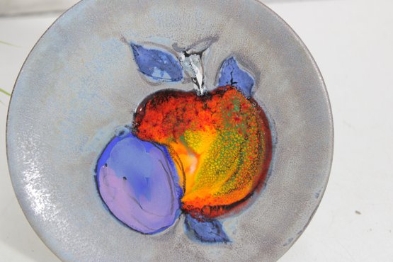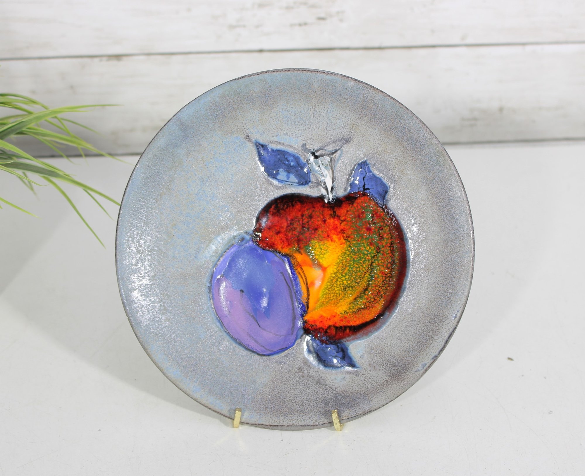 French studio art pottery plate featuring a bold modernist fruit design. Hand-painted in vivid, expressive colors, the composition showcases stylized fruit—likely an apple and plum—set against a textured, matte gray ground.