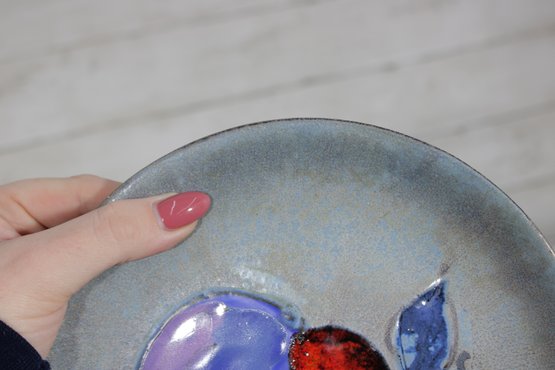 This 8-inch plate highlights the unique character of studio pottery, with rich glaze work, dimensional detailing, and an artistic, almost abstract interpretation of the subject. The vibrant reds, oranges, purples, and blues contrast beautifully with the subdued background, making this piece a standout display item.
