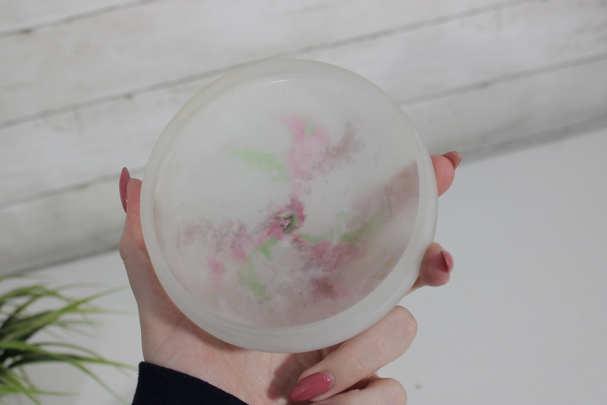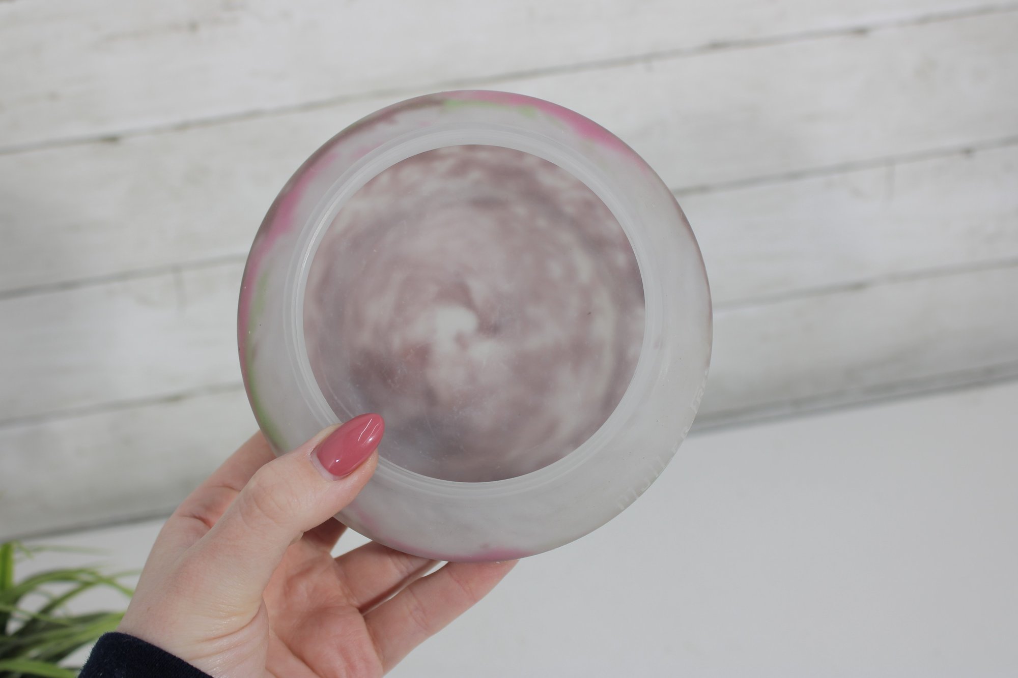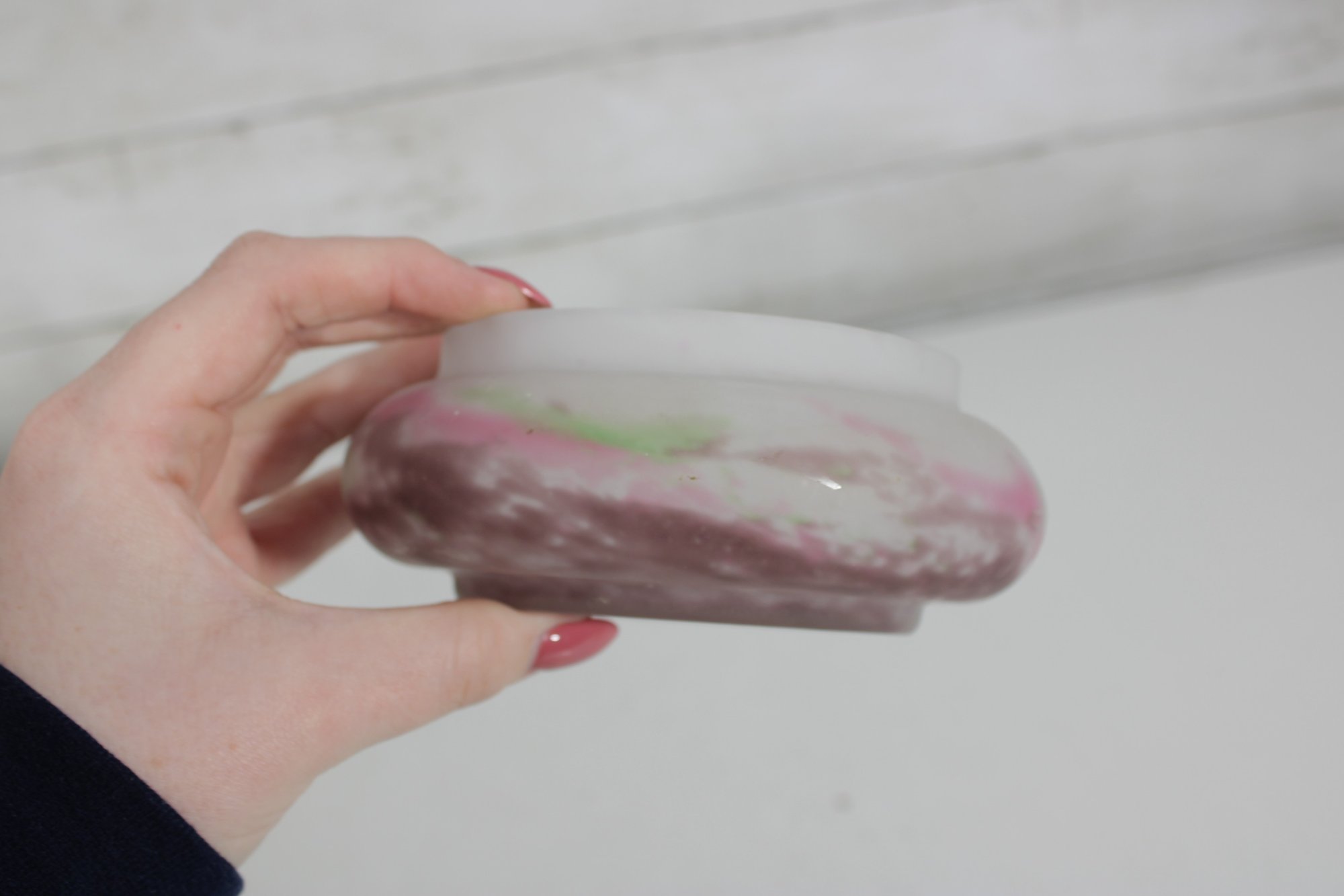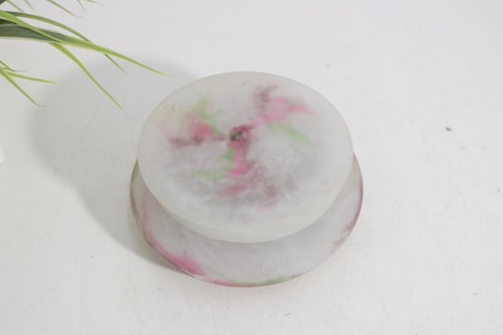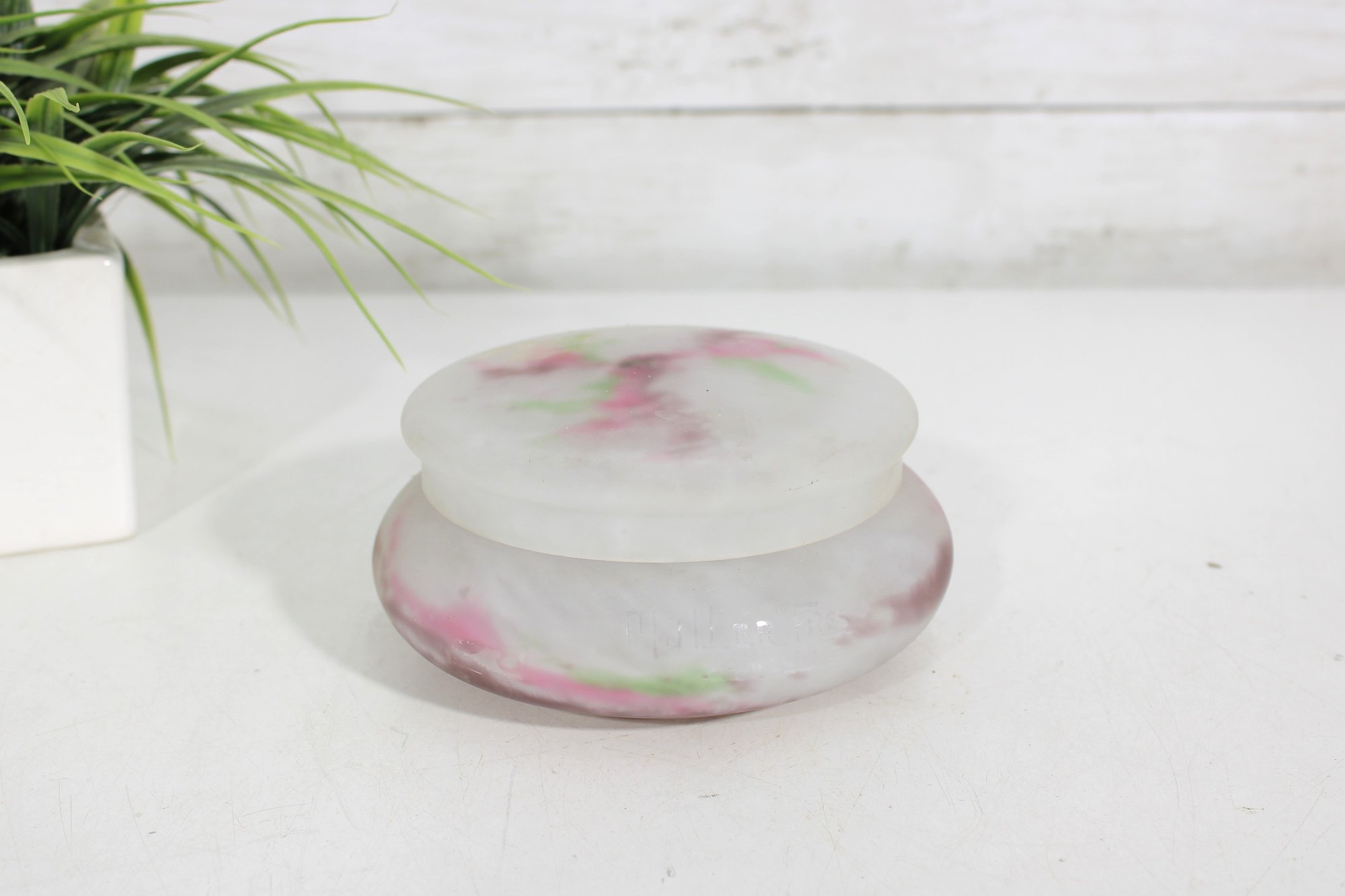 Lovely vintage frosted art glass trinket box featuring a soft, dreamy mottled design in pink and green tones. This elegant piece measures approximately 5 inches in diameter and about 3 inches tall, with a rounded body and matching fitted lid.