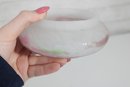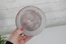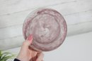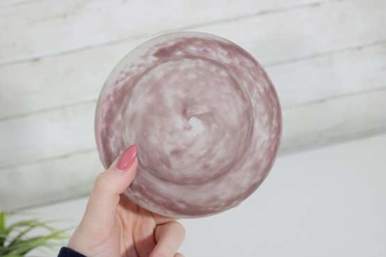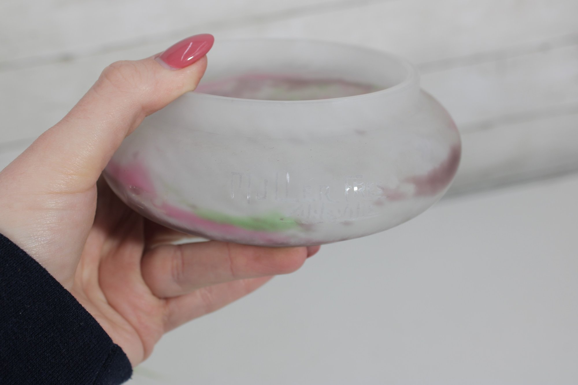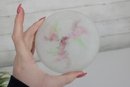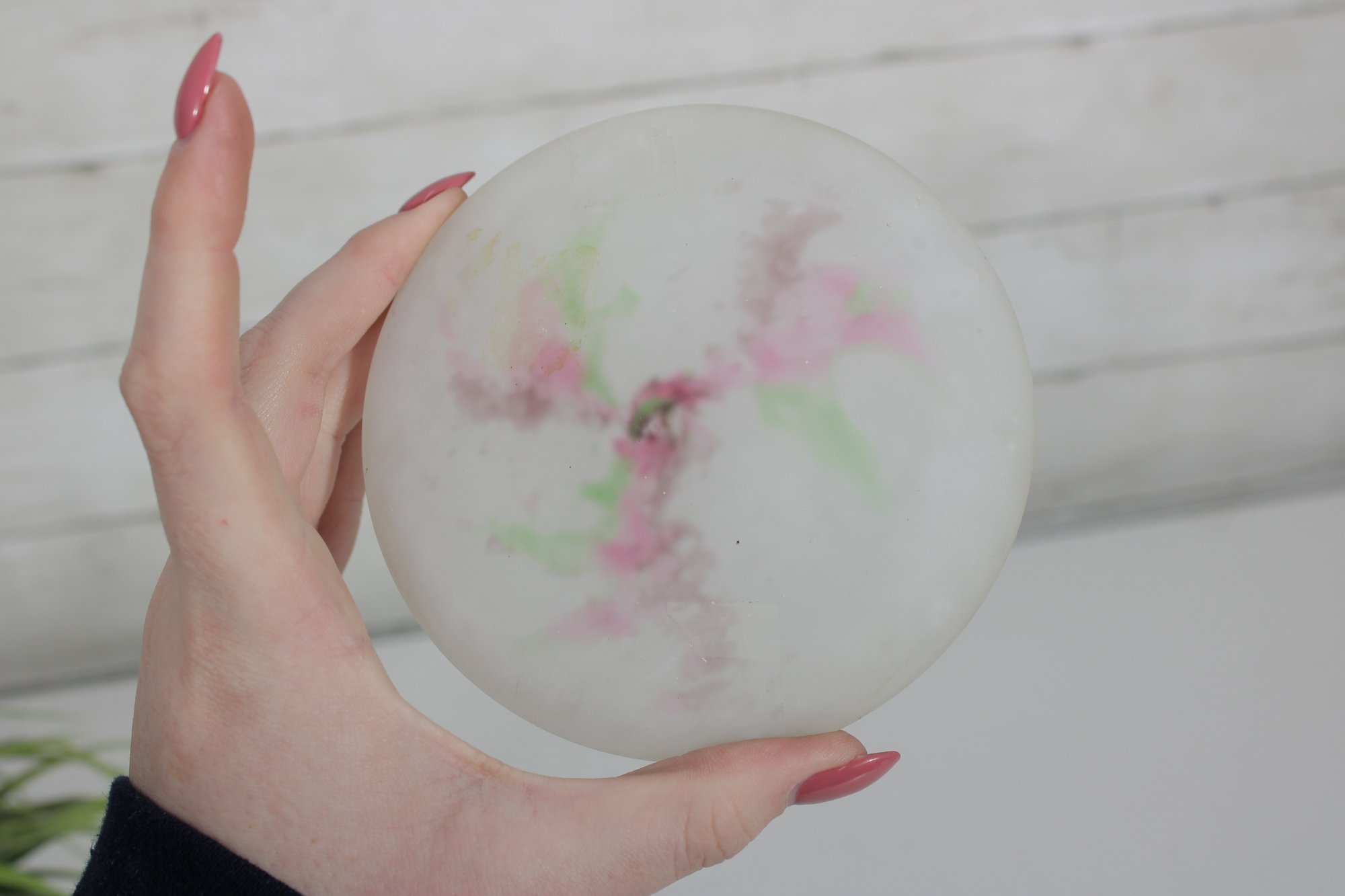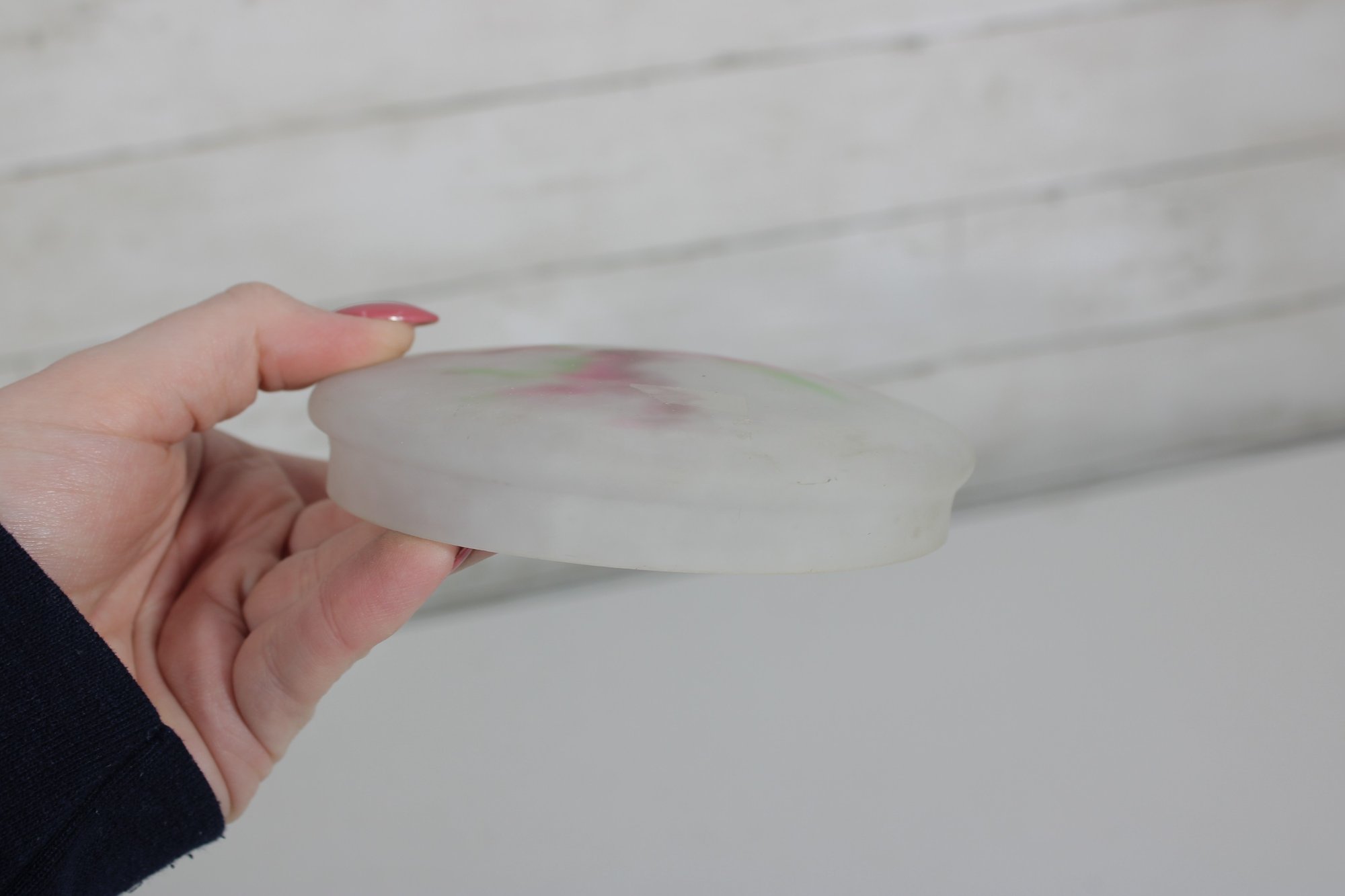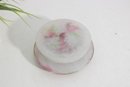 Lovely vintage frosted art glass trinket box featuring a soft, dreamy mottled design in pink and green tones. This elegant piece measures approximately 5 inches in diameter and about 3 inches tall, with a rounded body and matching fitted lid.