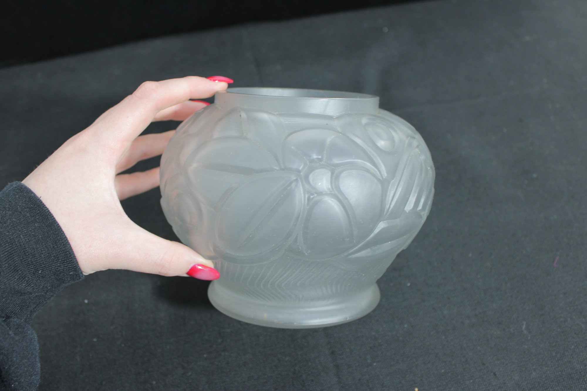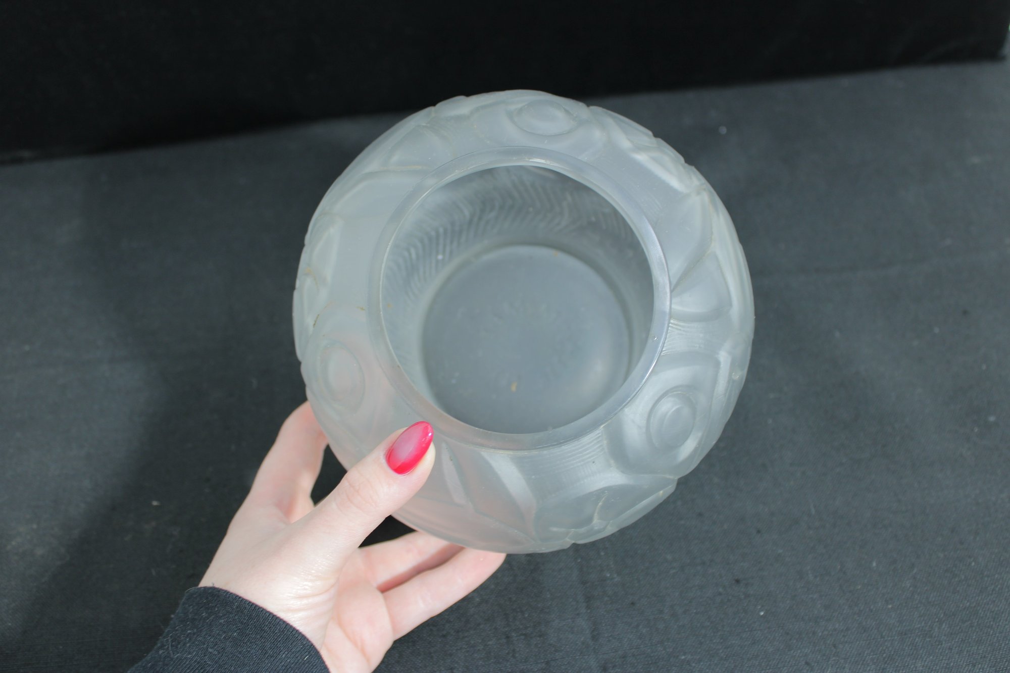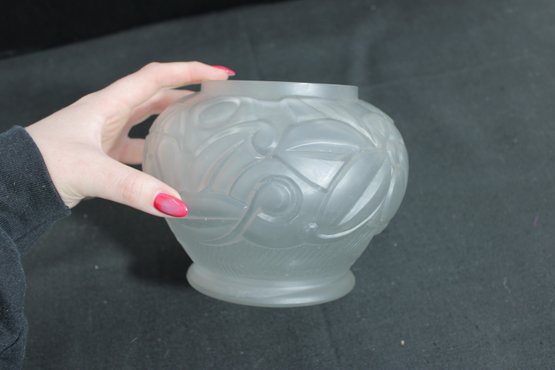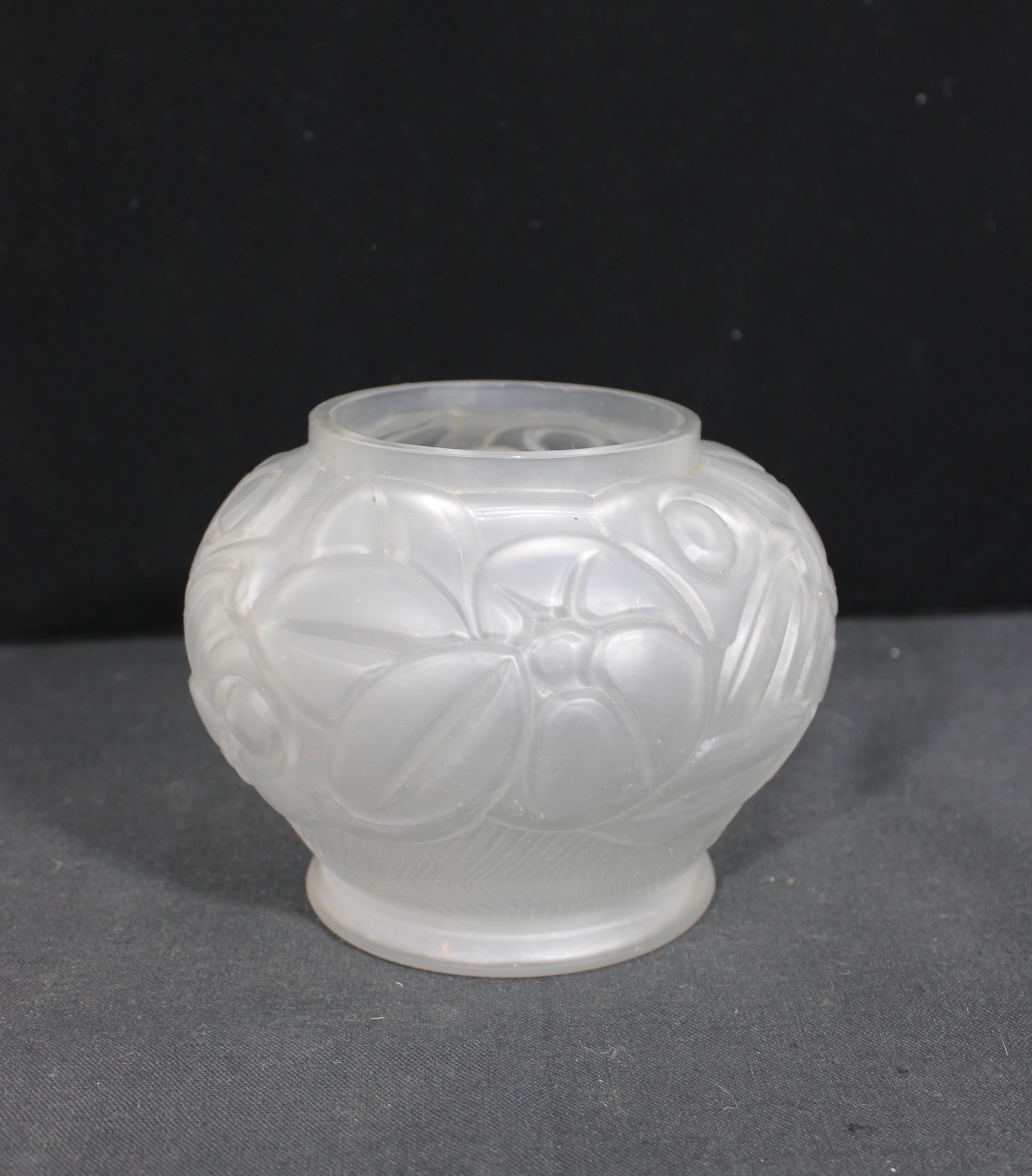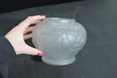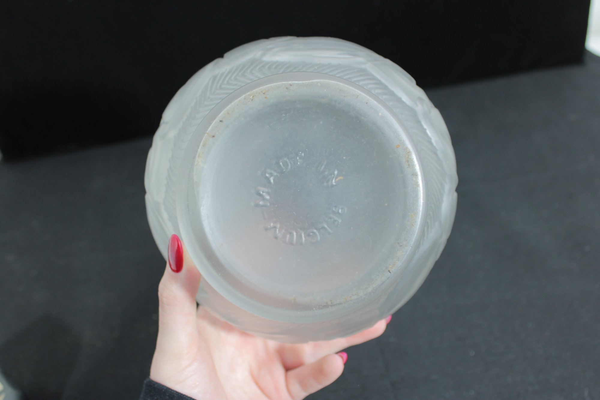 Charming vintage art glass vase crafted in Belgium, featuring a beautifully frosted finish and raised floral motif. This piece has a soft, satin-like surface with an elegant rounded form, making it a versatile decorative accent for any space.