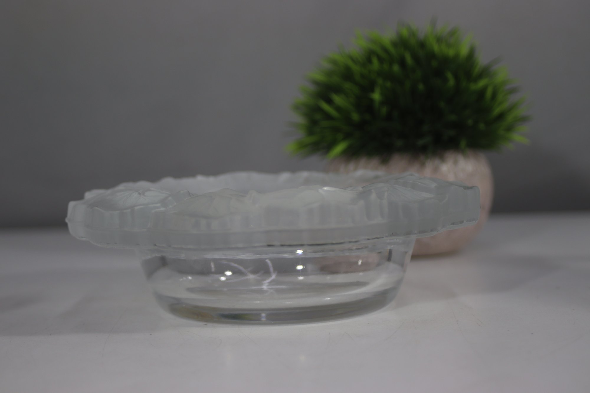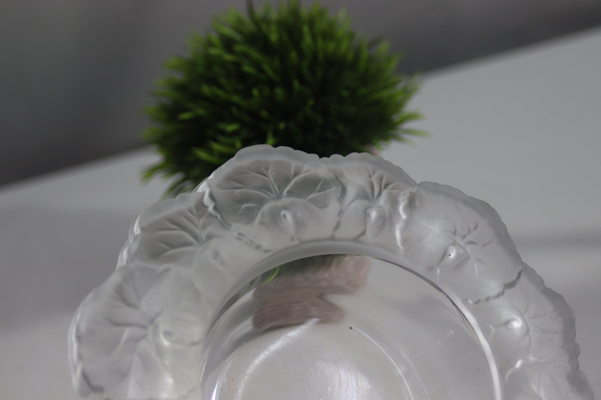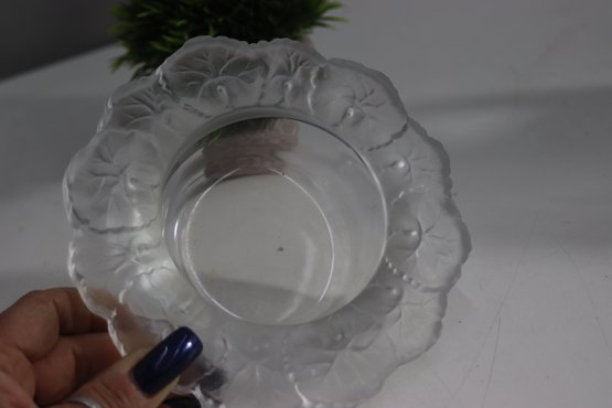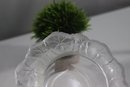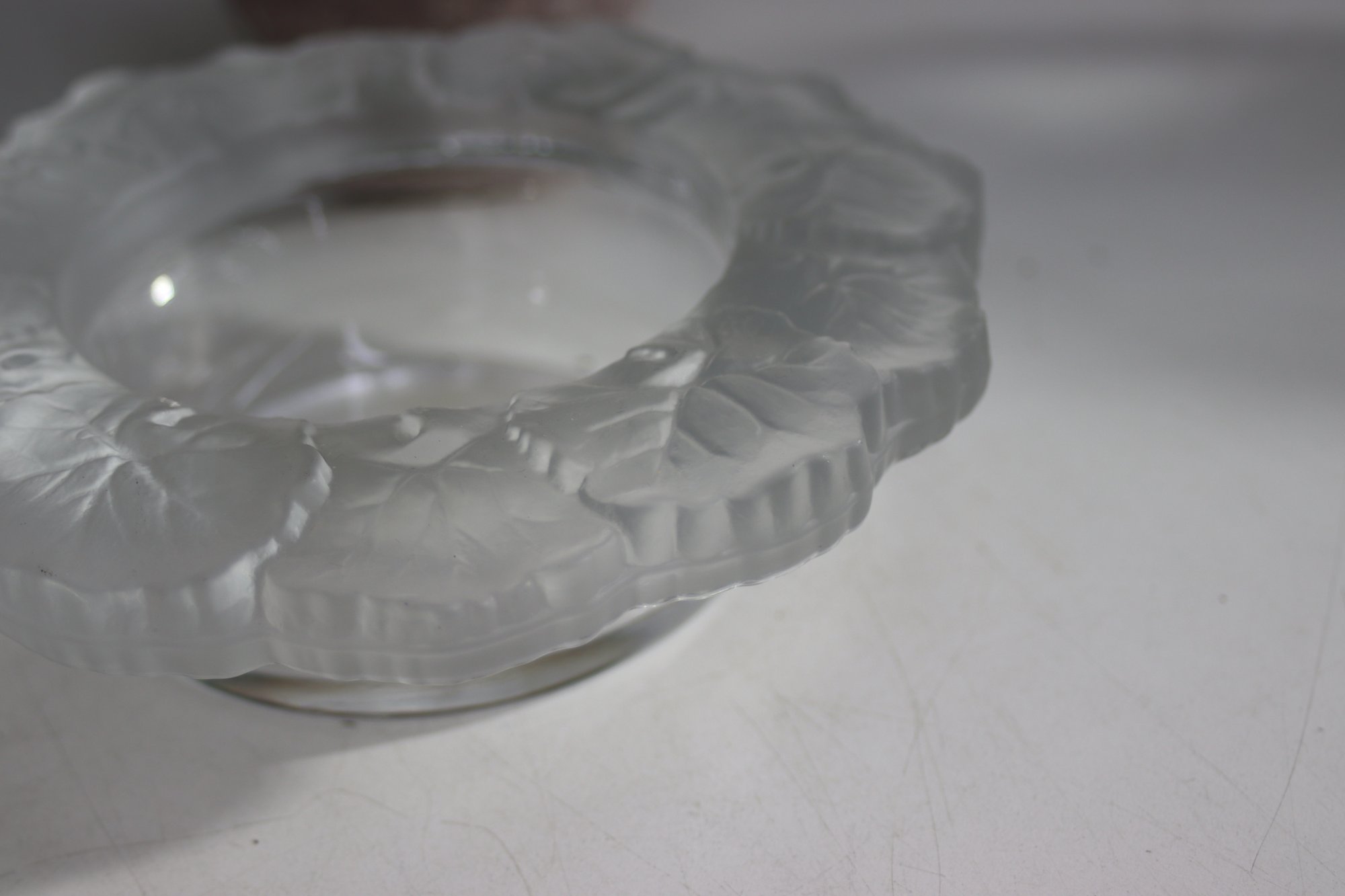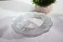 vintage frosted glass ashtray features an elegant floral motif etched into its wide rim. The intricate design adds a touch of sophistication, making it a great addition to any collection or decor setup. The clear center provides contrast to the textured outer rim, creating a classic and timeless look. Perfect for use as an ashtray, trinket dish, or decorative accent piece.