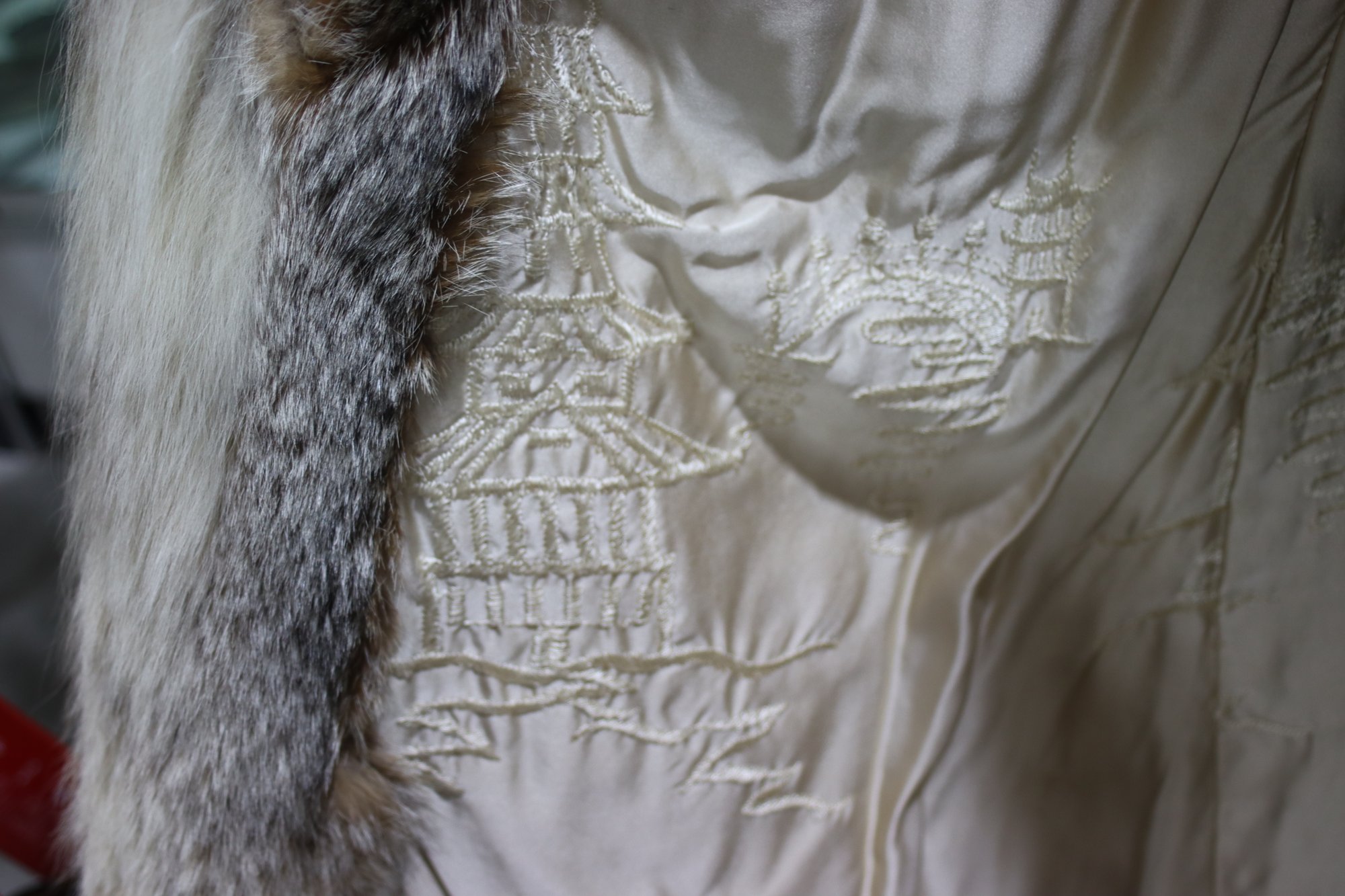 Silky satin embroidered lining featuring intricate Asian-inspired designs