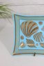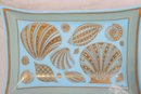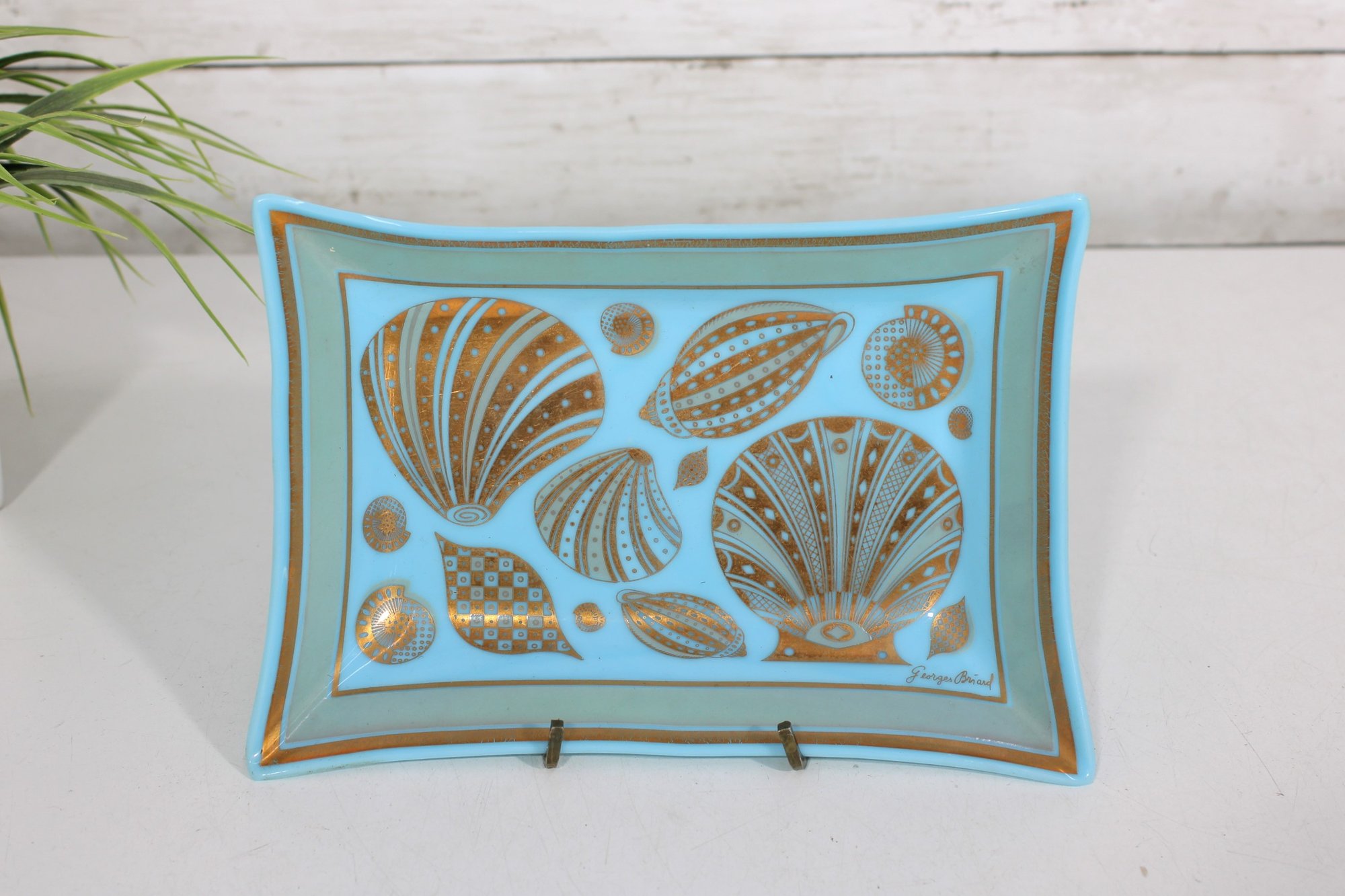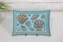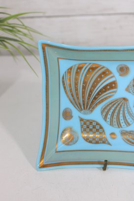 Beautiful vintage mid-century modern glass tray designed by Georges Briard, featuring an elegant gold seashell motif on a vibrant blue background. This rectangular dish measures approximately 7.5" x 5.5" and showcases a variety of stylized seashells in Briard’s signature metallic gold detailing.