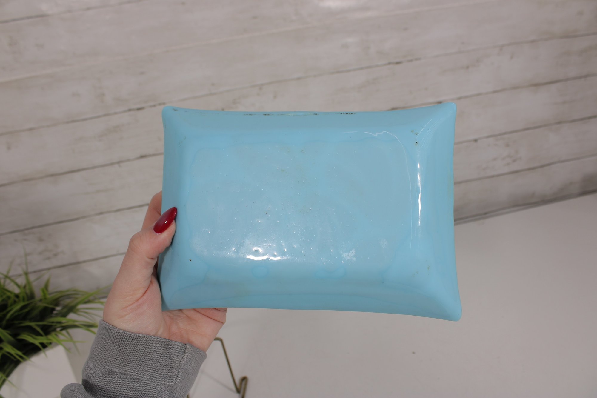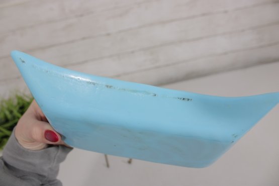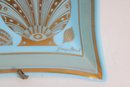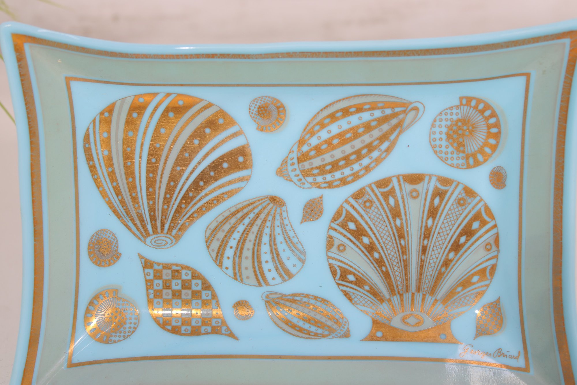 The rich turquoise-blue glass combined with the intricate gold design creates a striking coastal-inspired aesthetic, perfect for display, serving small items, or adding a touch of retro sophistication to your décor. The piece is signed “George Briard” on the front, confirming its authenticity and collectible appeal.