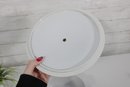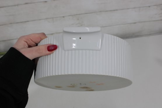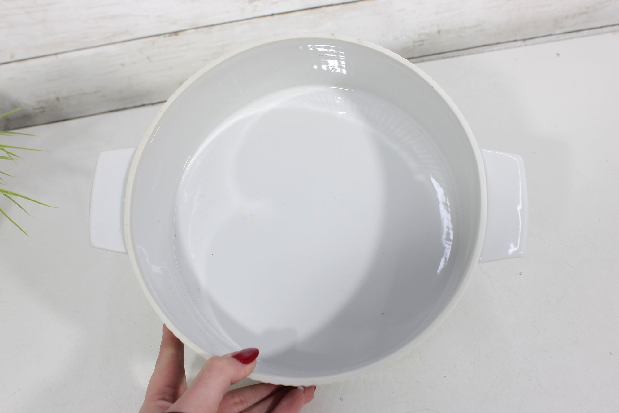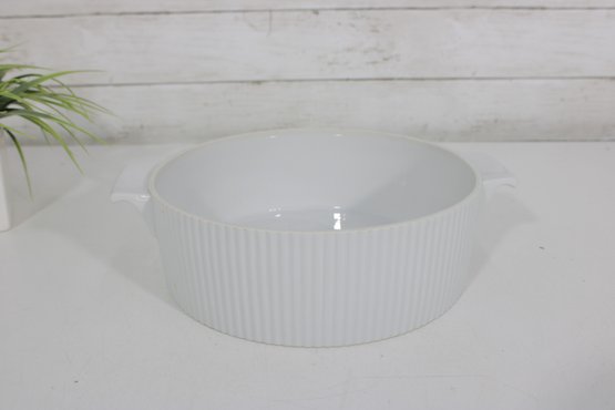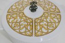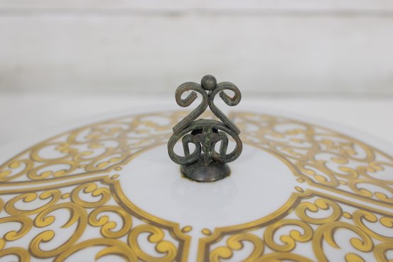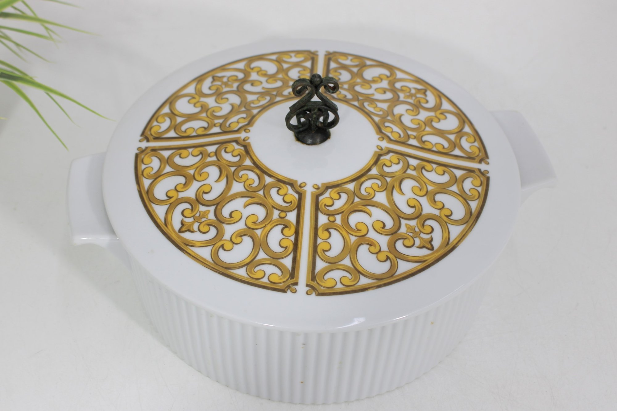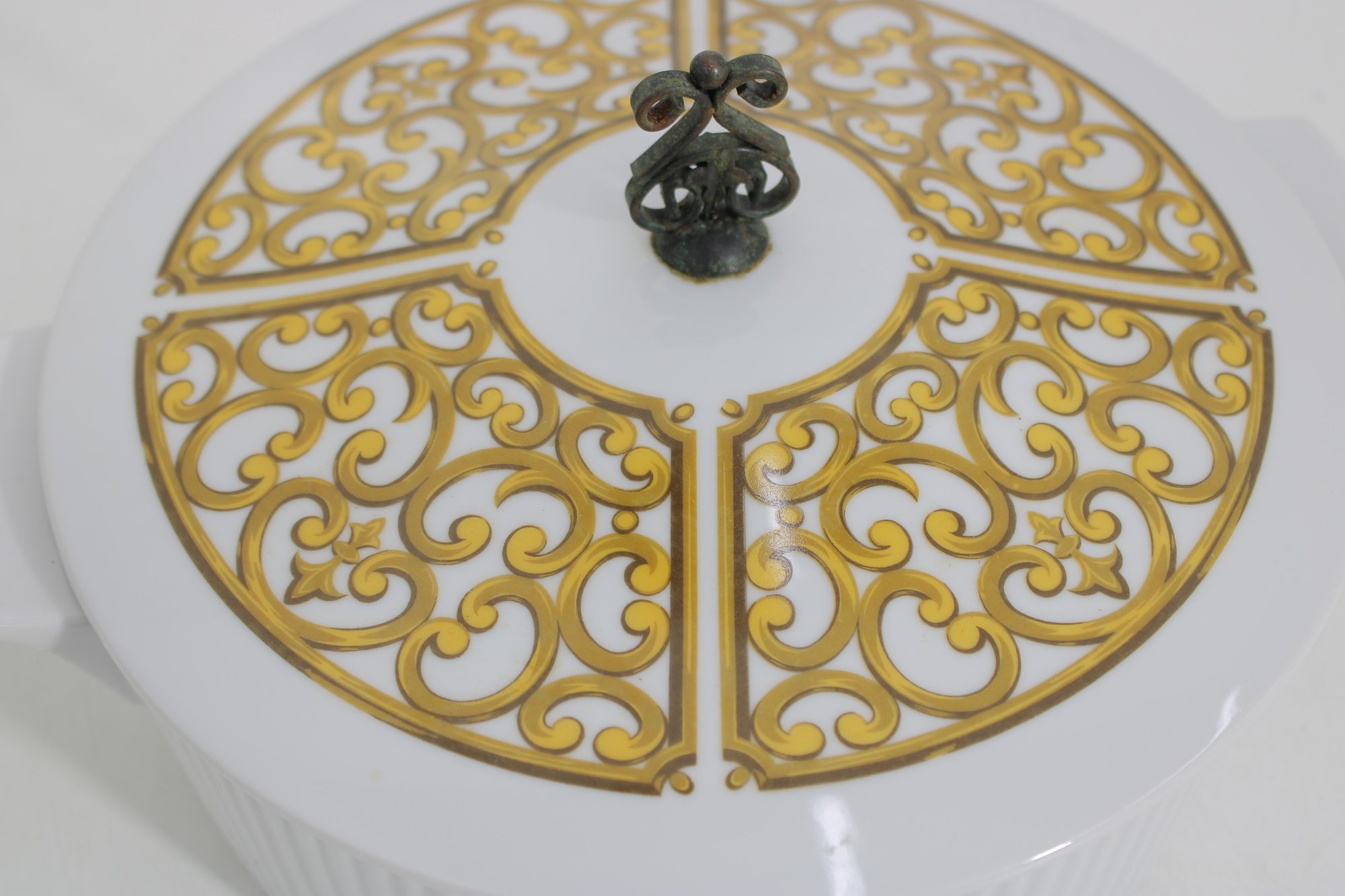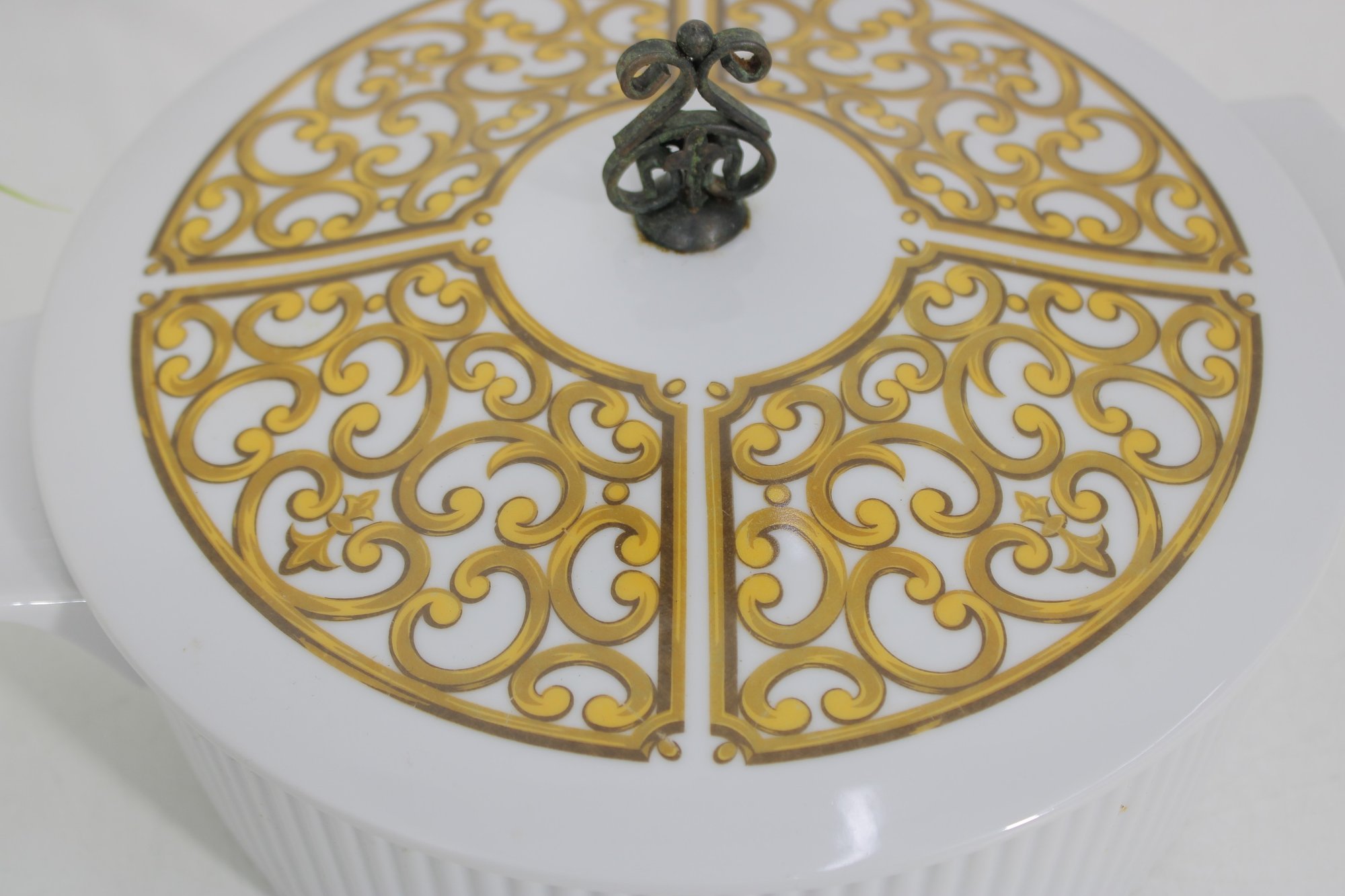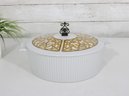 This round dish measures approximately 9.5 inches in diameter and has a clean white ribbed body paired with a decorative lid divided into four panels of intricate gold patterning. The lid is topped with a unique metal scroll handle, adding both charm and functionality.