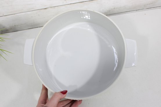 vintage Georges Briard covered baking dish, featuring an elegant gold scroll motif on the lid—classic of mid-century modern design.