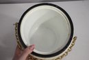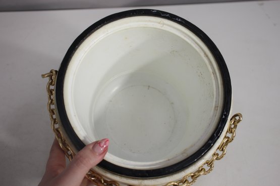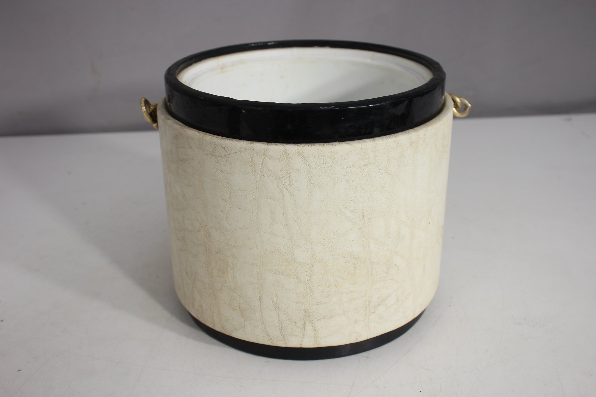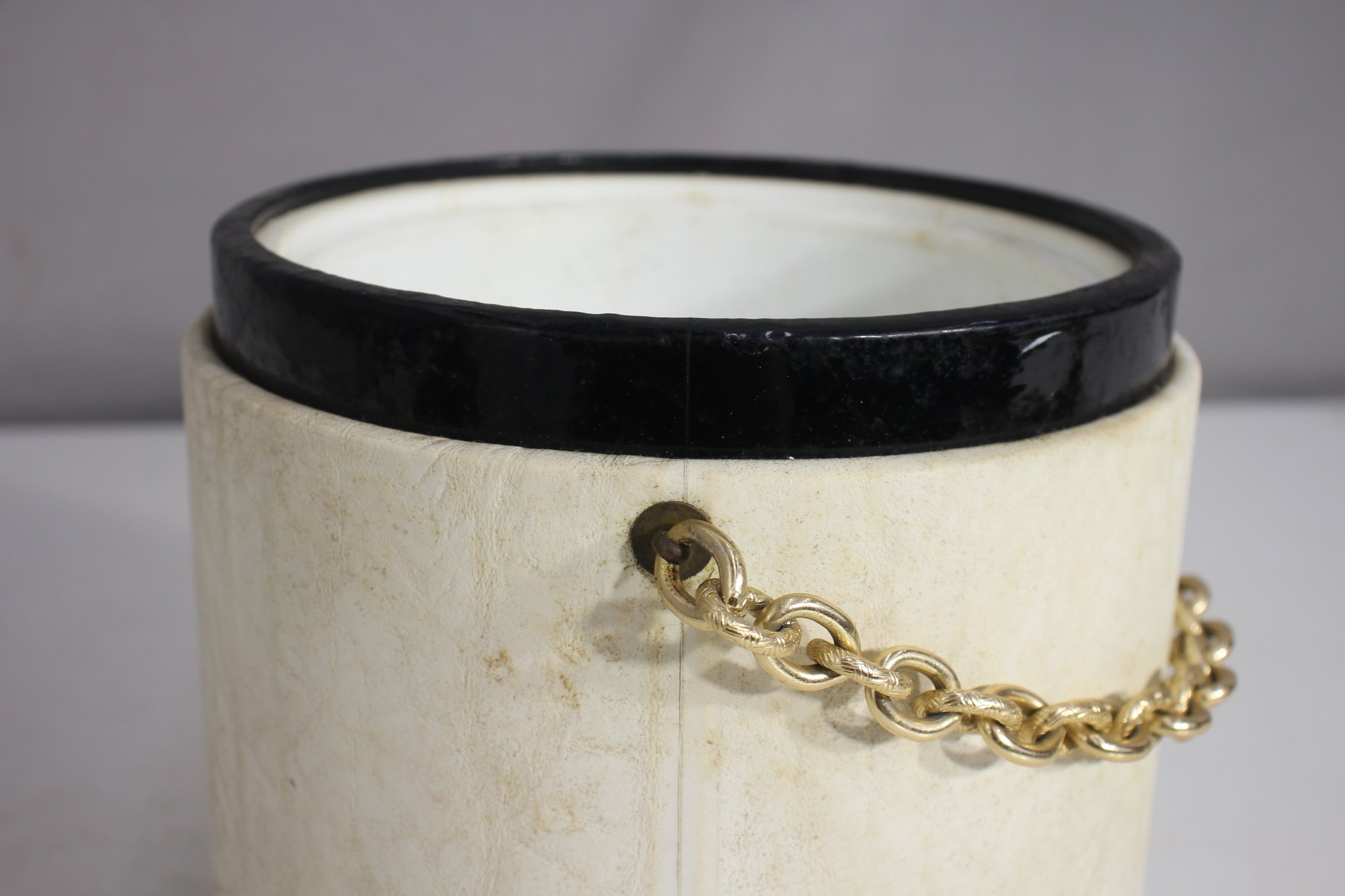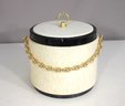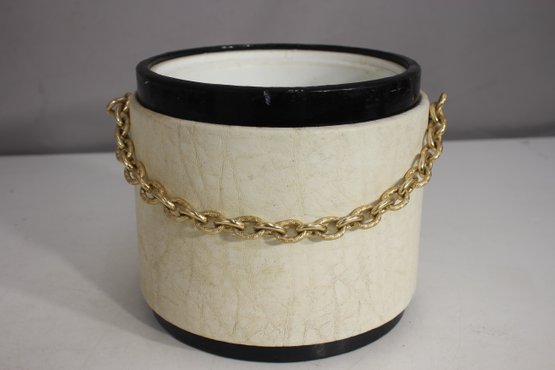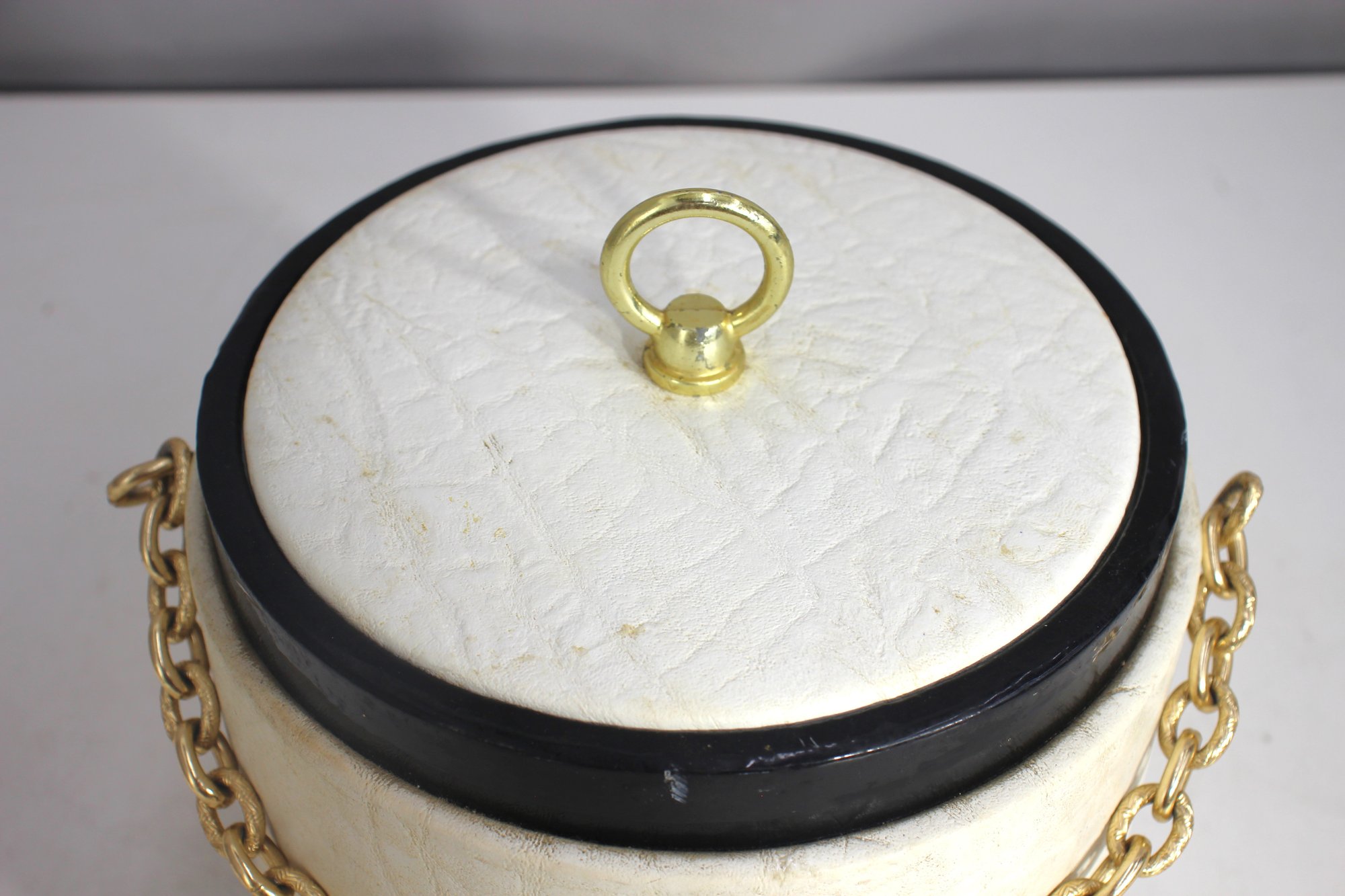 This vintage Georges Briard ice bucket is a stylish mid-century modern piece, measuring 7 inches in height and 8 inches in diameter. It features a cream-colored faux-leather textured exterior, accented with black trim and a gold-tone chain handle for a touch of elegance. The round lid has a gold-tone loop handle, making it easy to open and close.