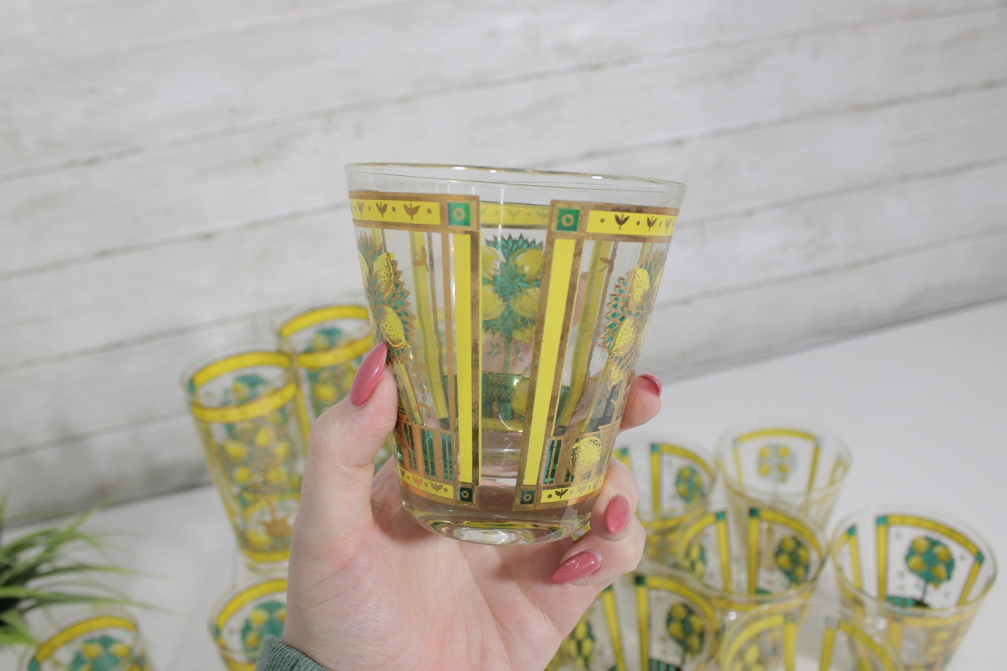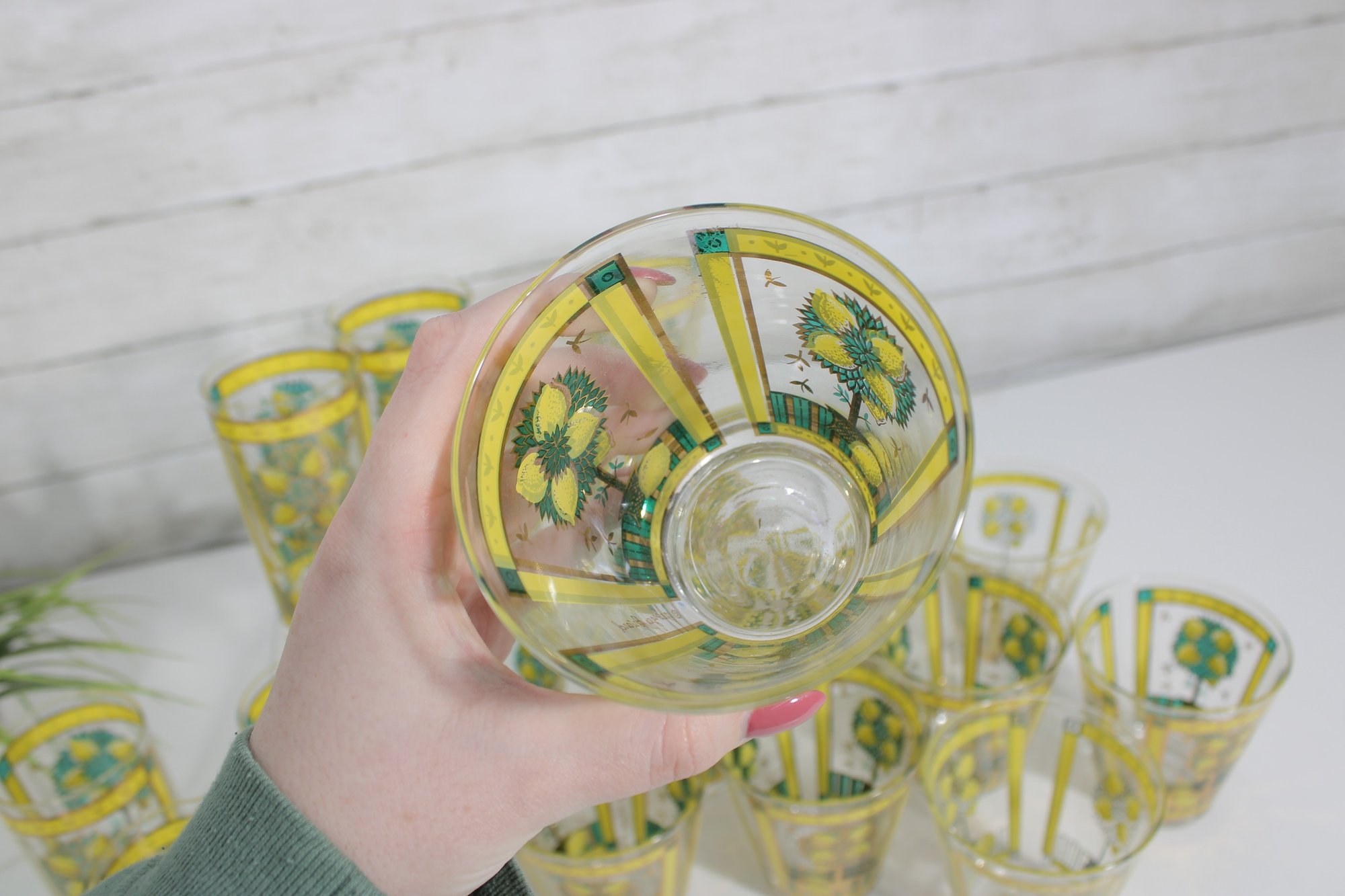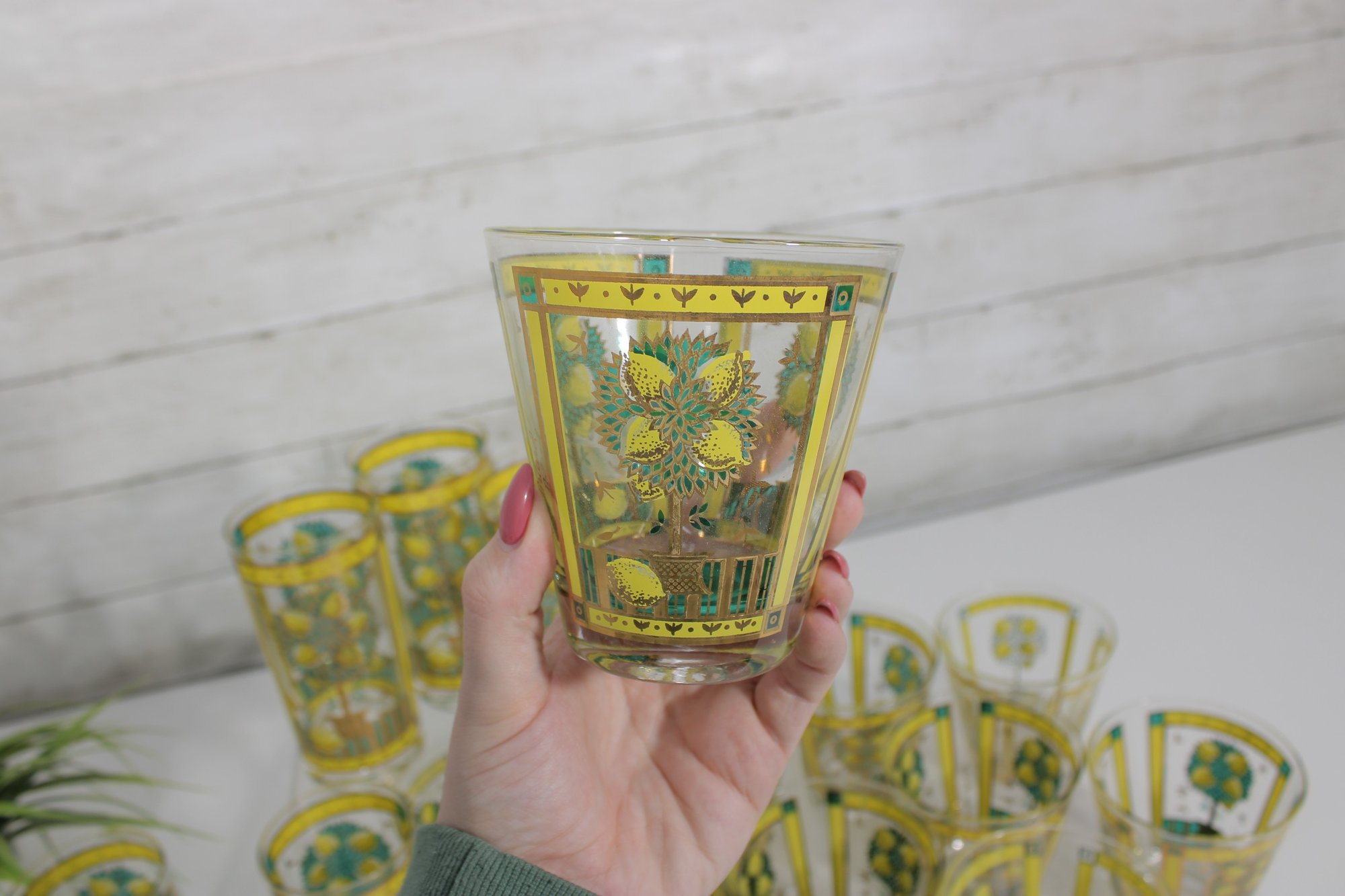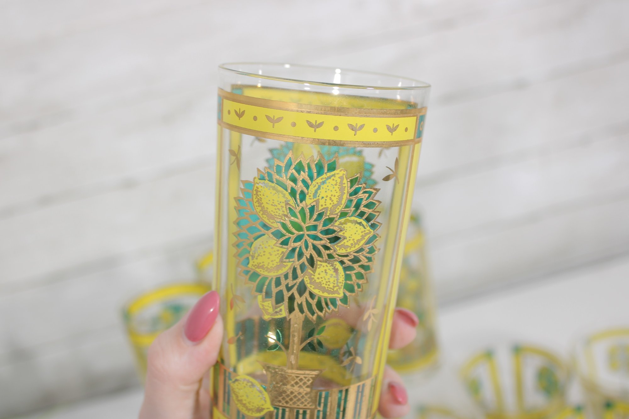 Vibrant and highly collectible vintage barware set featuring the iconic Georges Briard “Lemon Tree” pattern. This cheerful design showcases bright yellow lemons, green leaves, and decorative accents with gold detailing—perfectly capturing mid-century modern style.