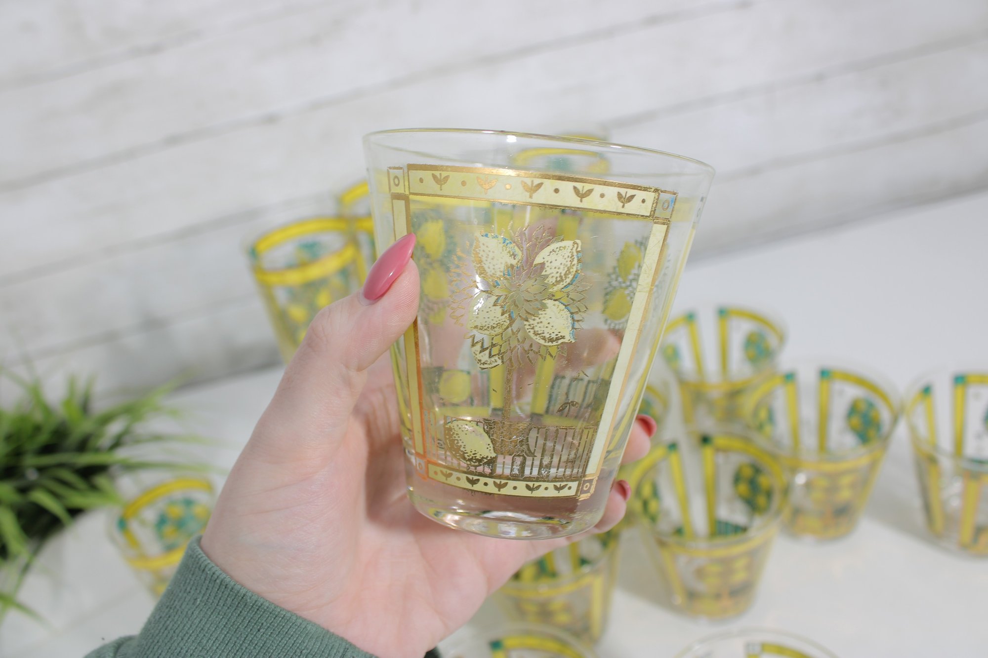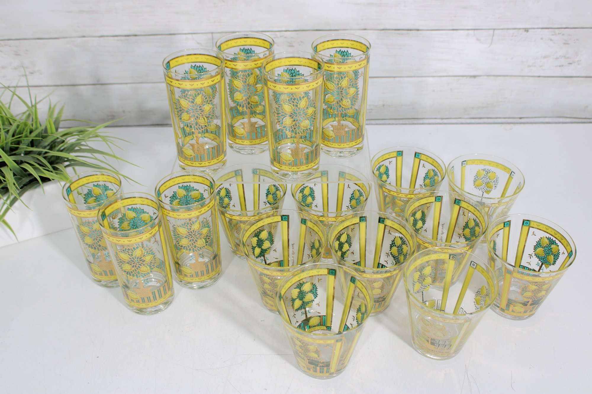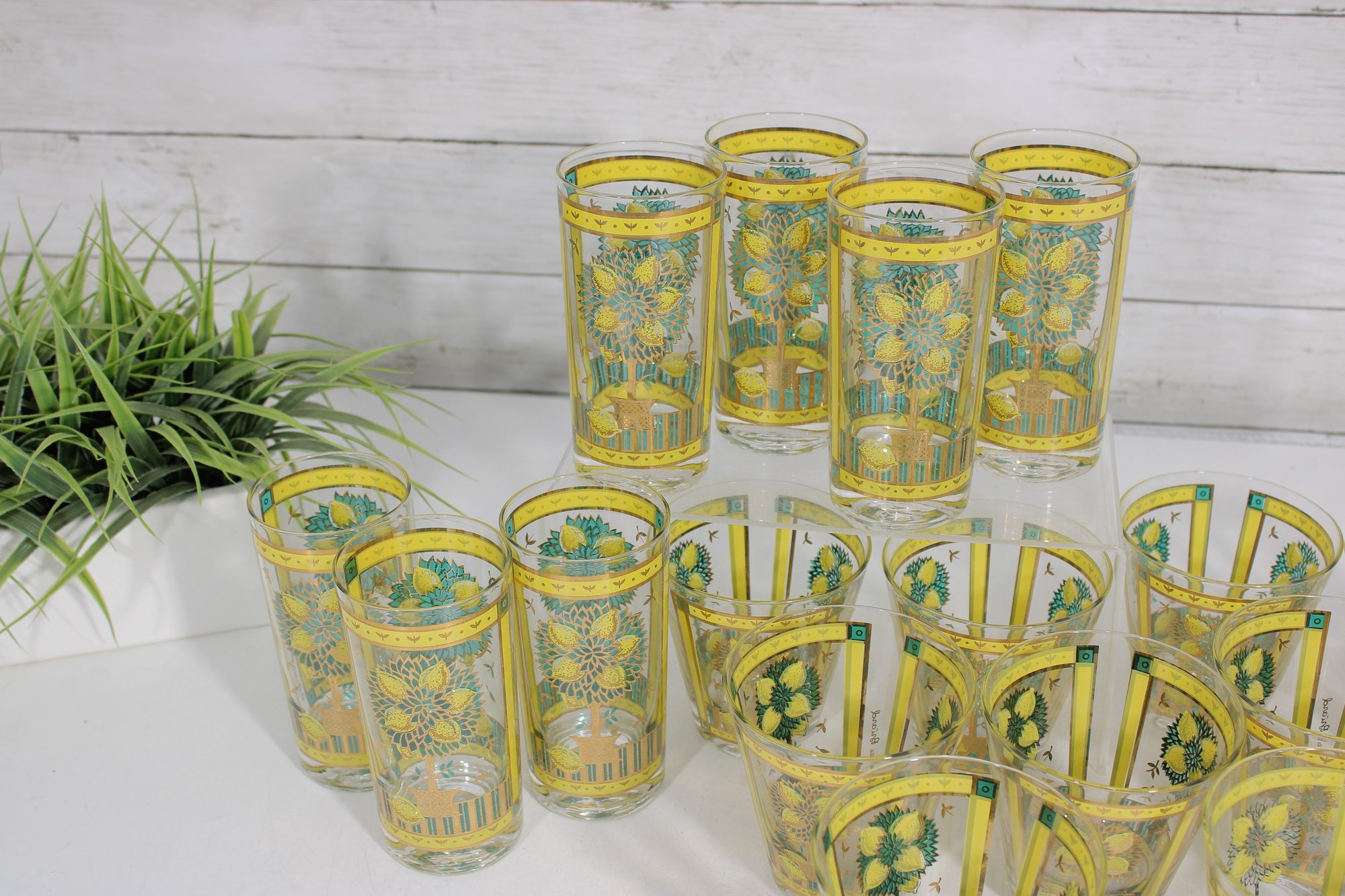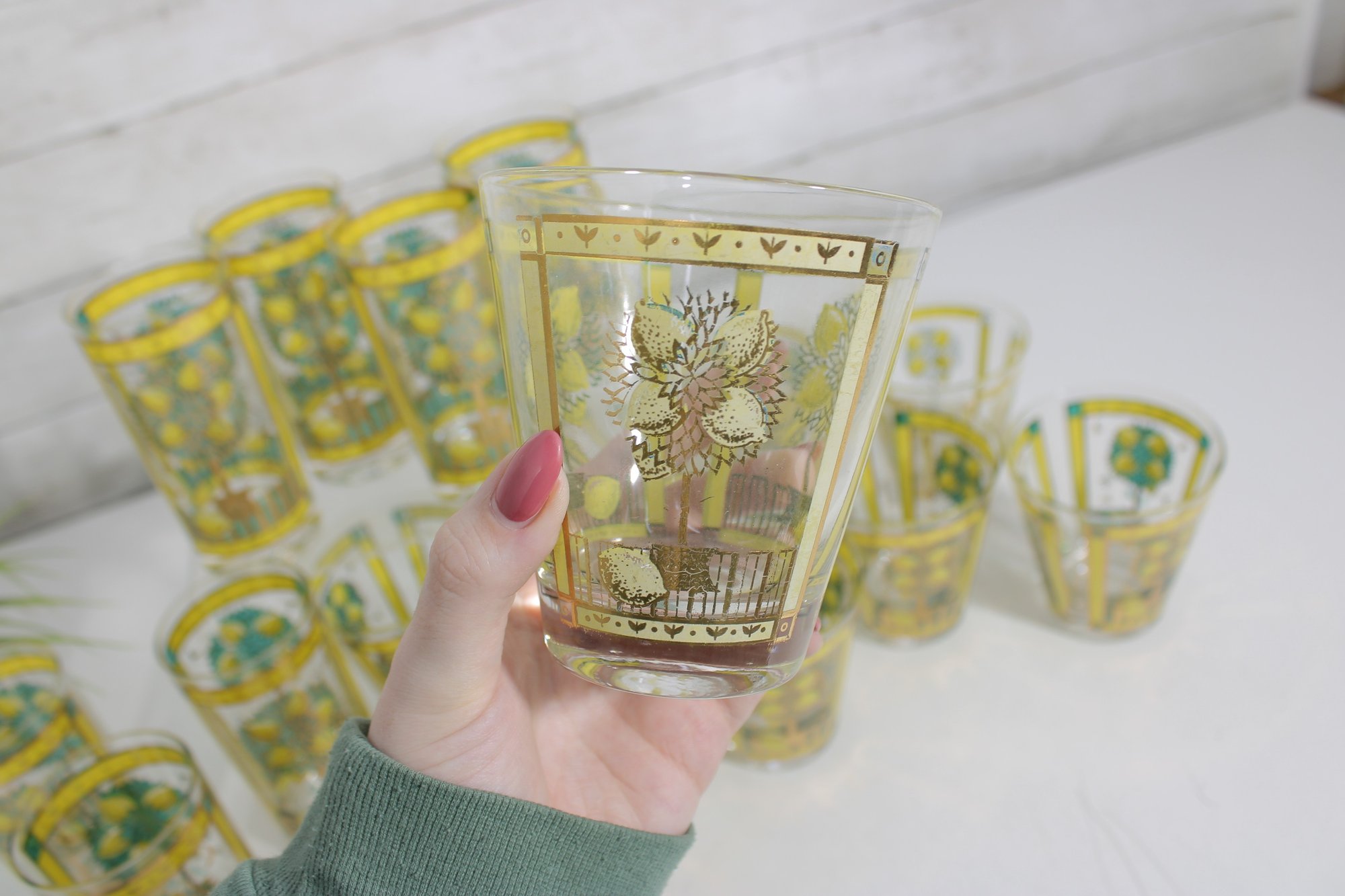 Vibrant and highly collectible vintage barware set featuring the iconic Georges Briard “Lemon Tree” pattern. This cheerful design showcases bright yellow lemons, green leaves, and decorative accents with gold detailing—perfectly capturing mid-century modern style.