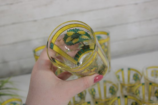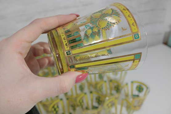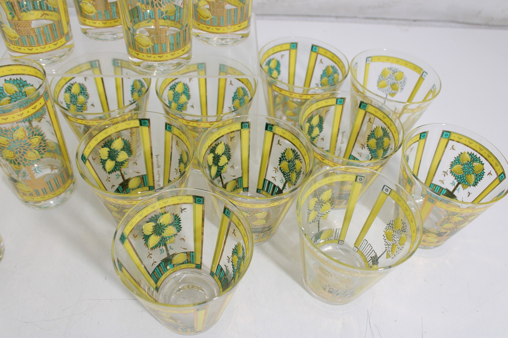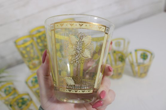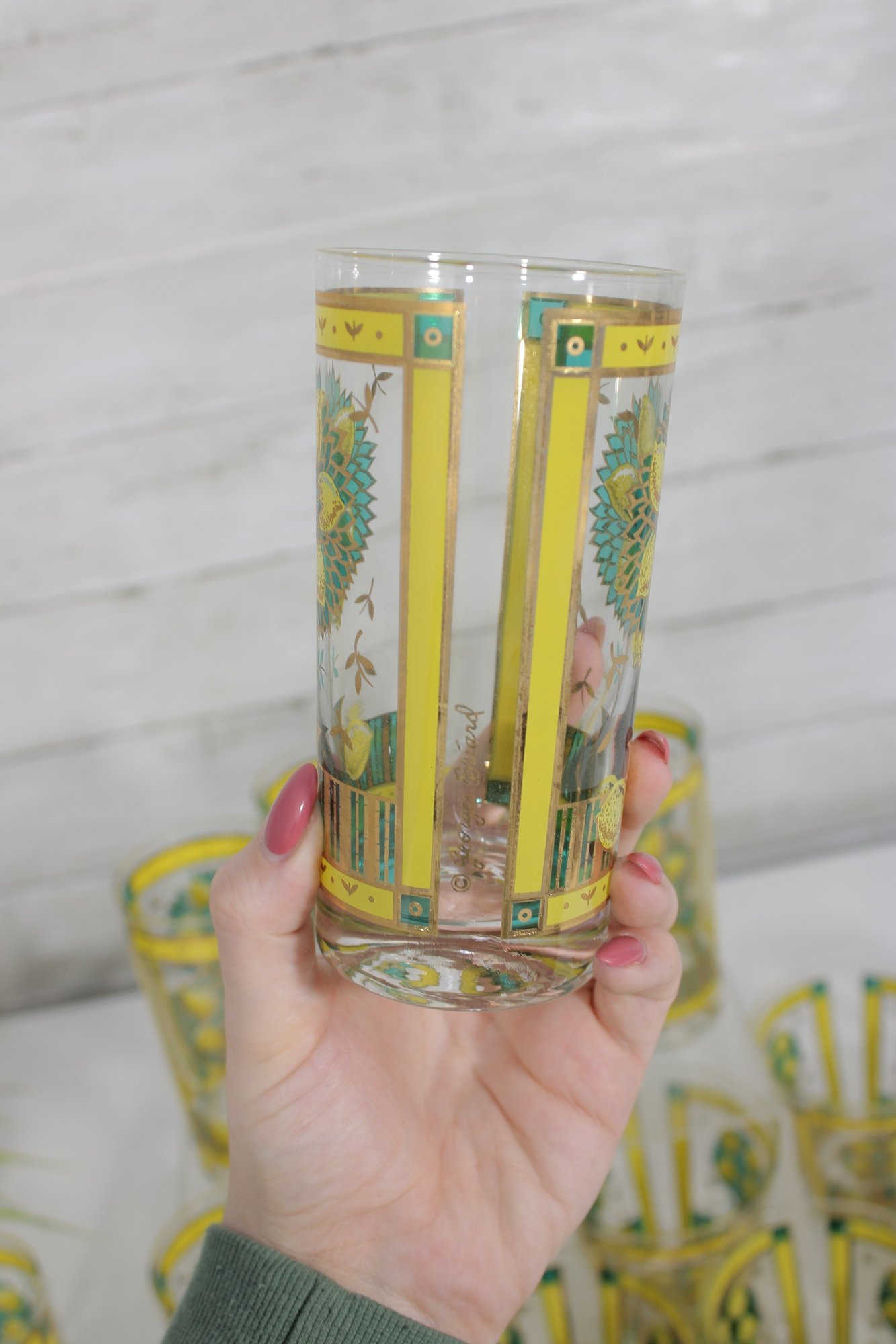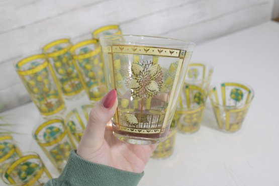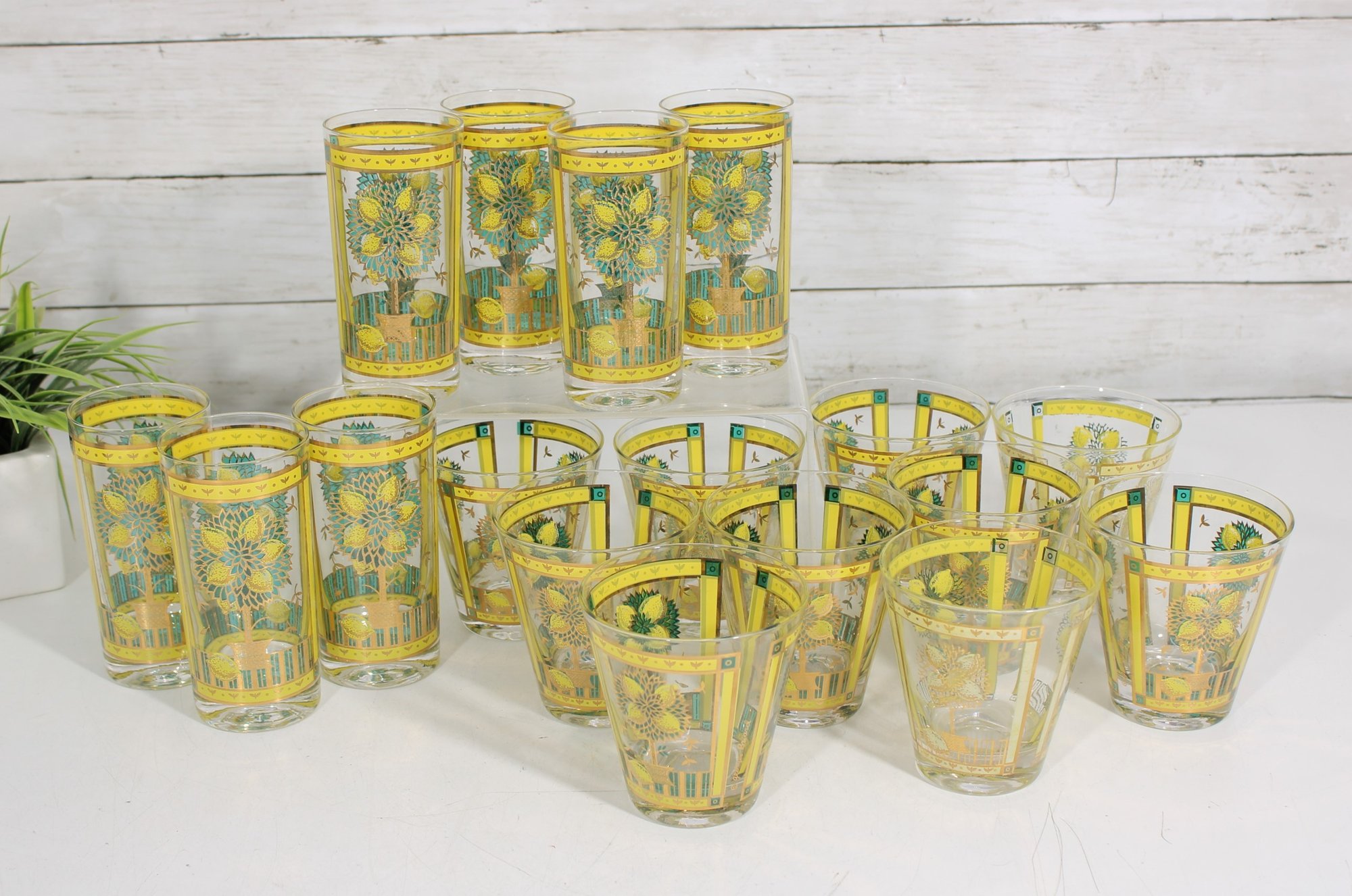 Vibrant and highly collectible vintage barware set featuring the iconic Georges Briard “Lemon Tree” pattern. This cheerful design showcases bright yellow lemons, green leaves, and decorative accents with gold detailing—perfectly capturing mid-century modern style.
