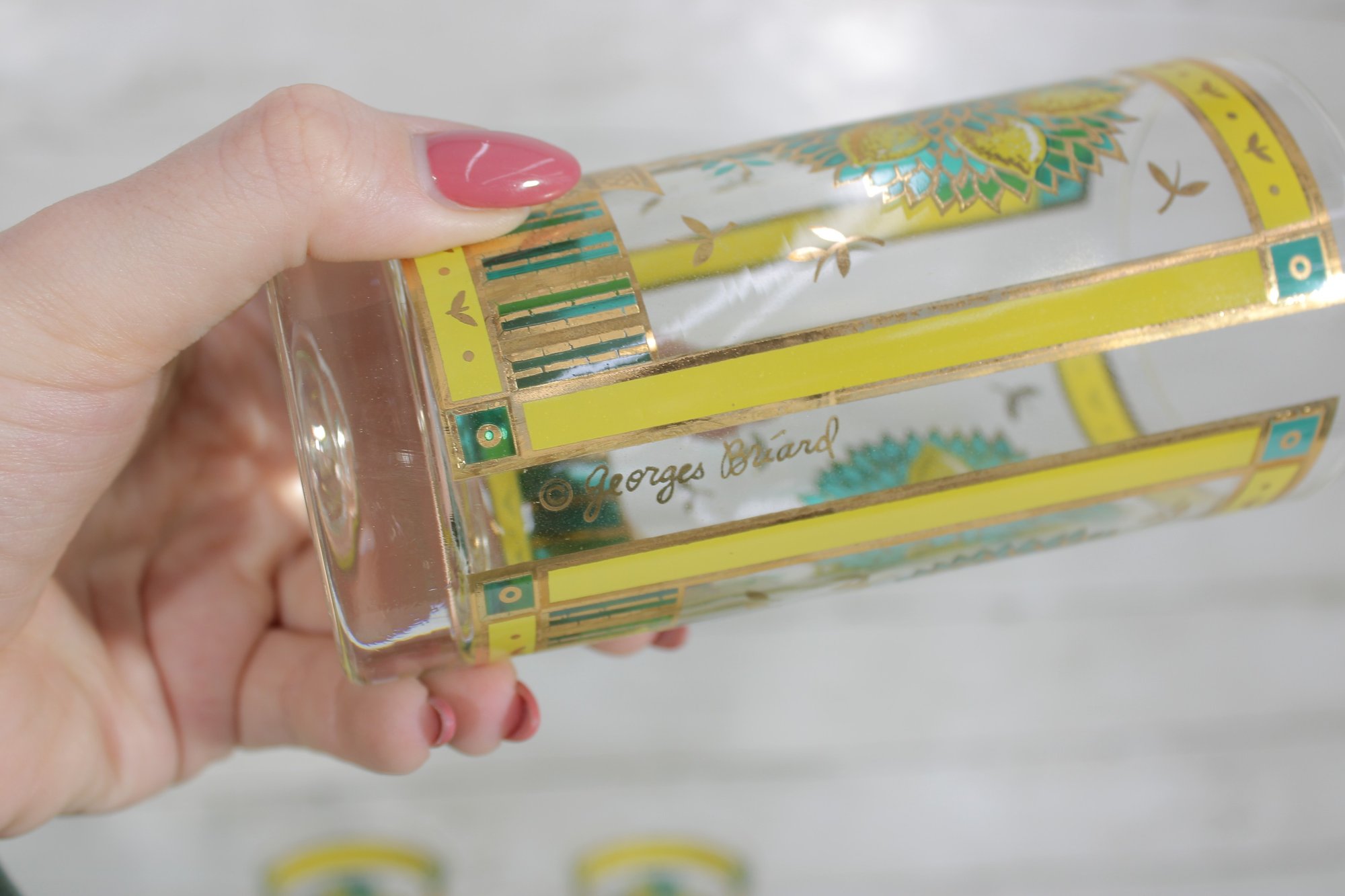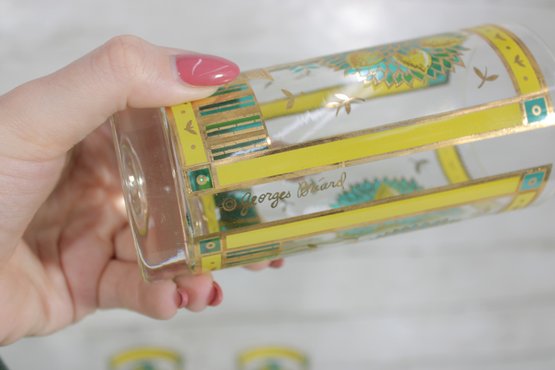 The lot includes a mix of taller highball glasses (approx. 5.5" tall) and shorter lowball/rocks glasses (approx. 4" tall), making it a versatile set for serving a variety of cocktails. Each piece is signed “Georges Briard,” confirming authenticity.