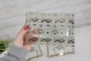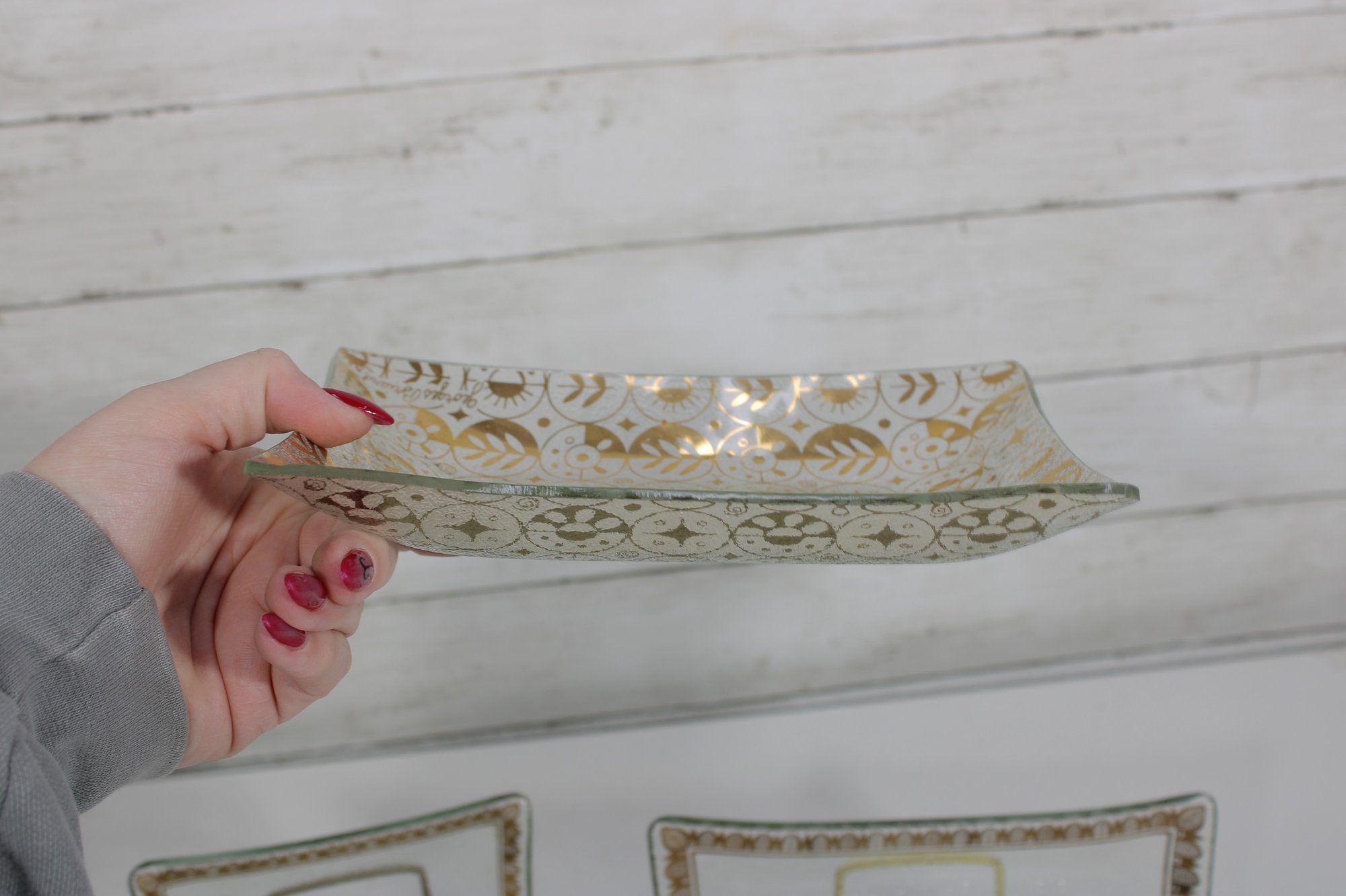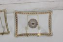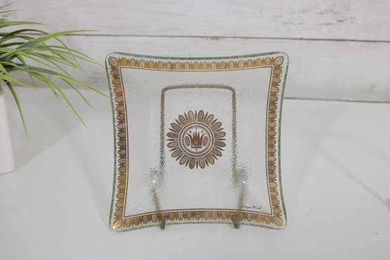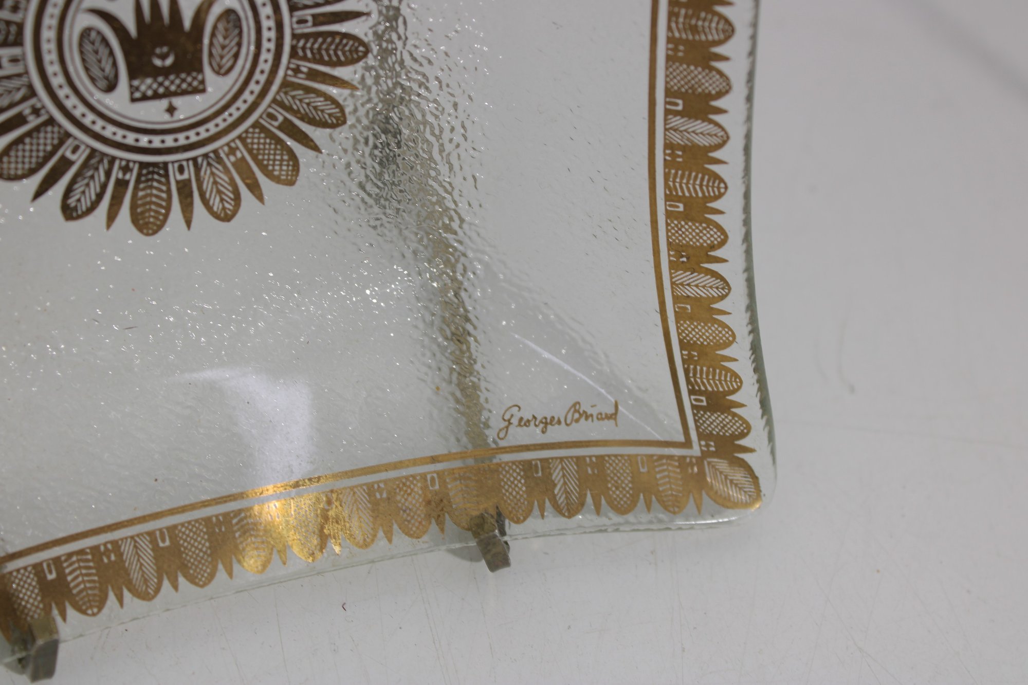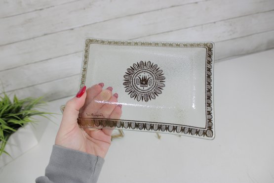 set of three vintage Georges Briard glass serving trays, showcasing the designer’s signature mid-century modern aesthetic. Each tray features elegant gold and white detailing with intricate patterns and a central sunburst-style medallion, adding a touch of sophistication to any bar or serving setup.