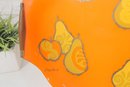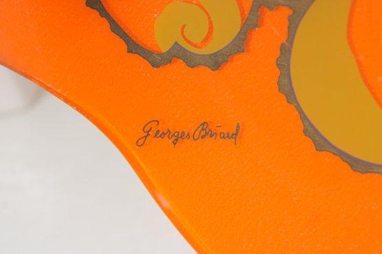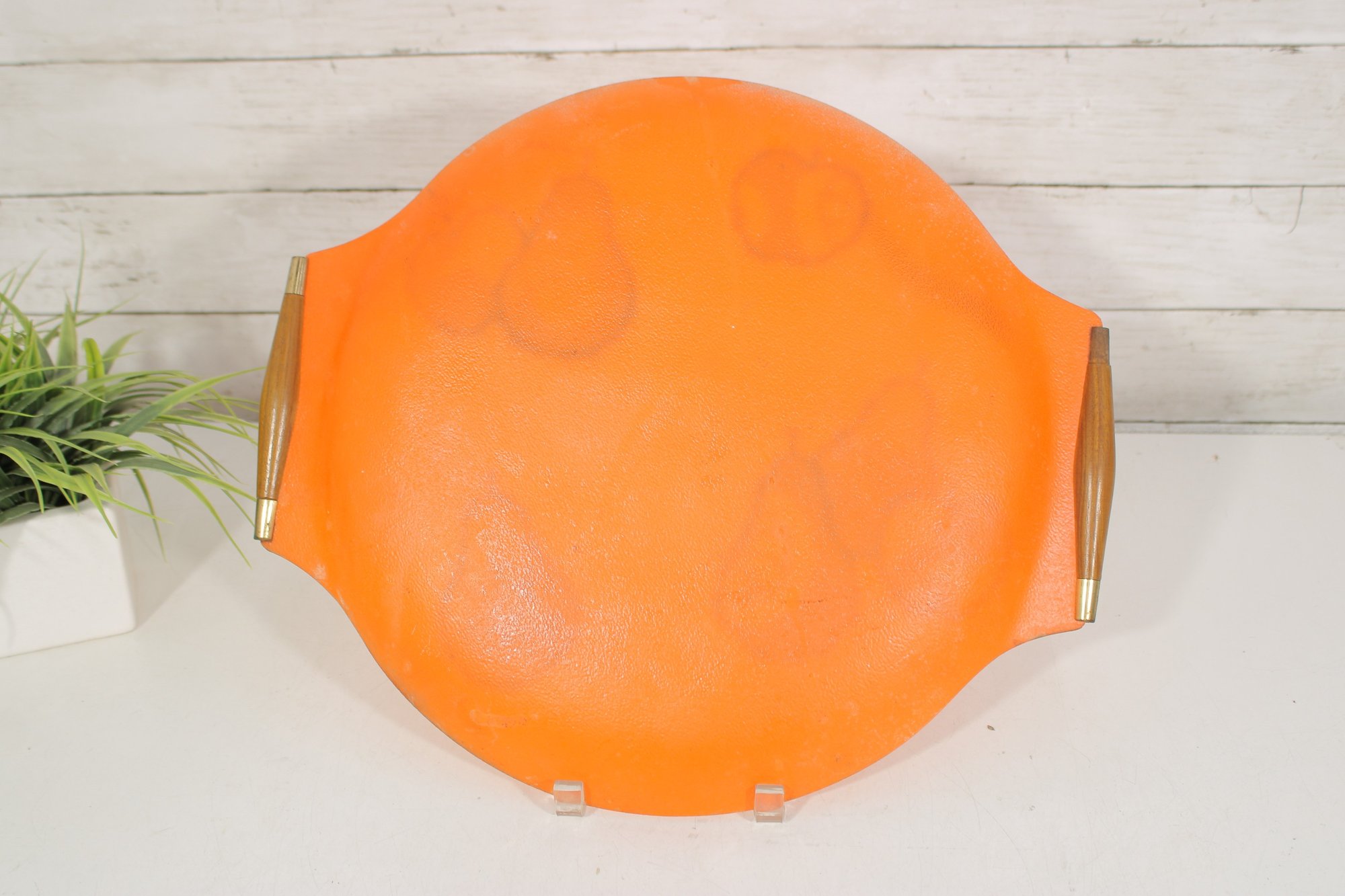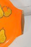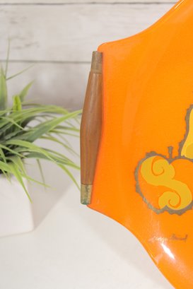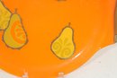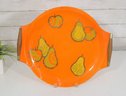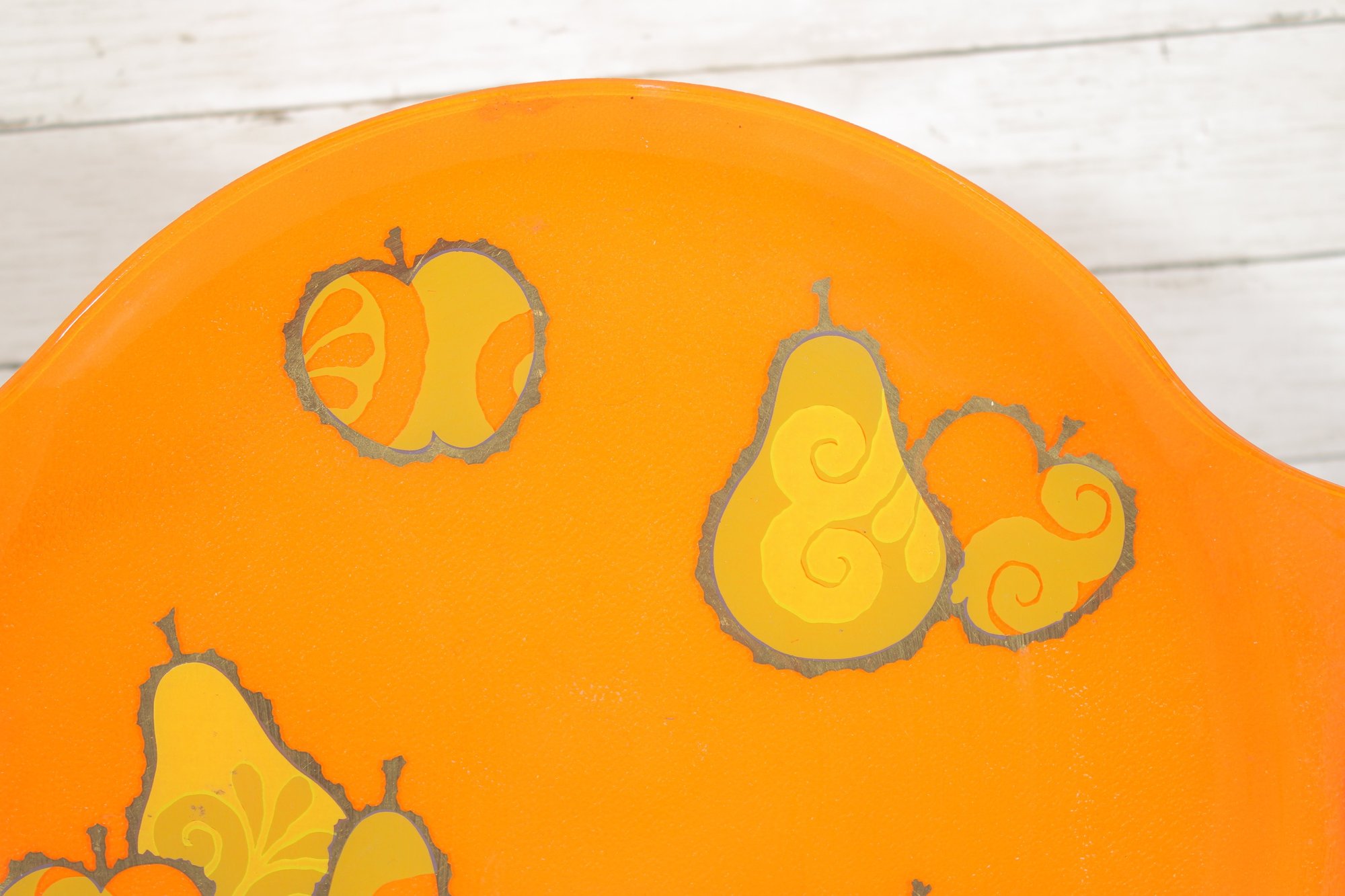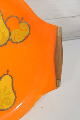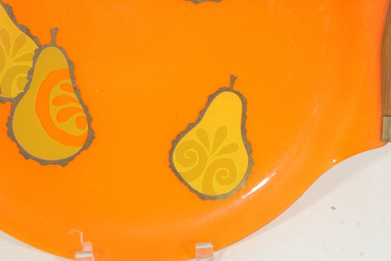 Bright and iconic vintage serving tray by Georges Briard, featuring a bold mid-century modern design with stylized pears set against a vibrant orange background. The playful fruit motif in yellow and green tones, outlined with metallic accents, perfectly captures Briard’s signature retro aesthetic.