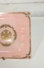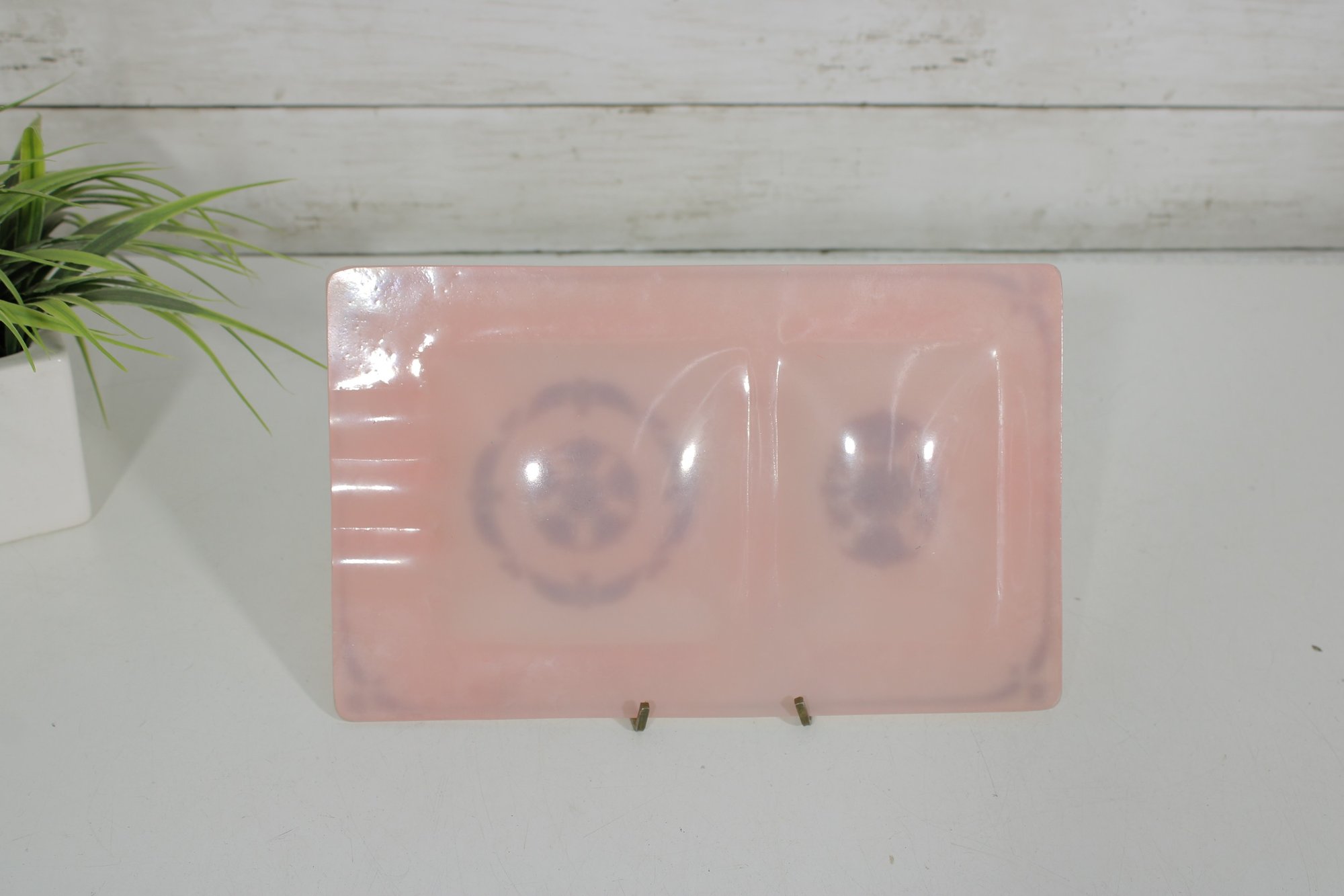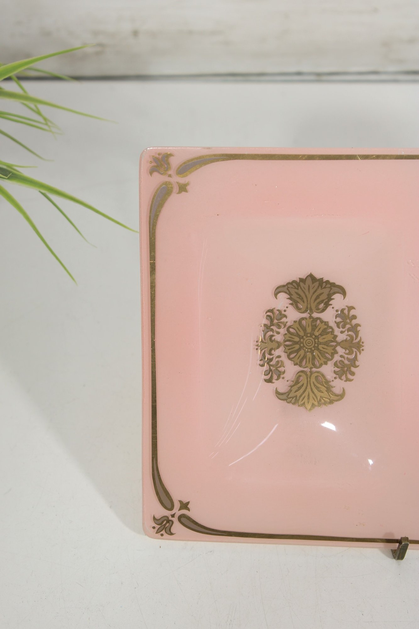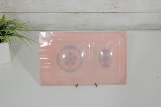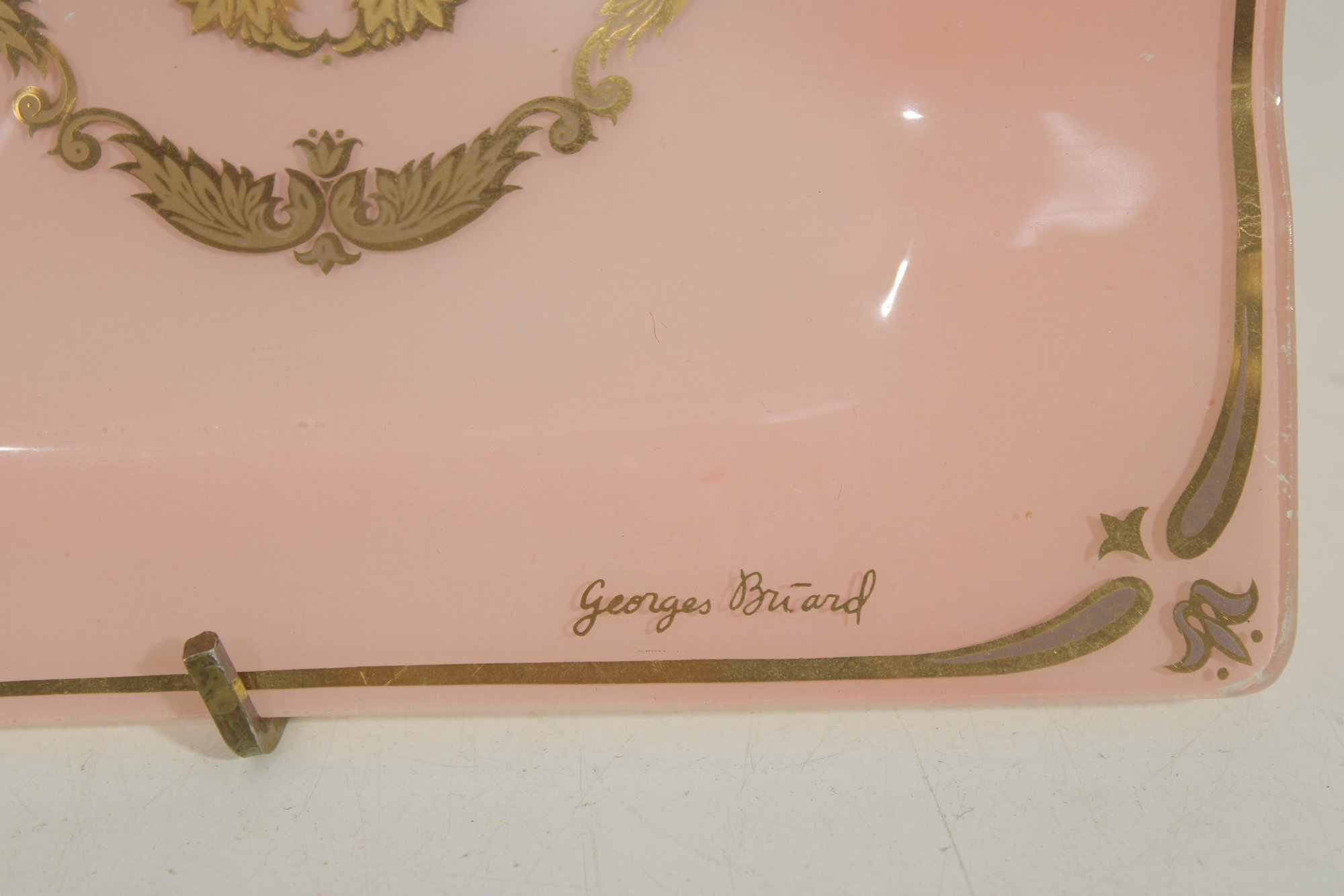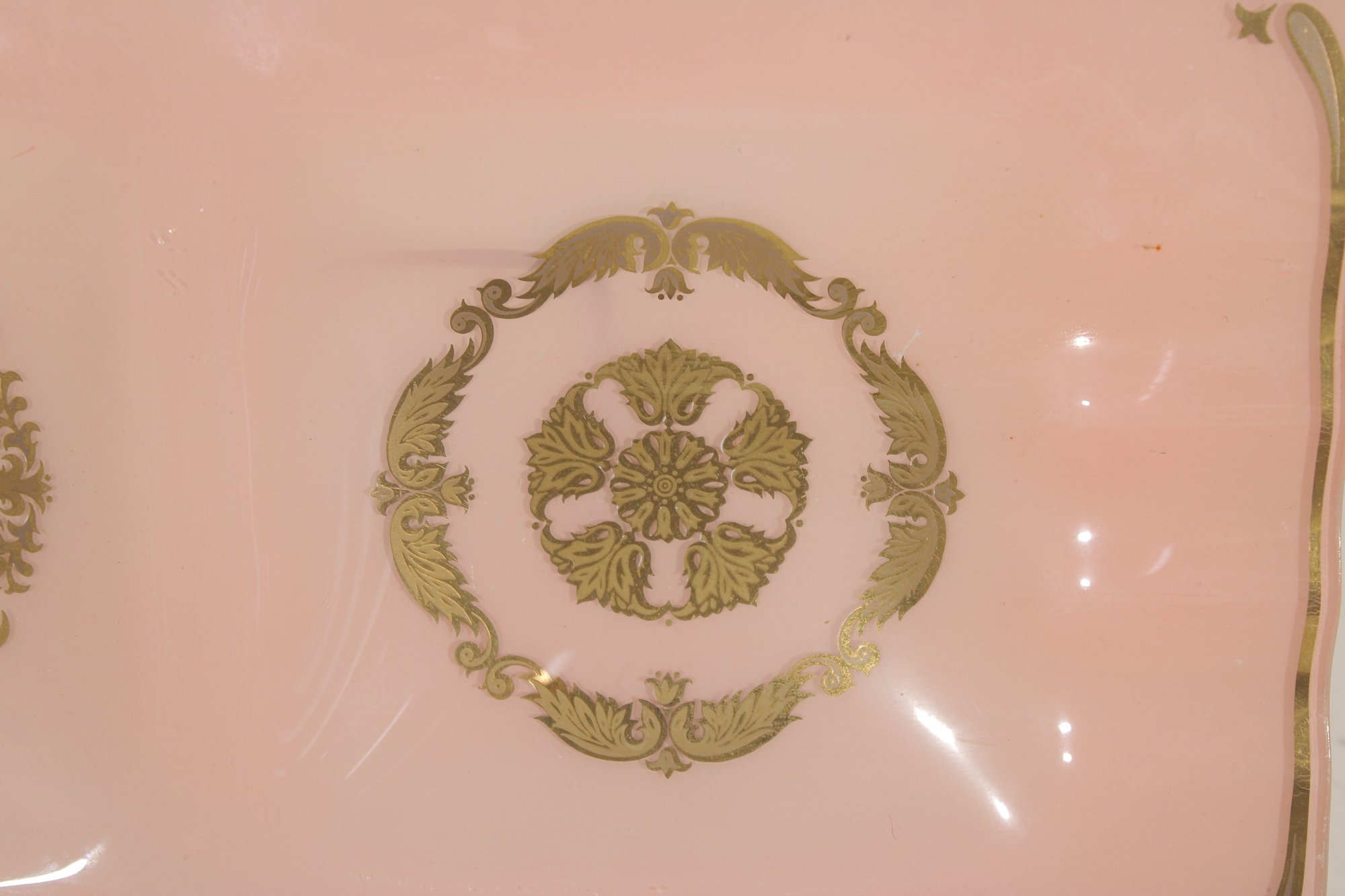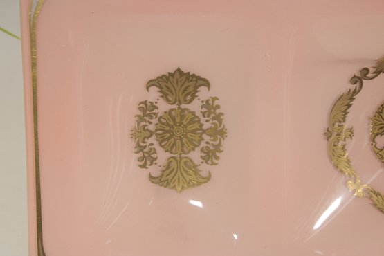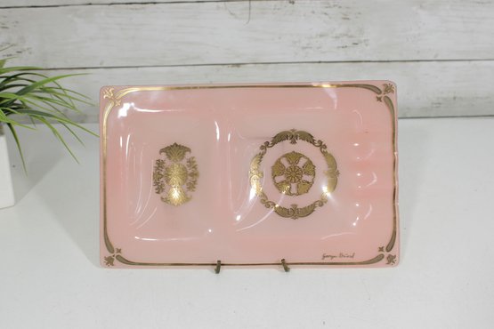 vintage Georges Briard glass tray featuring a soft pink background adorned with ornate gold gilt designs. This mid-century modern piece measures approximately 10" x 6.5" and showcases two decorative panels with intricate, symmetrical motifs framed by delicate gold accents along the border.