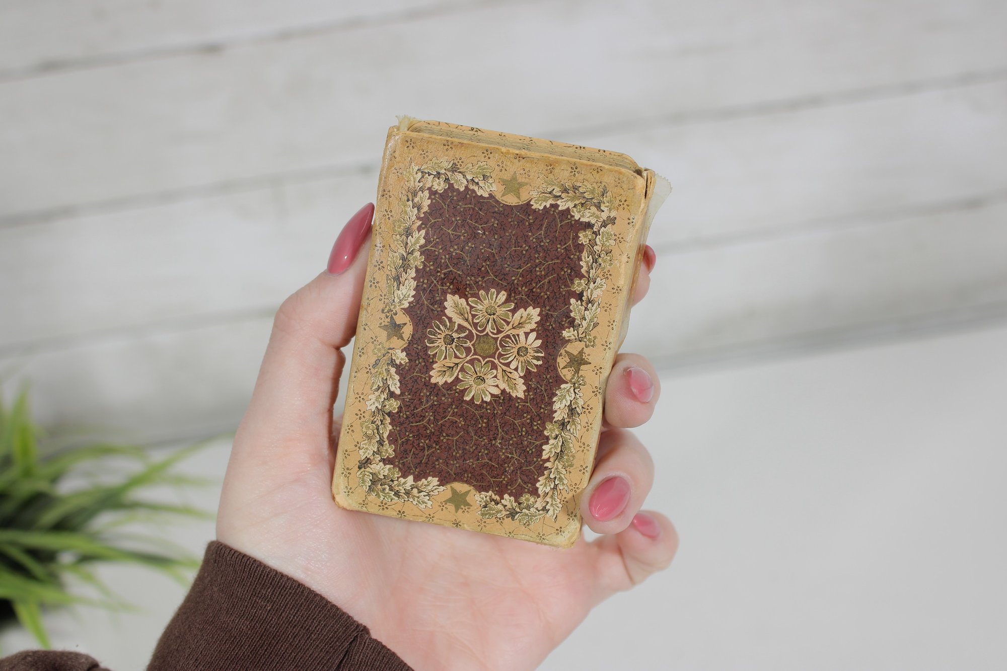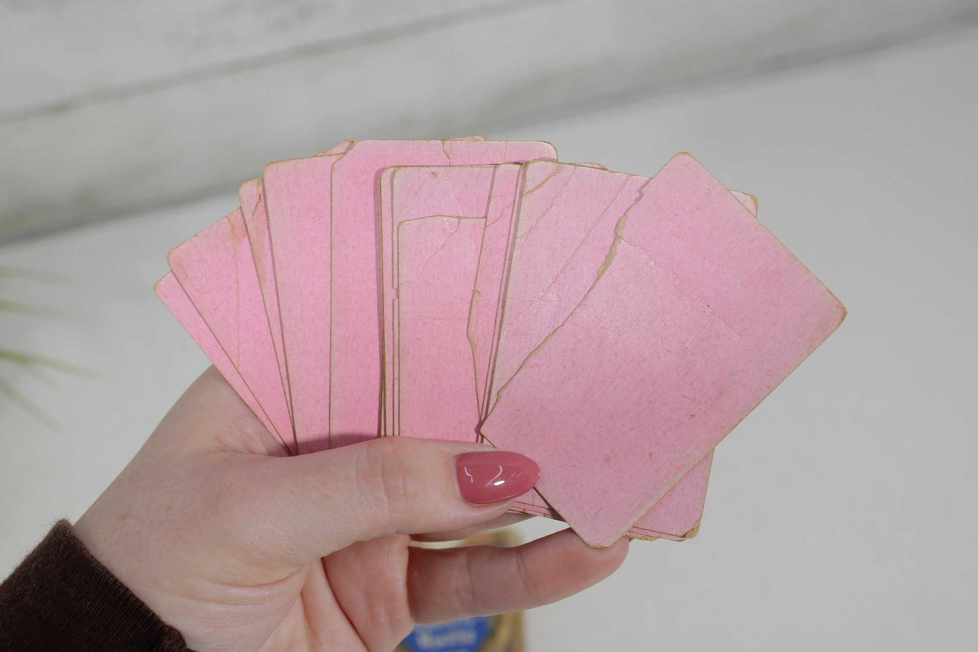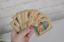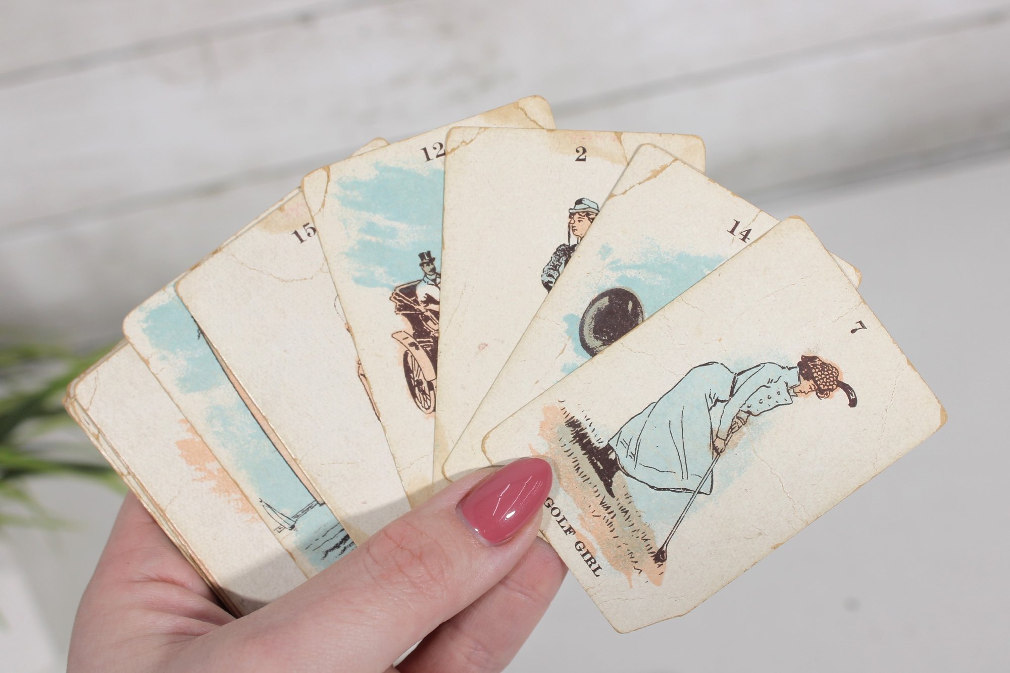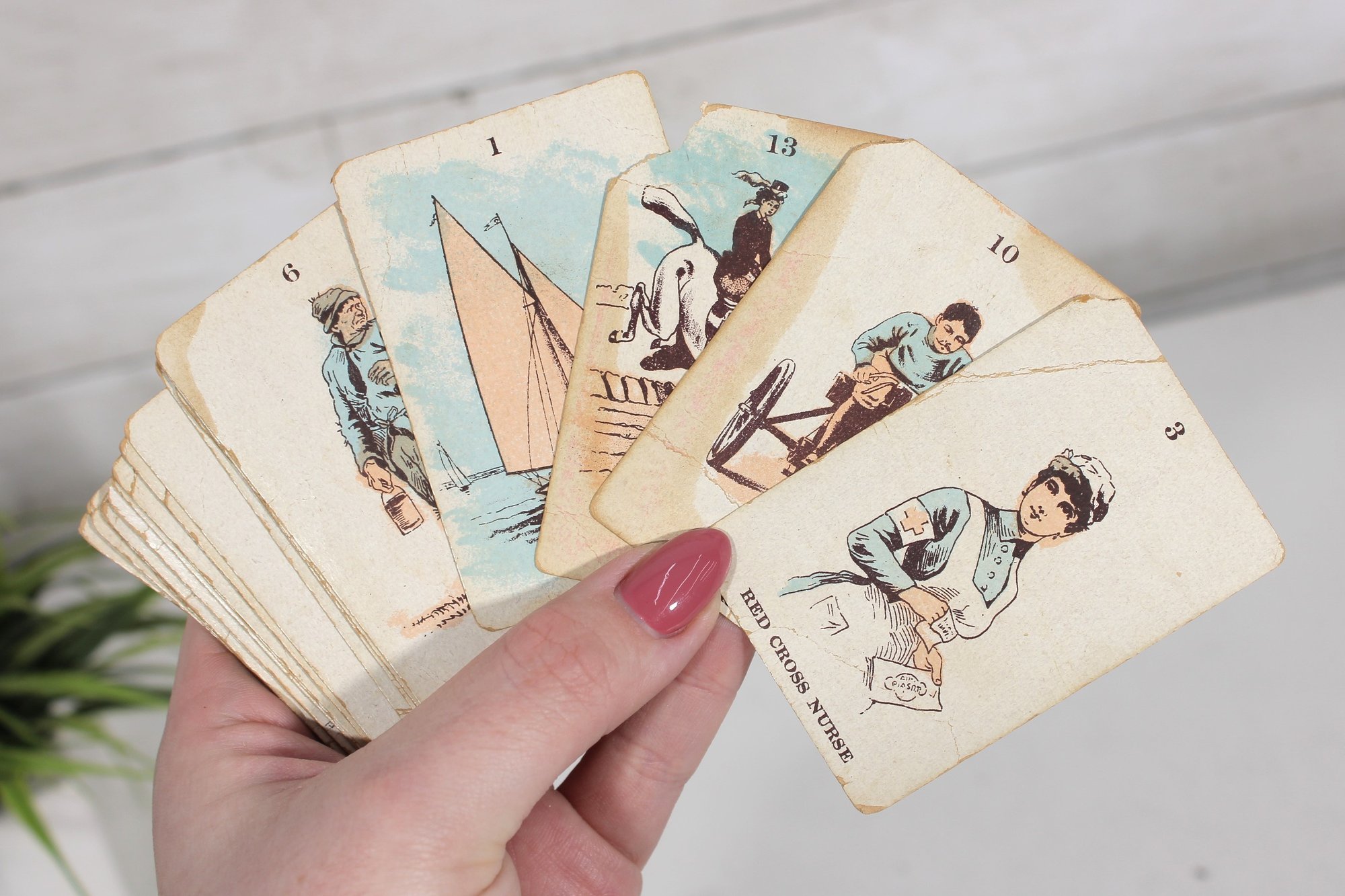 Also included is a set of small illustrated cards depicting children engaged in various activities, such as writing, sailing, and working, rendered in a charming early illustration style. These cards appear to be from a vintage children’s game or educational set.