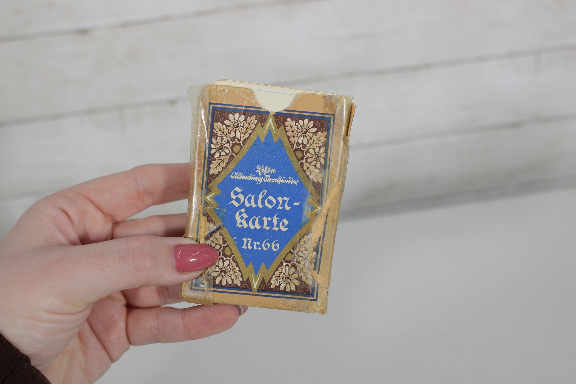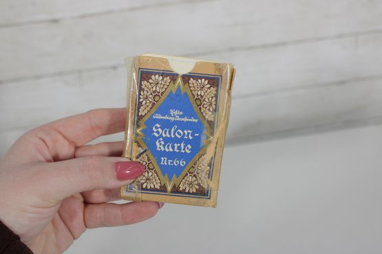 The Salonkarten deck features classic playing card suits with decorative artwork and a beautifully designed original box labeled “Salonkarten No. 96.” The cards display traditional European style printing and design.