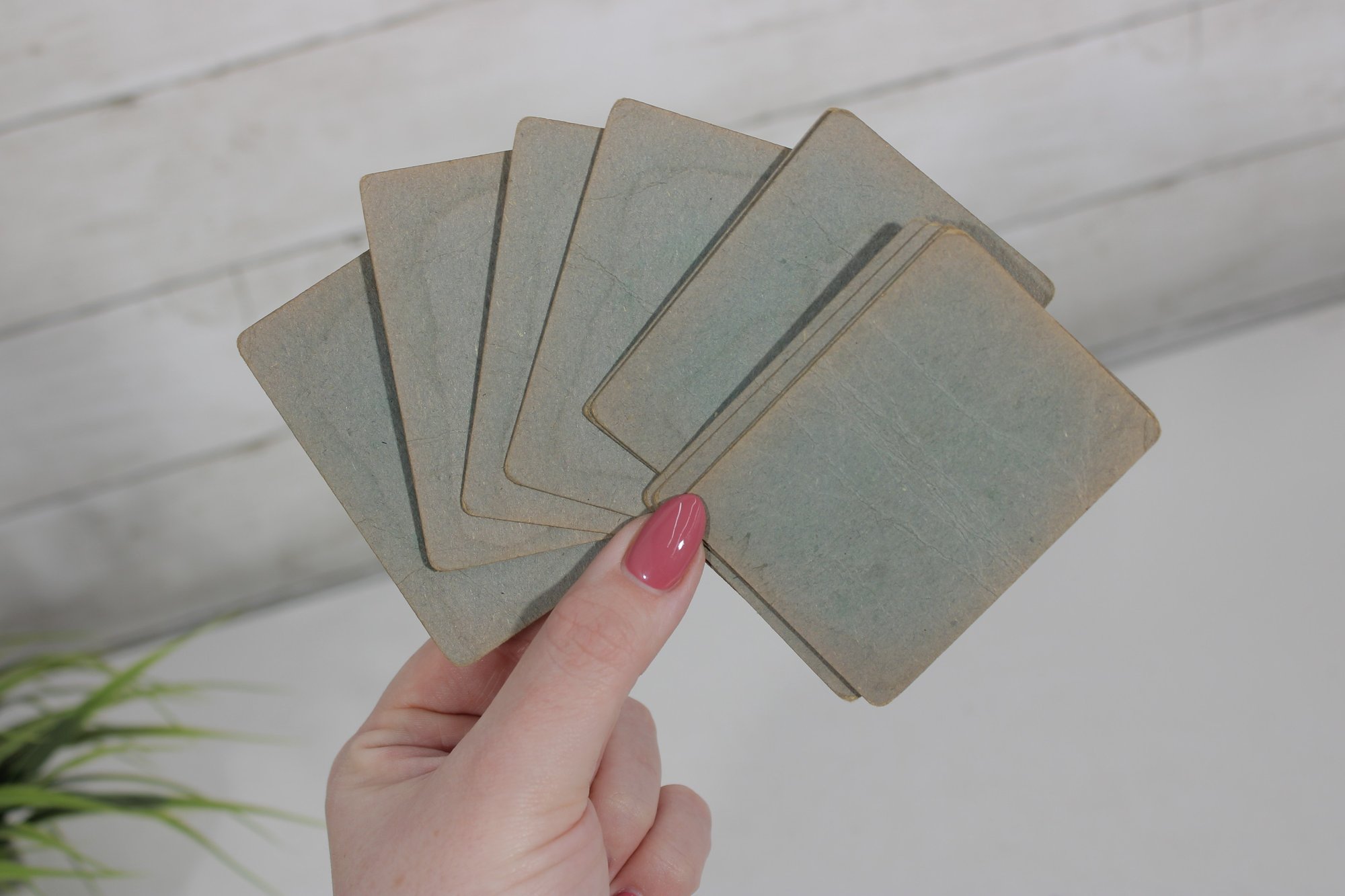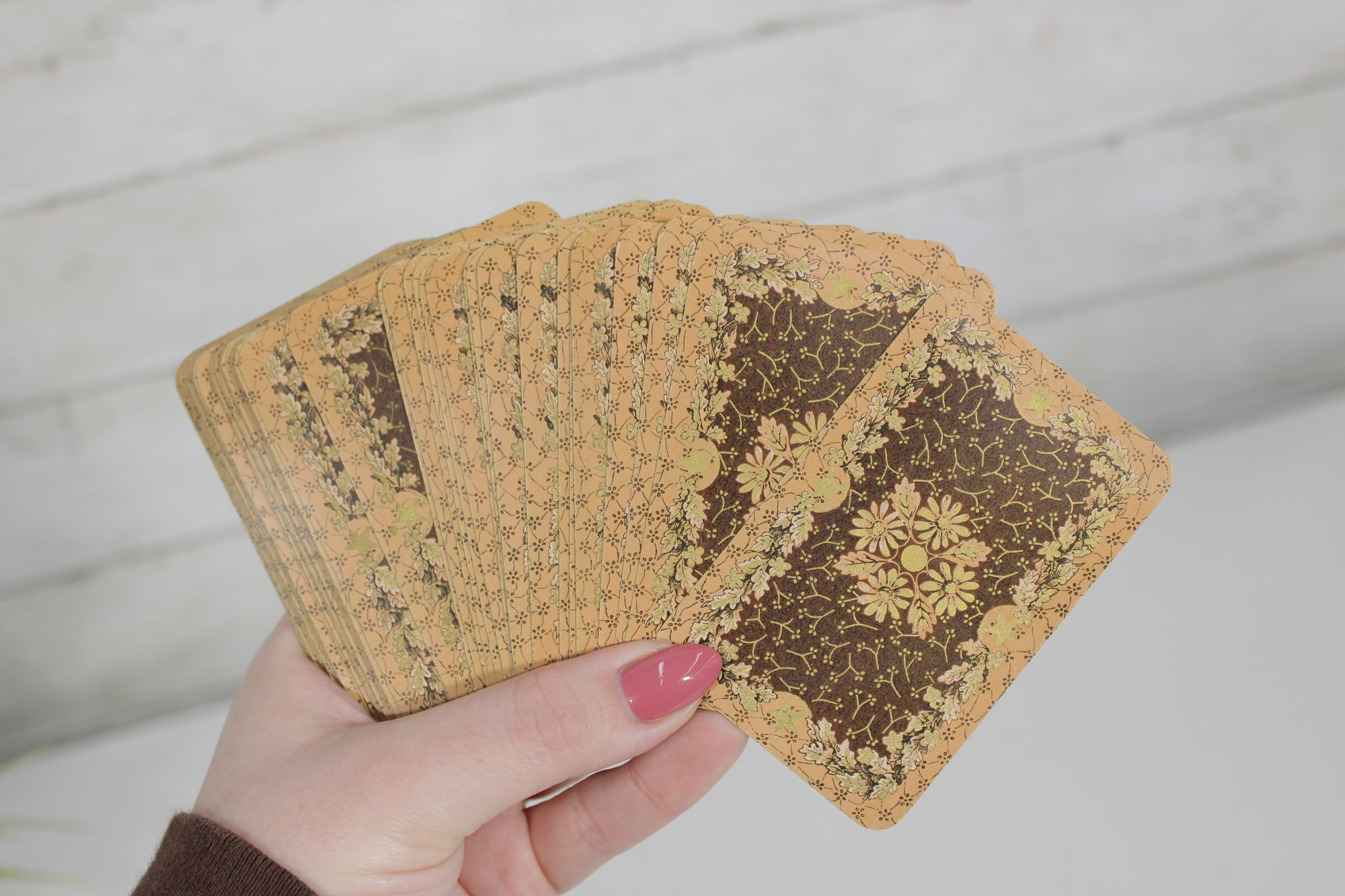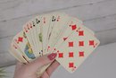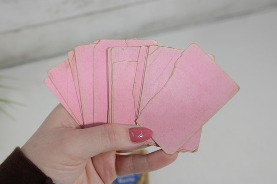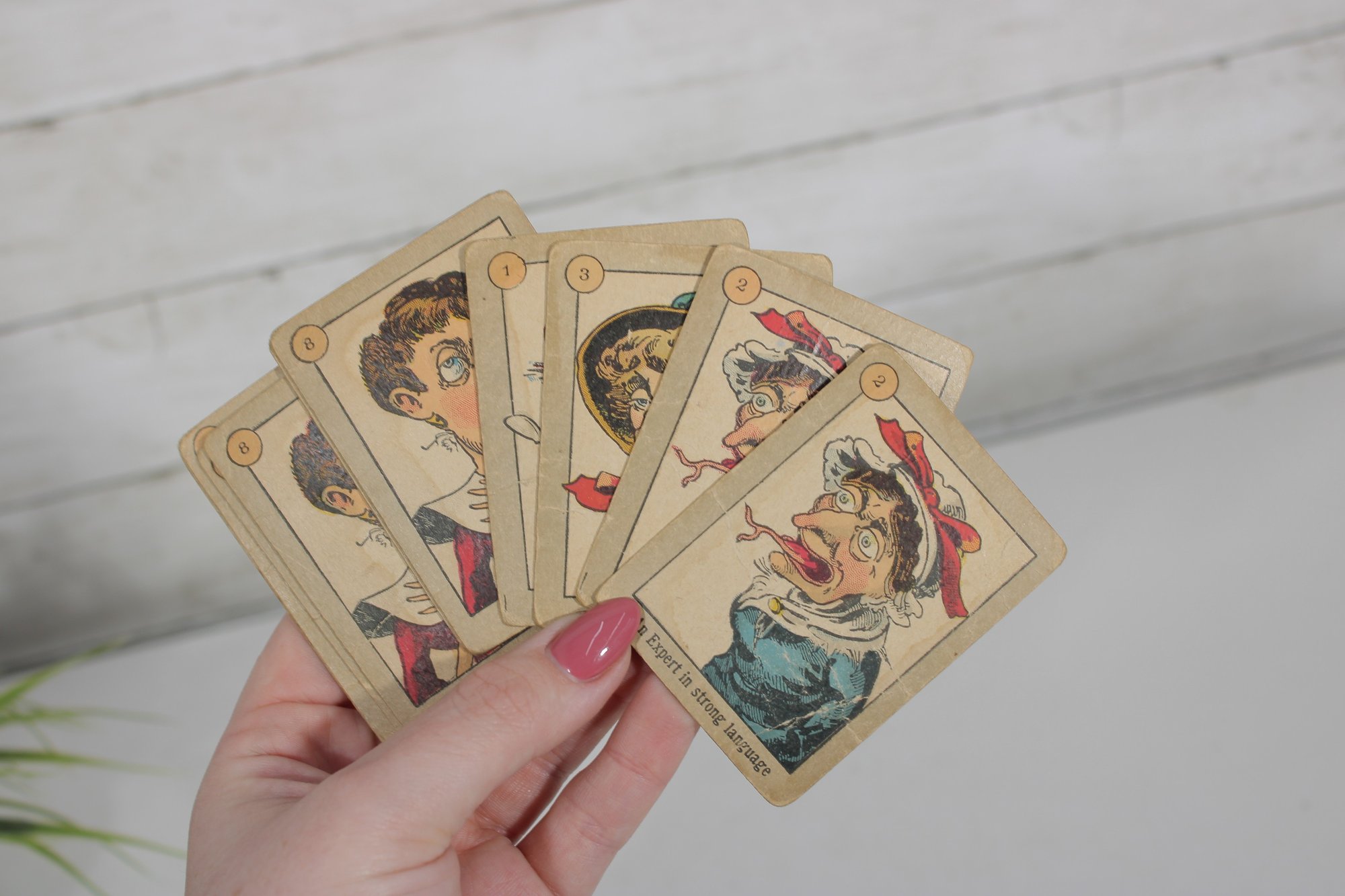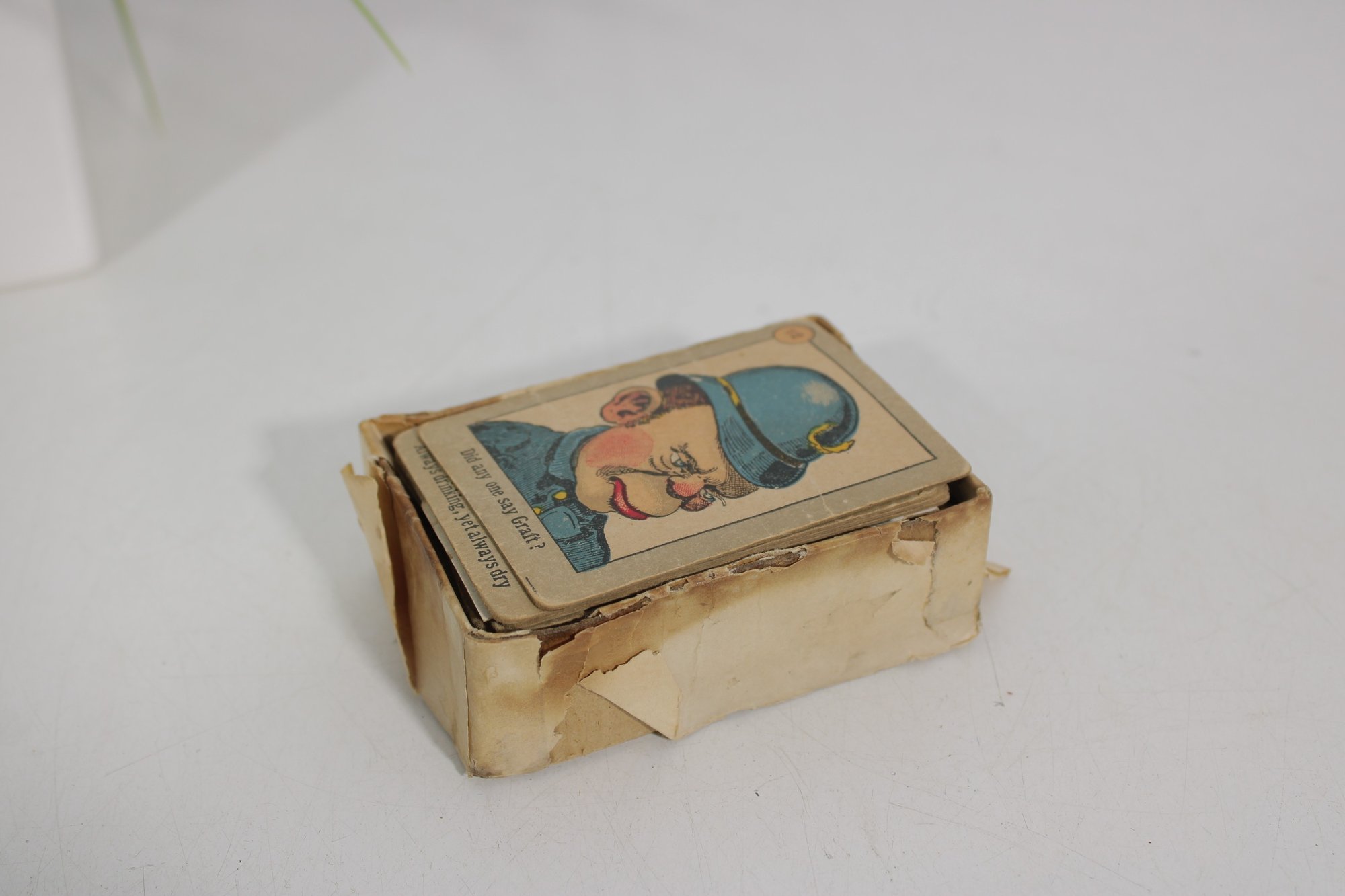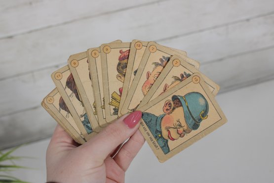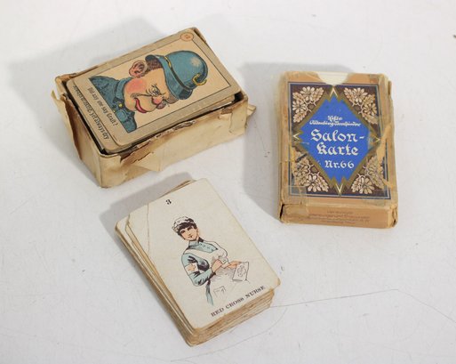 a charming lot of vintage playing cards, including a deck of German “Salonkarten No. 96” cards and an additional illustrated children’s card set featuring whimsical character scenes. The lot also includes a small vintage storage box.