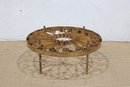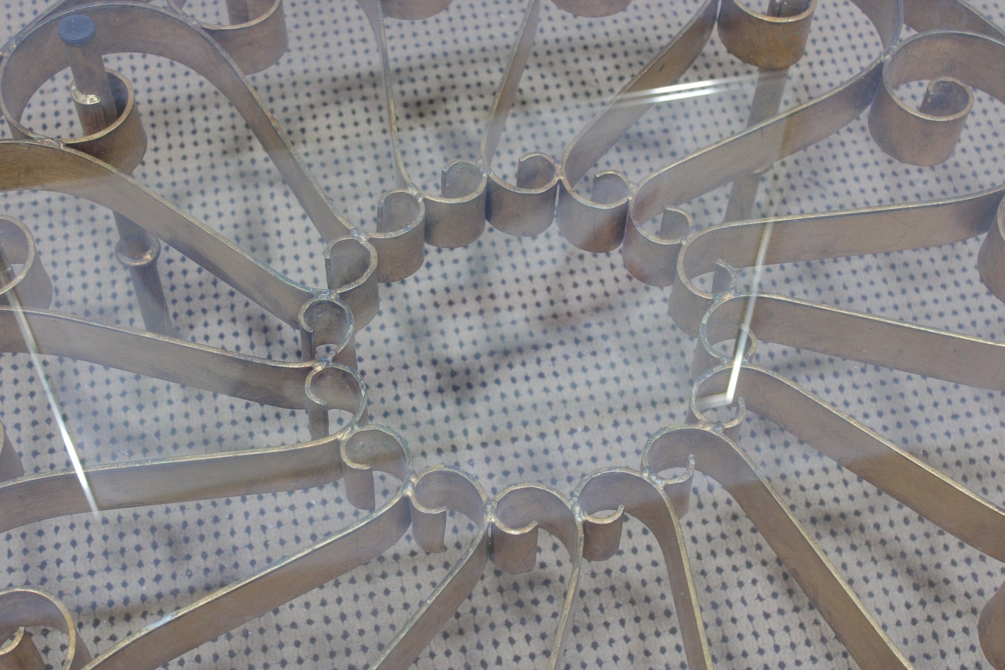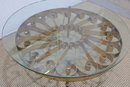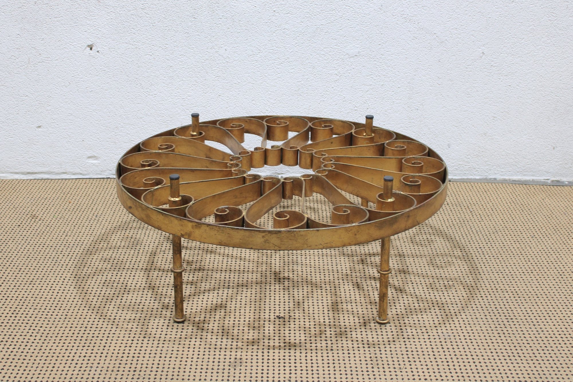 vintage gilt iron coffee table featuring a stunning circular scrollwork base and round glass top. The intricate wrought iron design radiates outward in a sunburst-inspired pattern with graceful curled detailing, creating beautiful depth and shadow beneath the glass.