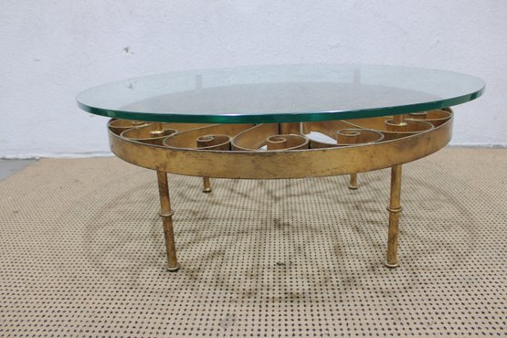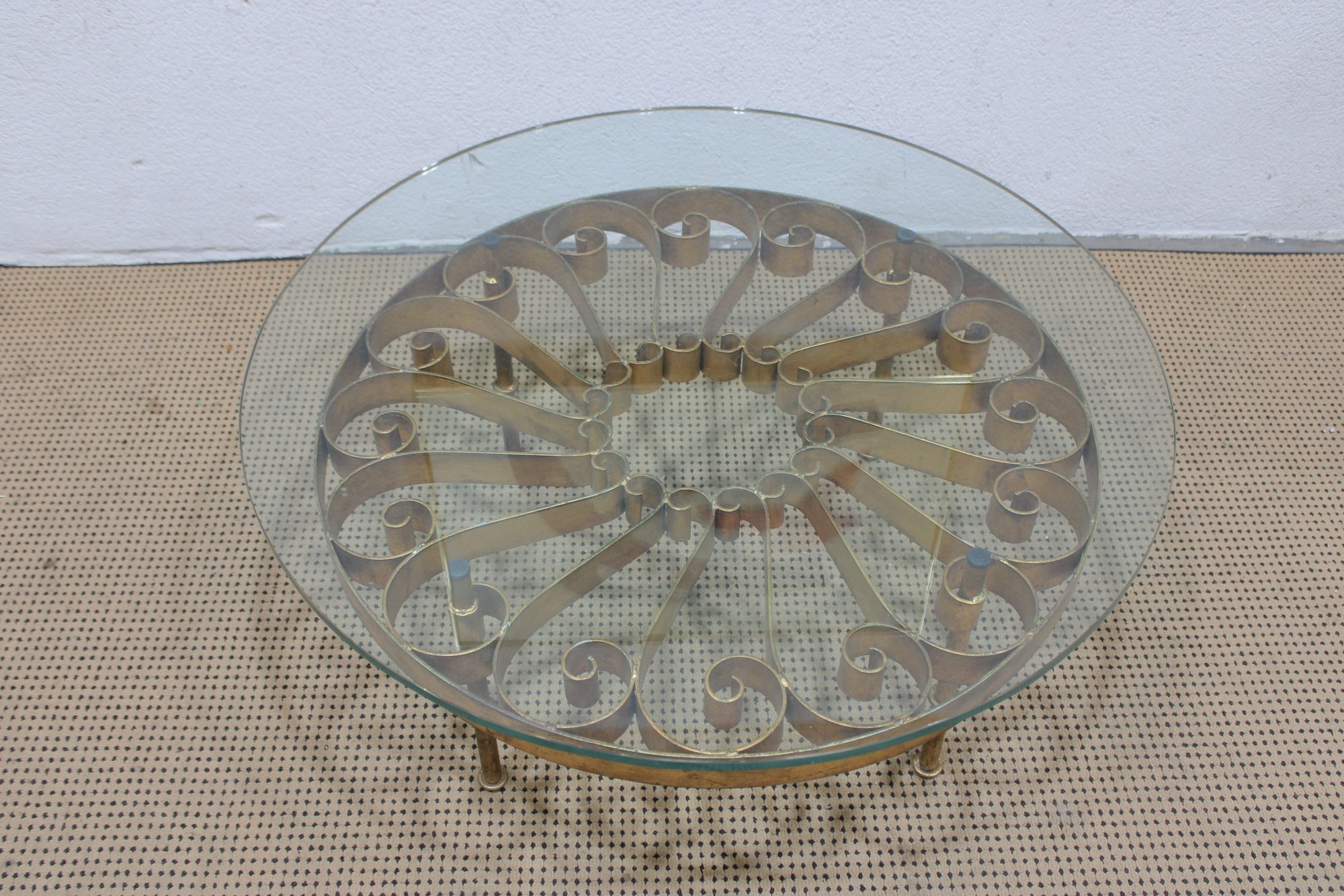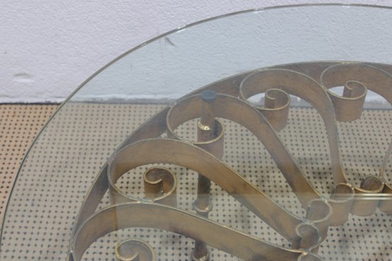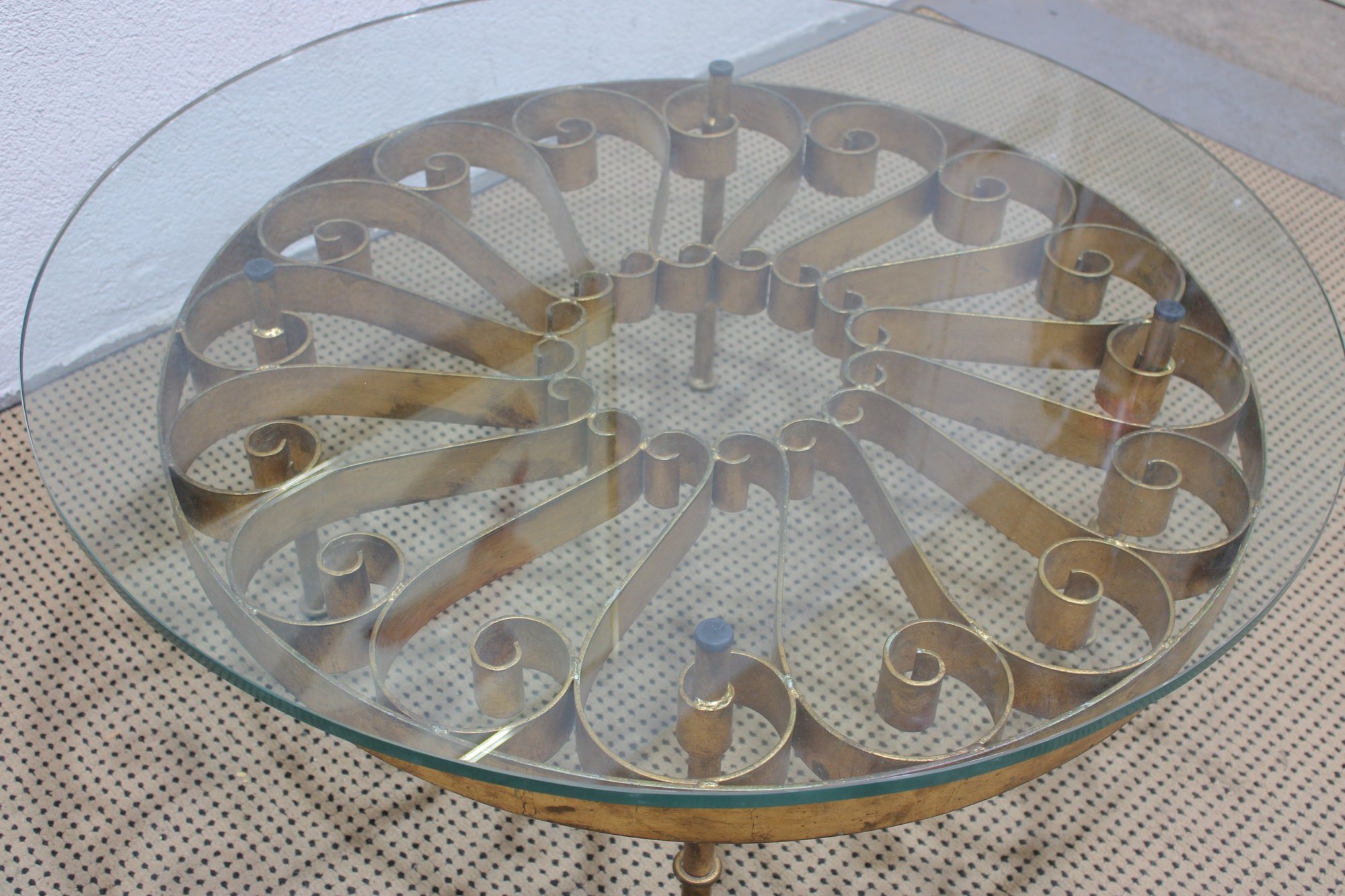 Finished in a warm gilt tone, the base offers a classic Hollywood Regency or Mediterranean feel while remaining versatile enough for traditional or eclectic interiors. The round glass top allows full visibility of the ornate ironwork, making it a true statement piece.