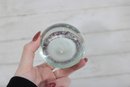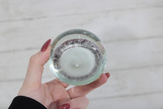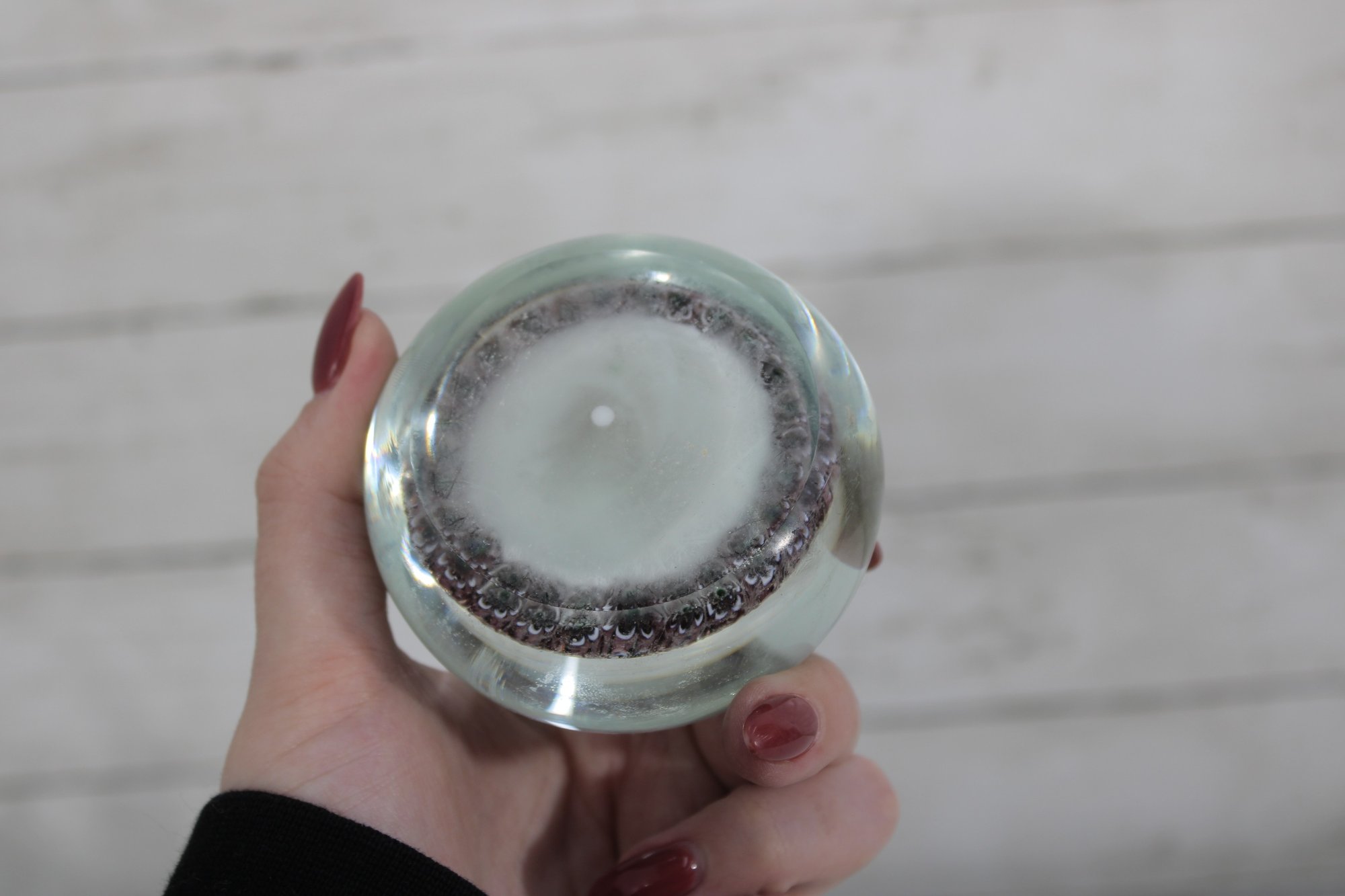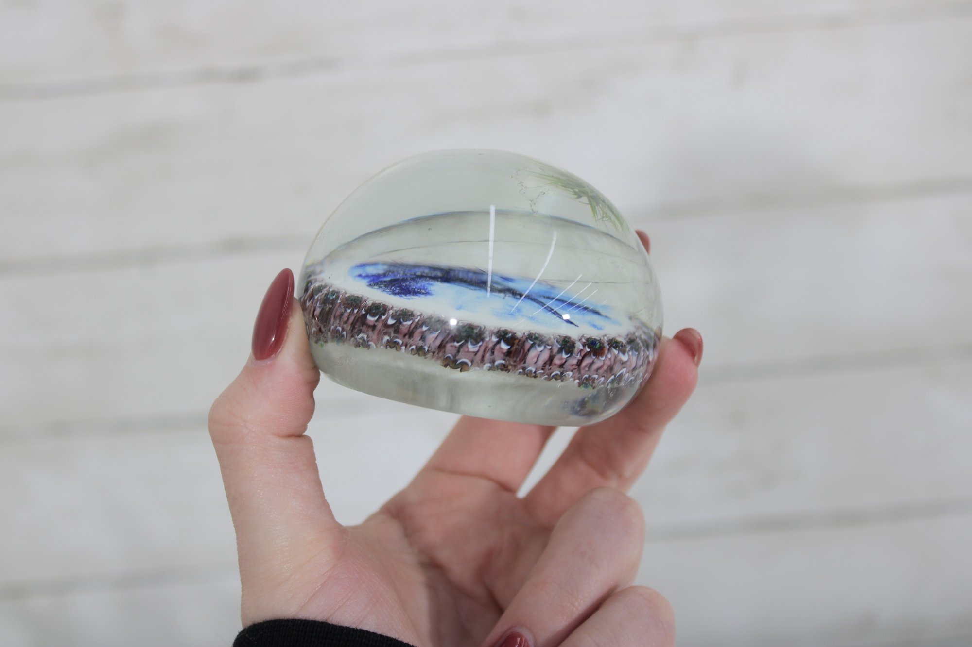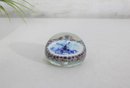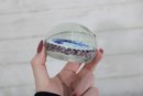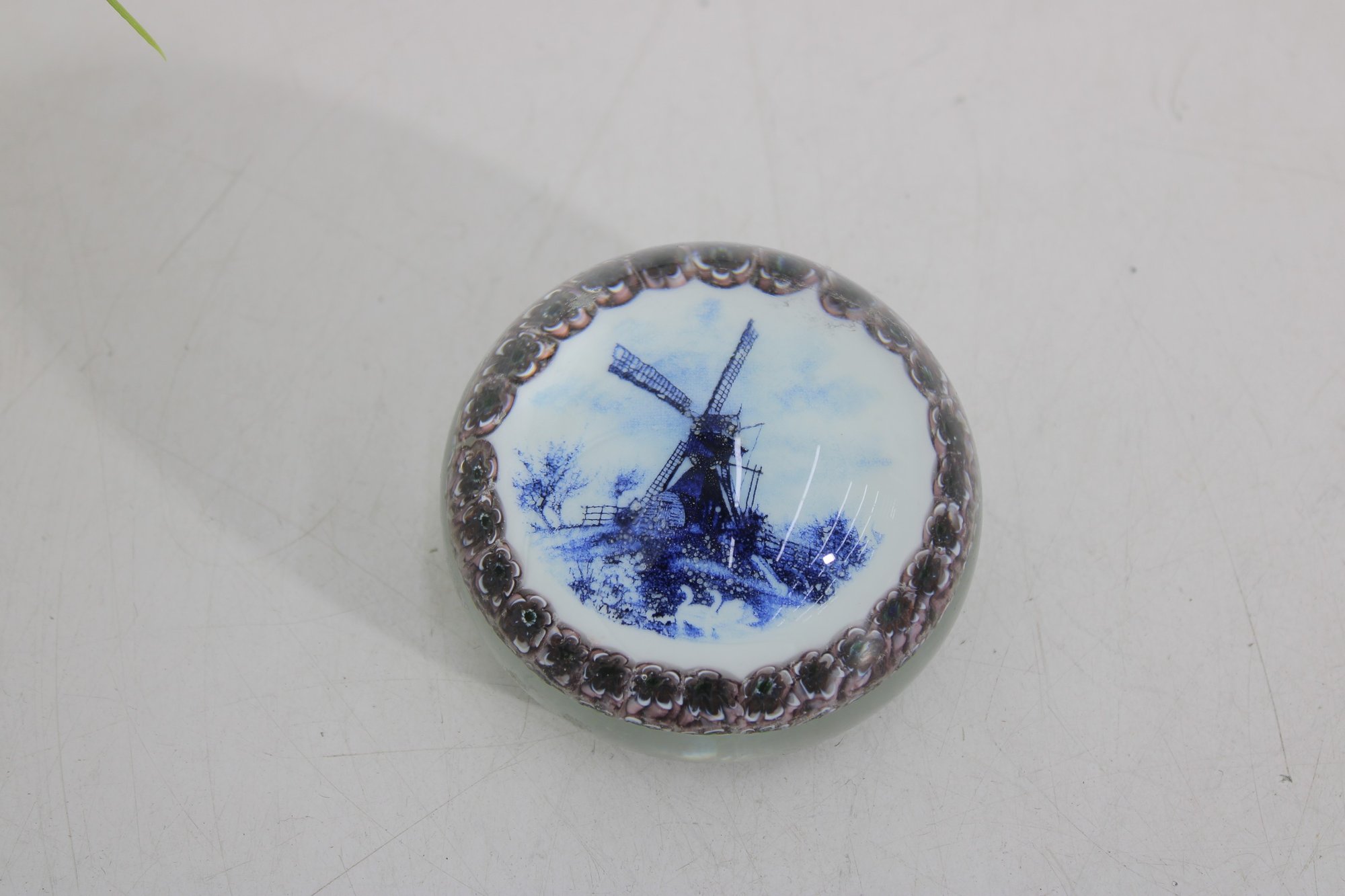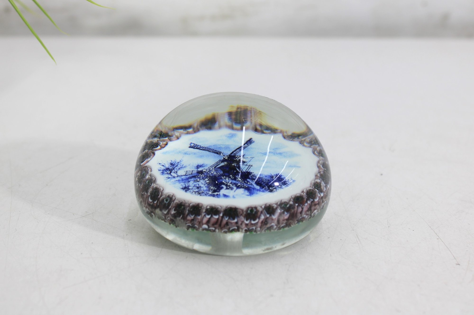 a charming vintage glass paperweight featuring a classic blue Delft-style windmill scene. This decorative piece measures approximately 2 inches tall and has a smooth domed top with a clear glass body.
