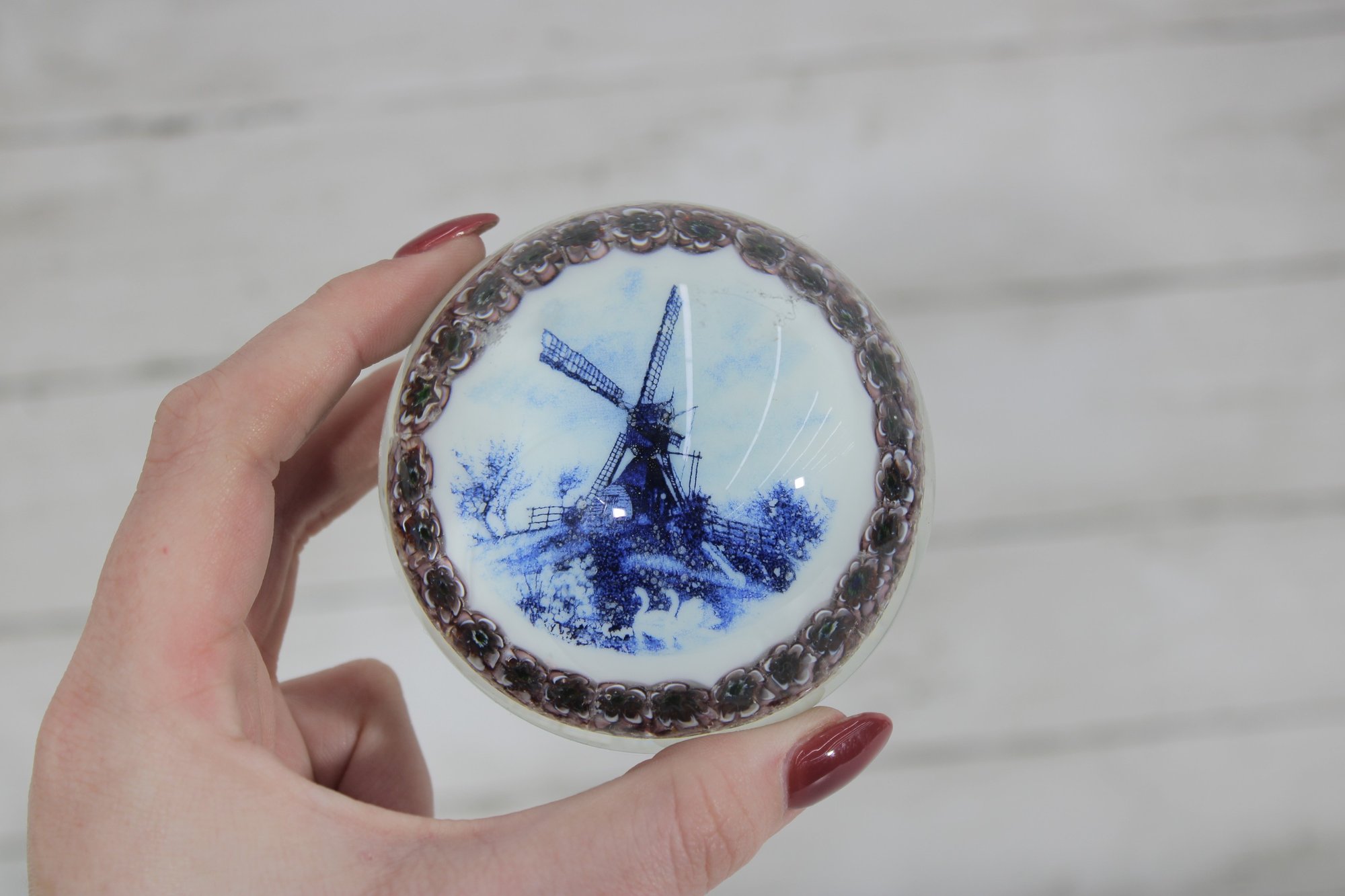 The center design showcases a traditional Dutch windmill landscape rendered in blue and white tones, surrounded by a decorative border. The artwork is encased beneath clear glass, giving it lovely depth and magnification.