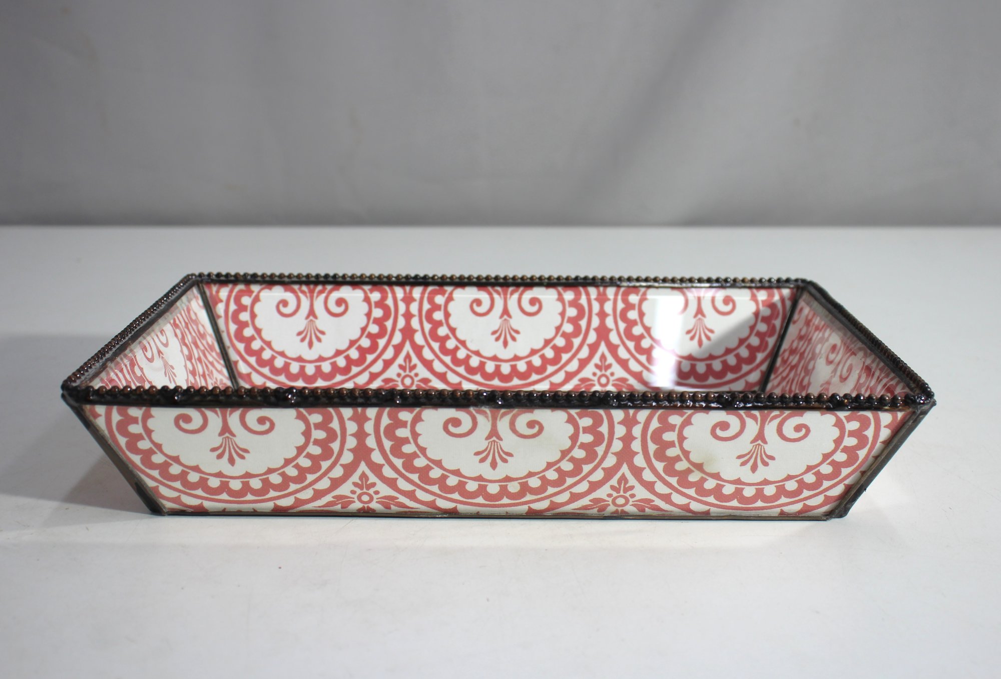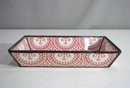 This elegant vintage glass tray features a captivating red Chinoiserie-inspired design, depicting a traditional scene of figures on a boat surrounded by lush floral patterns. The intricate artwork is bordered by a detailed beaded edge, adding to its charm and sophistication. Perfect for use as a decorative accent, serving tray, or vanity piece, this tray blends functionality with timeless aesthetic appeal. In excellent vintage condition, this piece is ideal for collectors or those looking to enhance their décor with a unique touch of artistry. A stunning addition to any space!