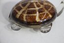 This unique vintage glass turtle paperweight features a beautifully crafted clear glass body with an intricately detailed realistic shell design encased within. Measuring approximately 2 inches in height and 55 inches in length, this charming piece is both a functional paperweight and a decorative collectible.