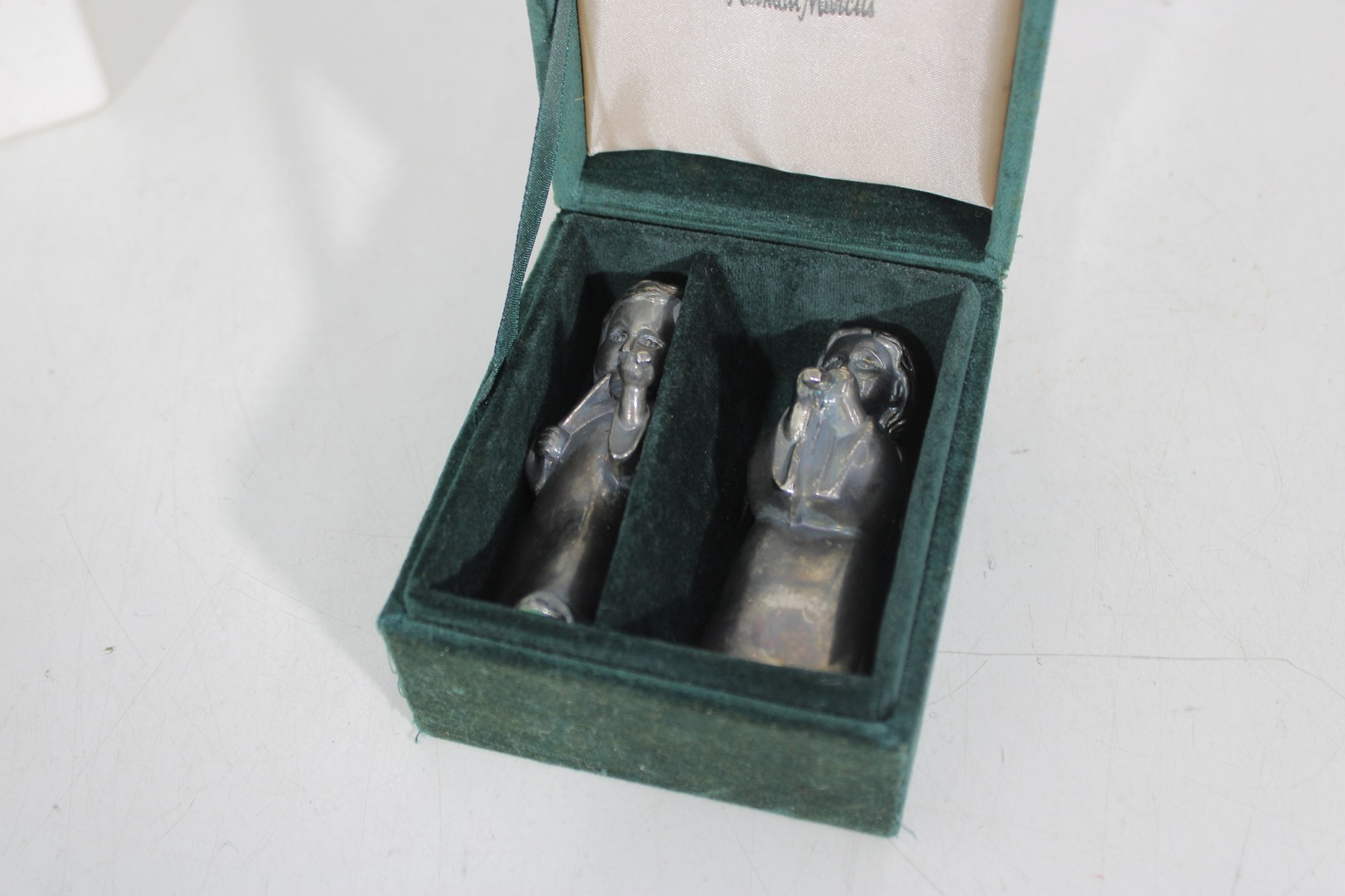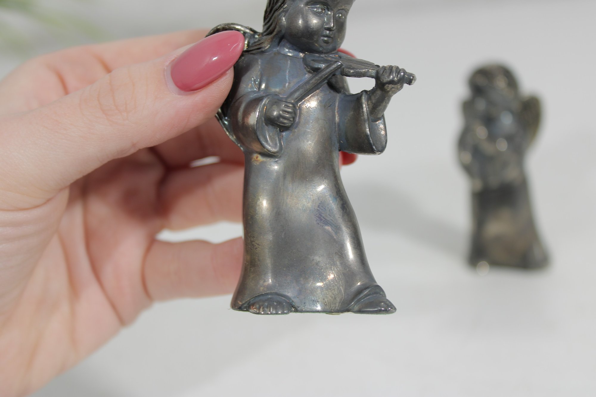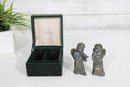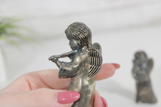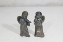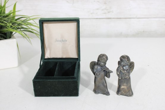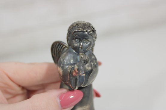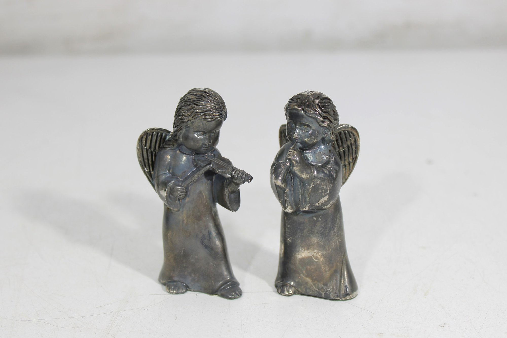 Charming vintage Godinger Silver Art salt and pepper shaker set featuring two angel figurines—one playing a flute and the other in a sweet, prayerful pose. Crafted in a silver-tone finish, these detailed figures double as both functional tableware and decorative collectibles.