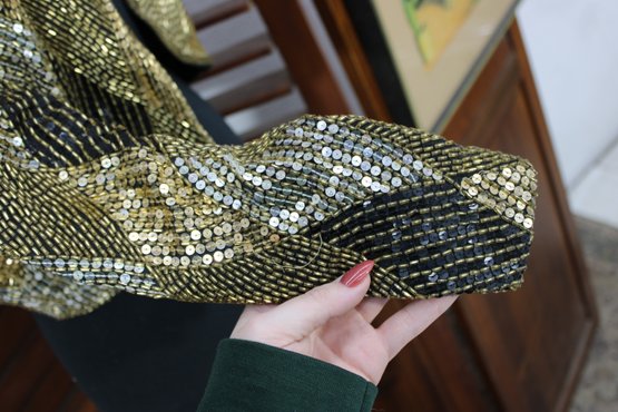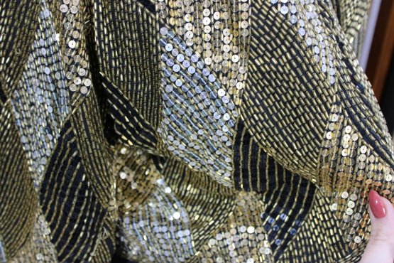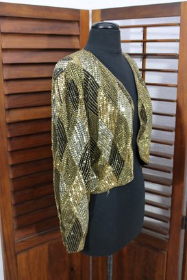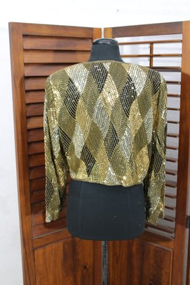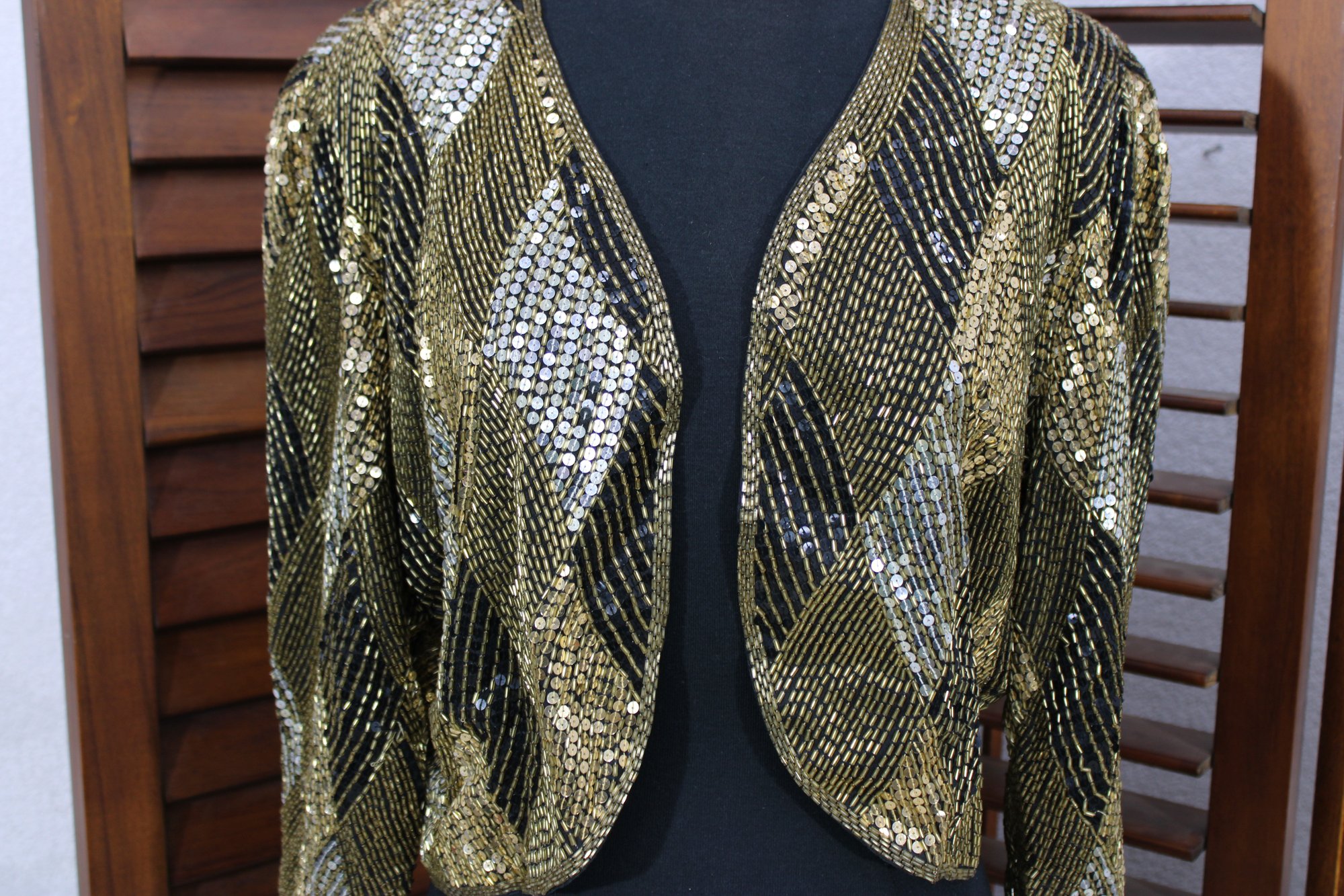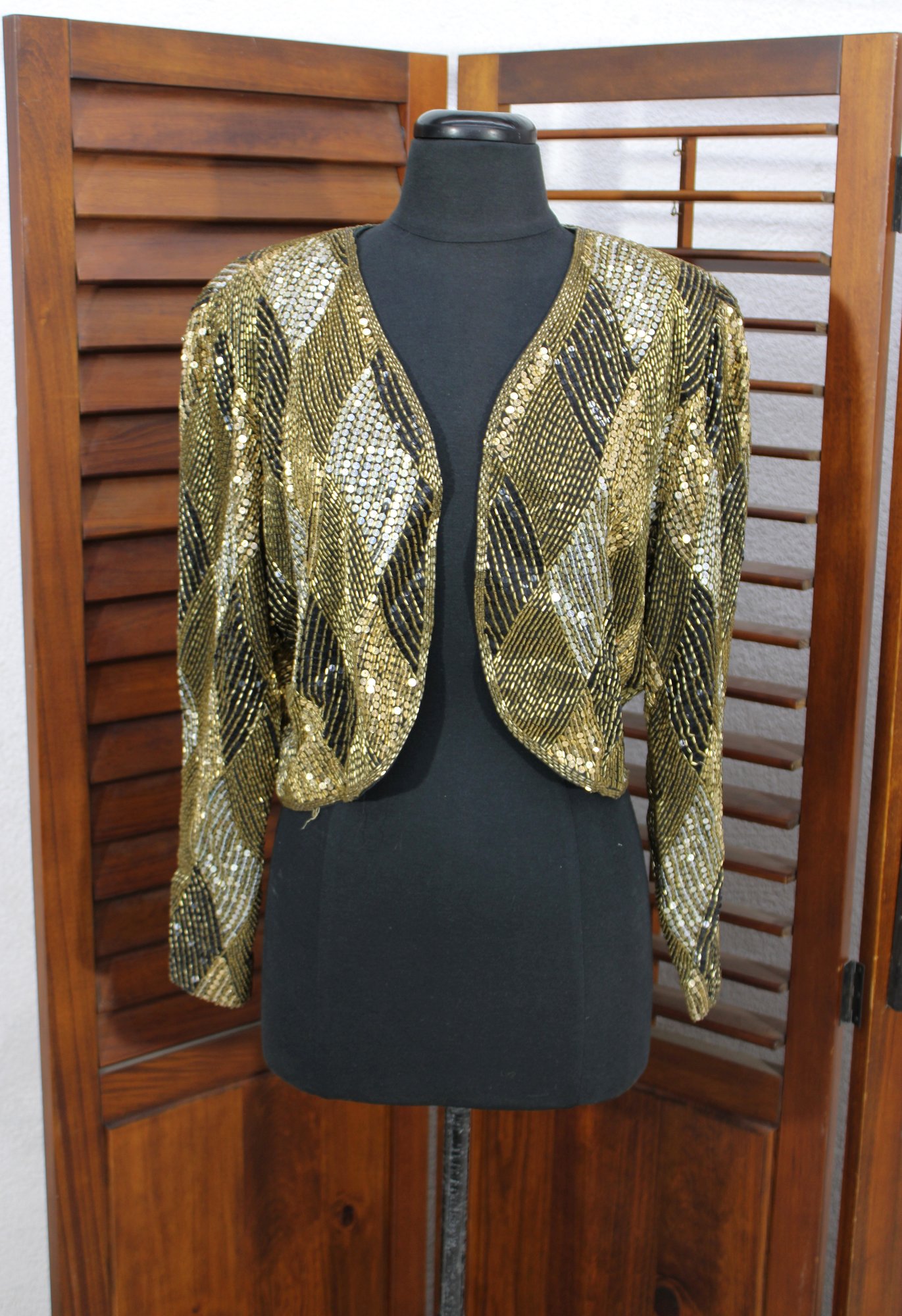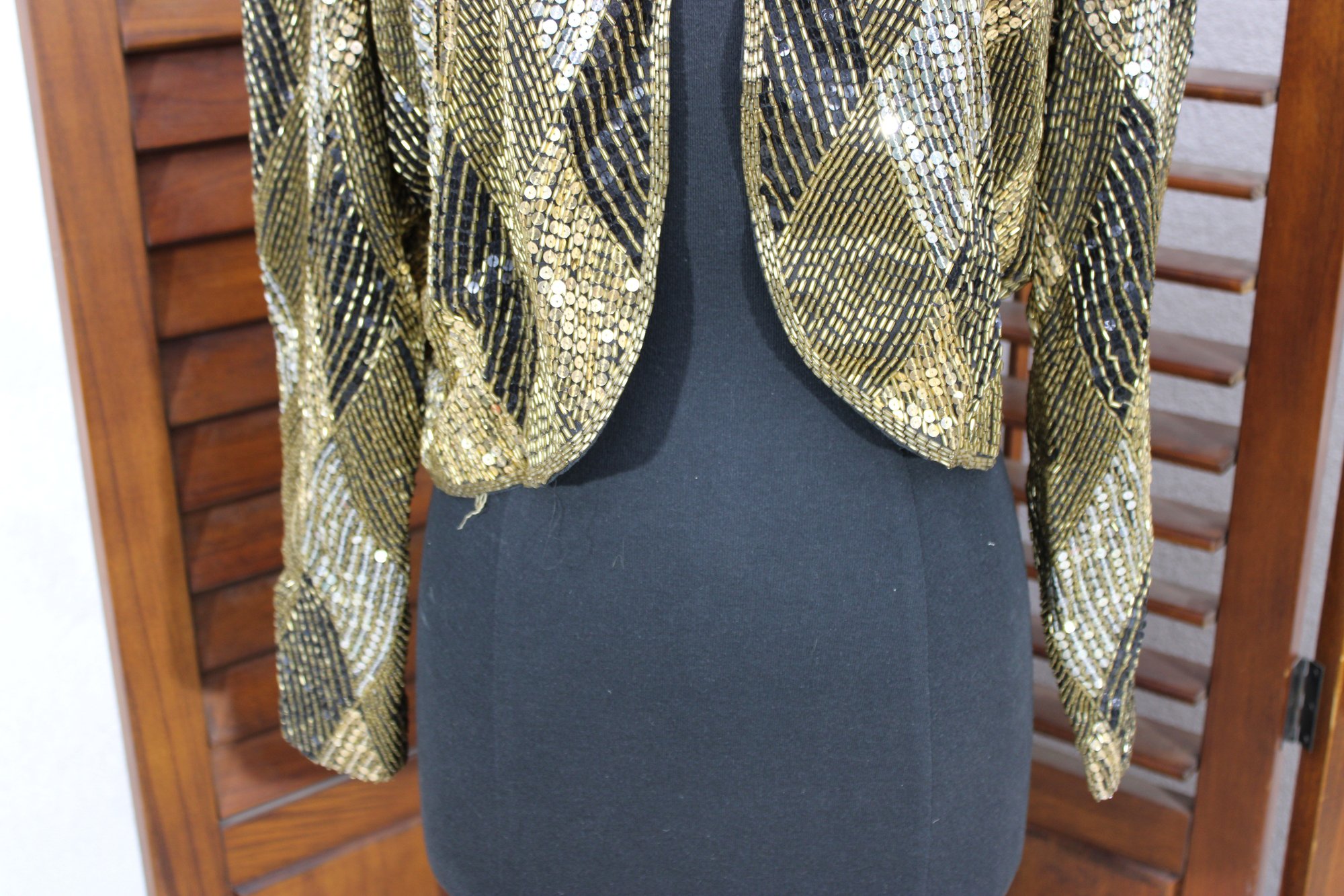 Glamorous and full of vintage flair, this gold and black sequin evening jacket features an eye-catching diamond pattern that sparkles beautifully with movement. Designed in a cropped, open-front bolero style, this piece is perfect for evening wear, stage, cocktail events, or adding dramatic vintage glamour to any outfit.