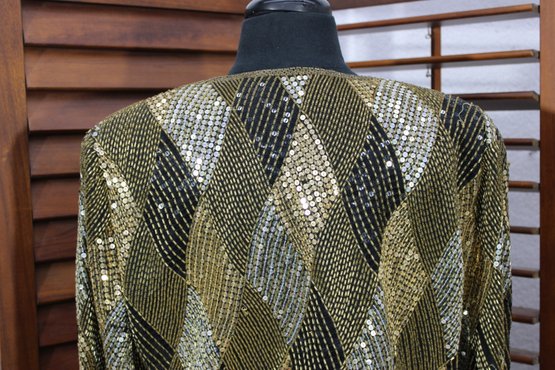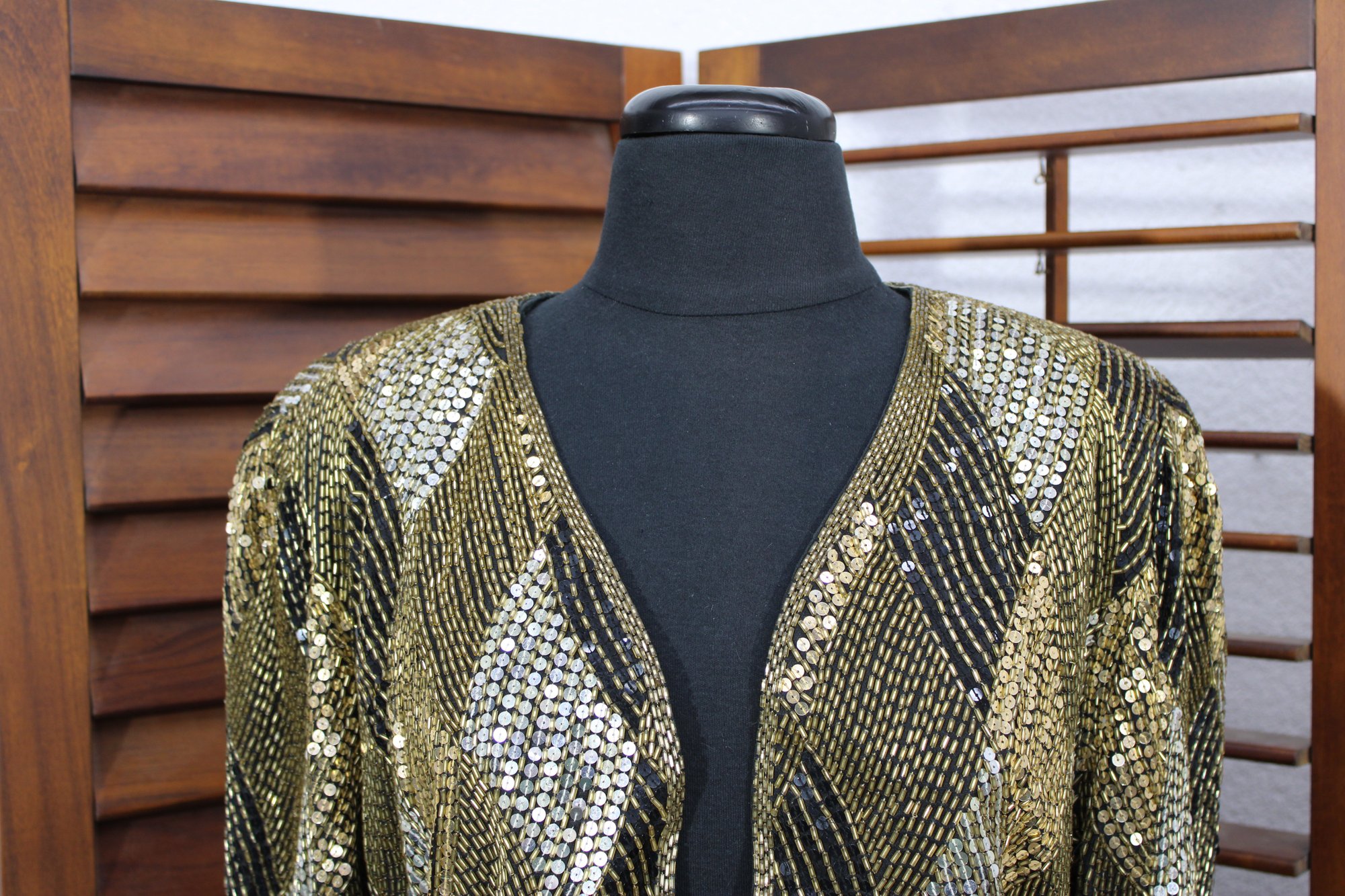 The jacket is fully embellished with sequins throughout the front, sleeves, and back, creating a bold statement look from every angle. A true standout piece for collectors of vintage fashion or anyone seeking a show-stopping jacket.