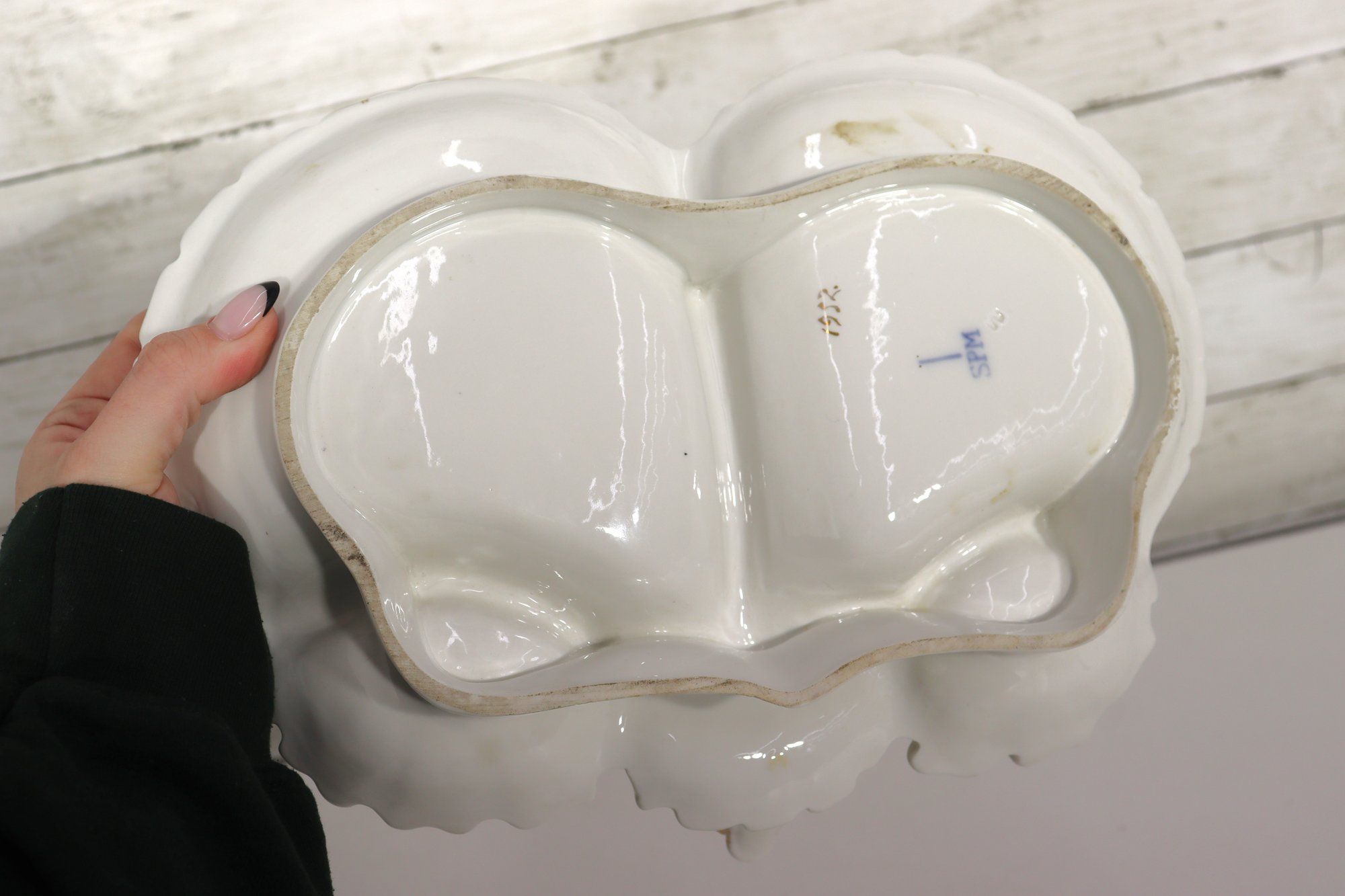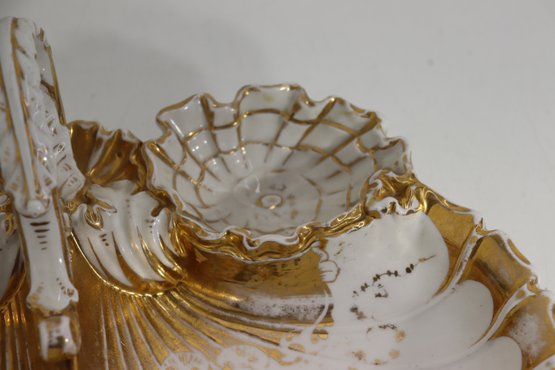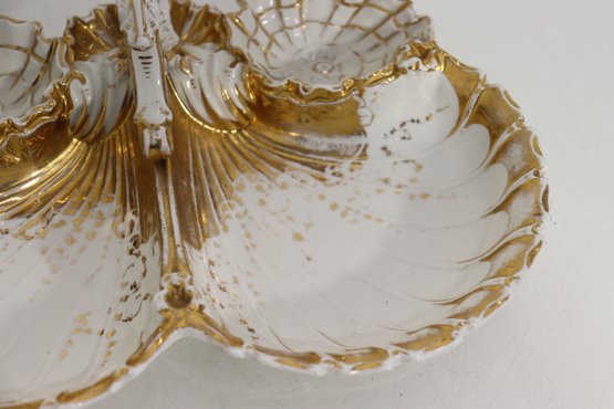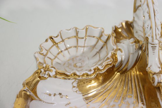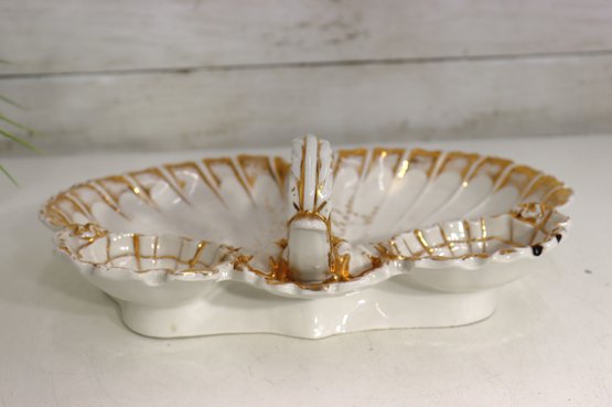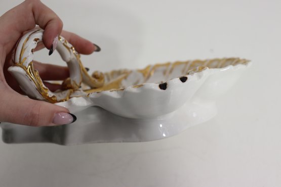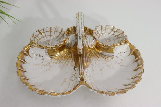 vintage porcelain double shell dish with a beautifully sculpted handle and luxurious hand-applied gold gilding. The twin shell design features fine detailing along the ridges and edges, giving it a refined coastal elegance.