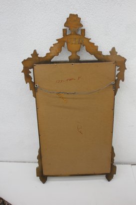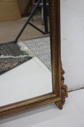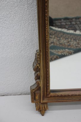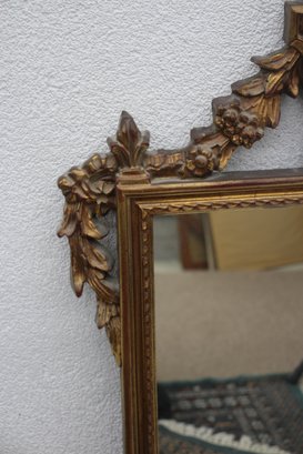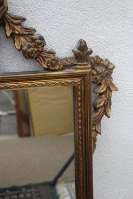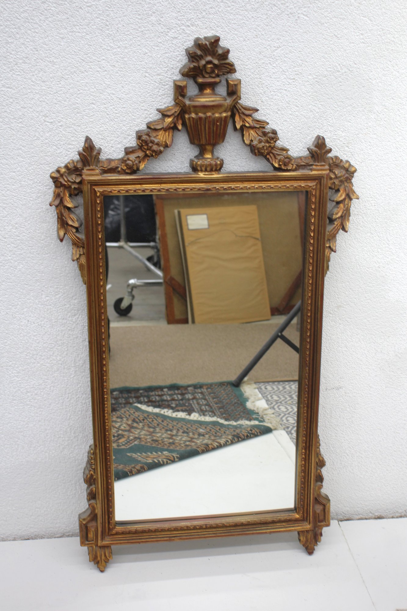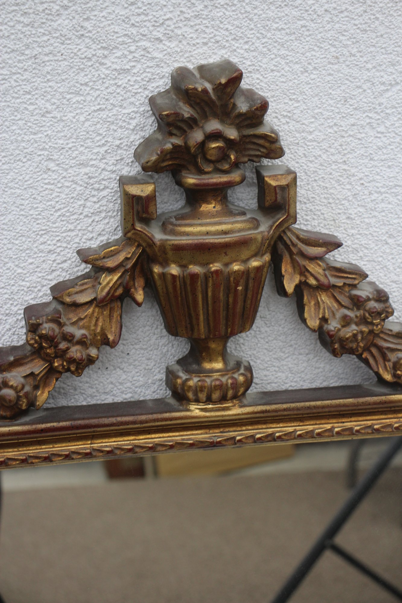stunning vintage wall mirror features an ornate gold gilt frame adorned with an intricate floral design and a central urn motif. Its timeless elegance and detailed craftsmanship make it a standout piece for any home decor.