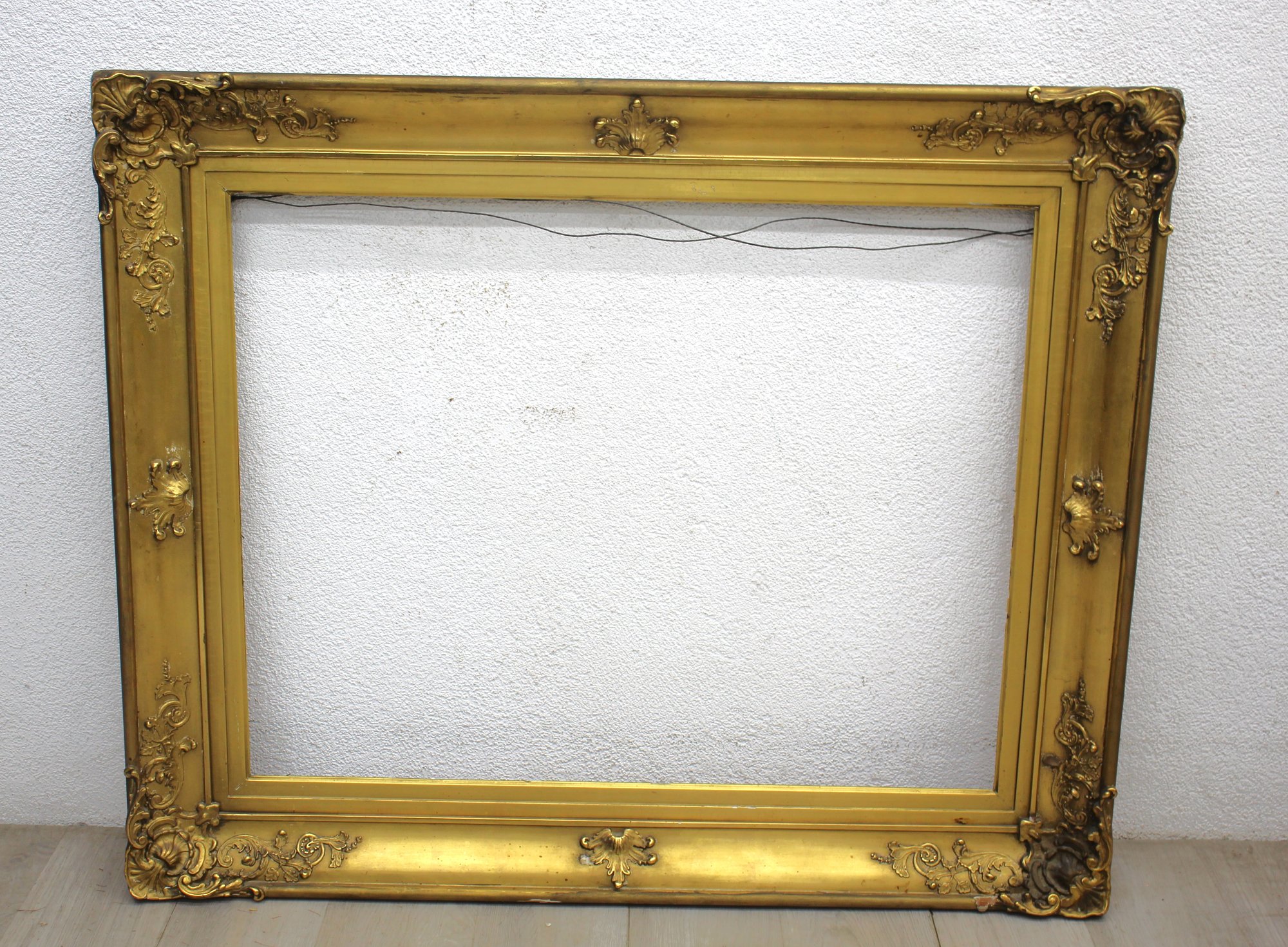 classical elegance with this magnificent vintage picture frame. Boasting opulent gold-tone gilding and ornate floral details, this frame is a quintessential representation of timeless design. Measuring generously, this piece is an ideal choice for showcasing a cherished painting or portrait, adding an instant touch of sophistication to any collection.