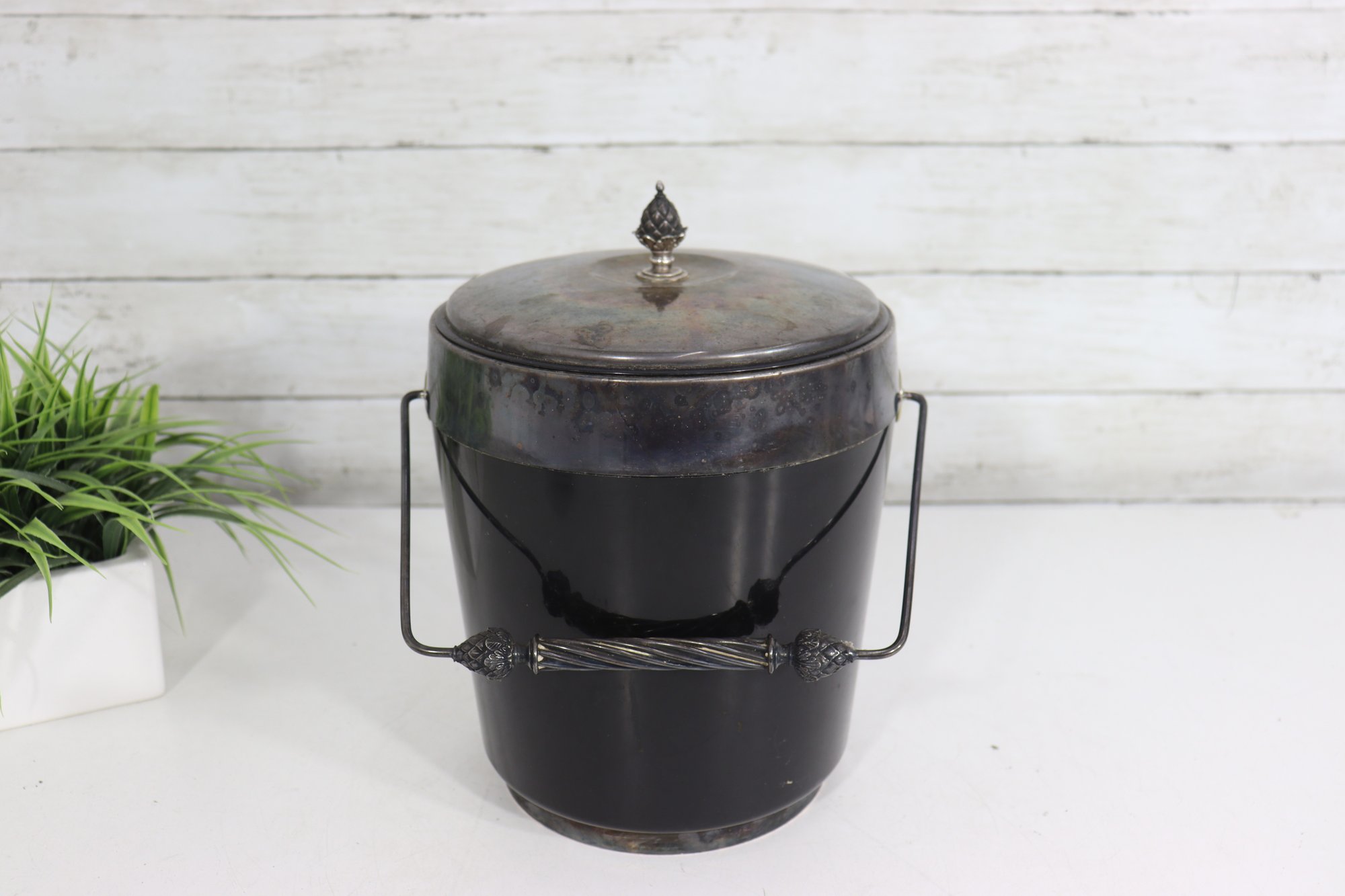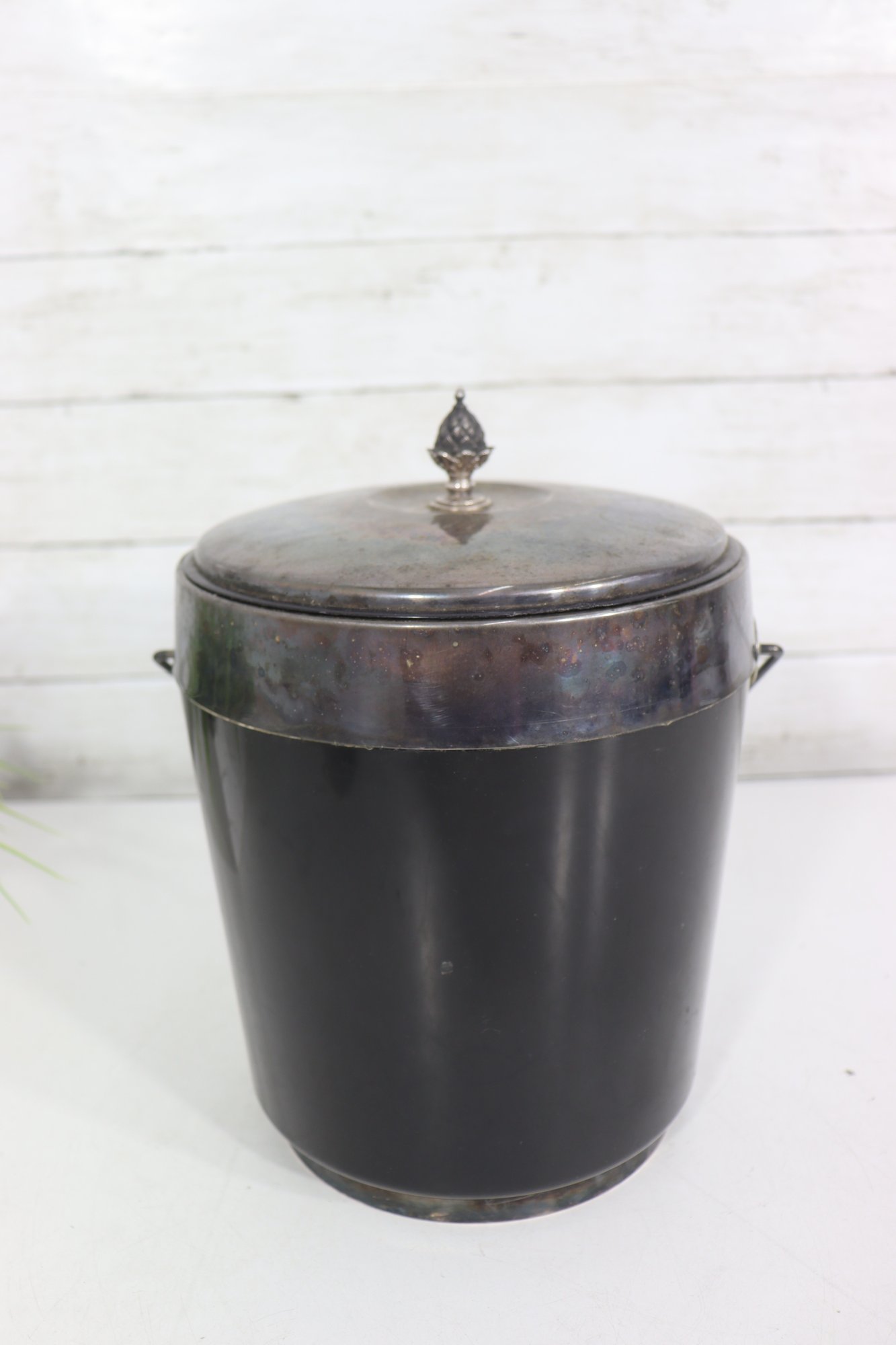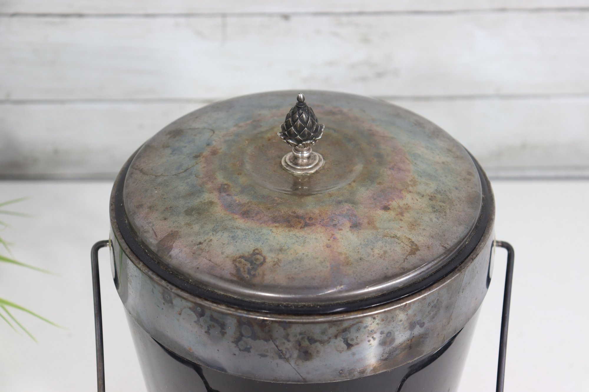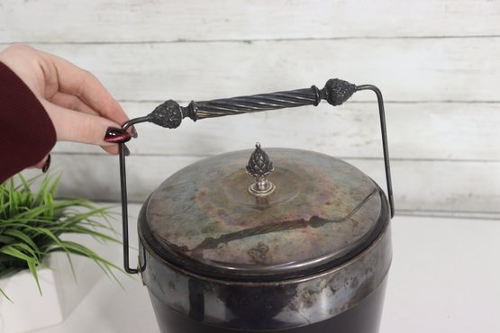 The exterior shows a rich, darkened patina from age and use, while the silverplate lid displays attractive tonal variation. This piece was designed for entertaining and would make an excellent addition to a home bar, cocktail cart, or silver collection.