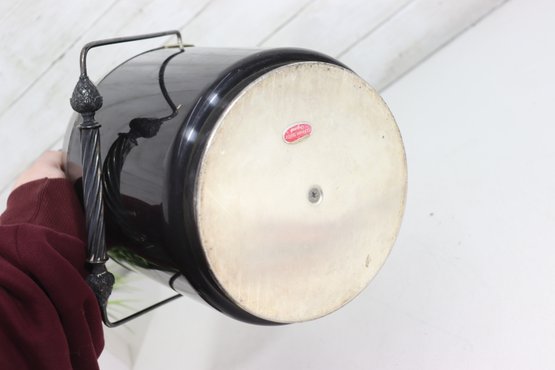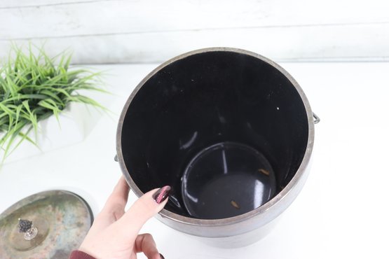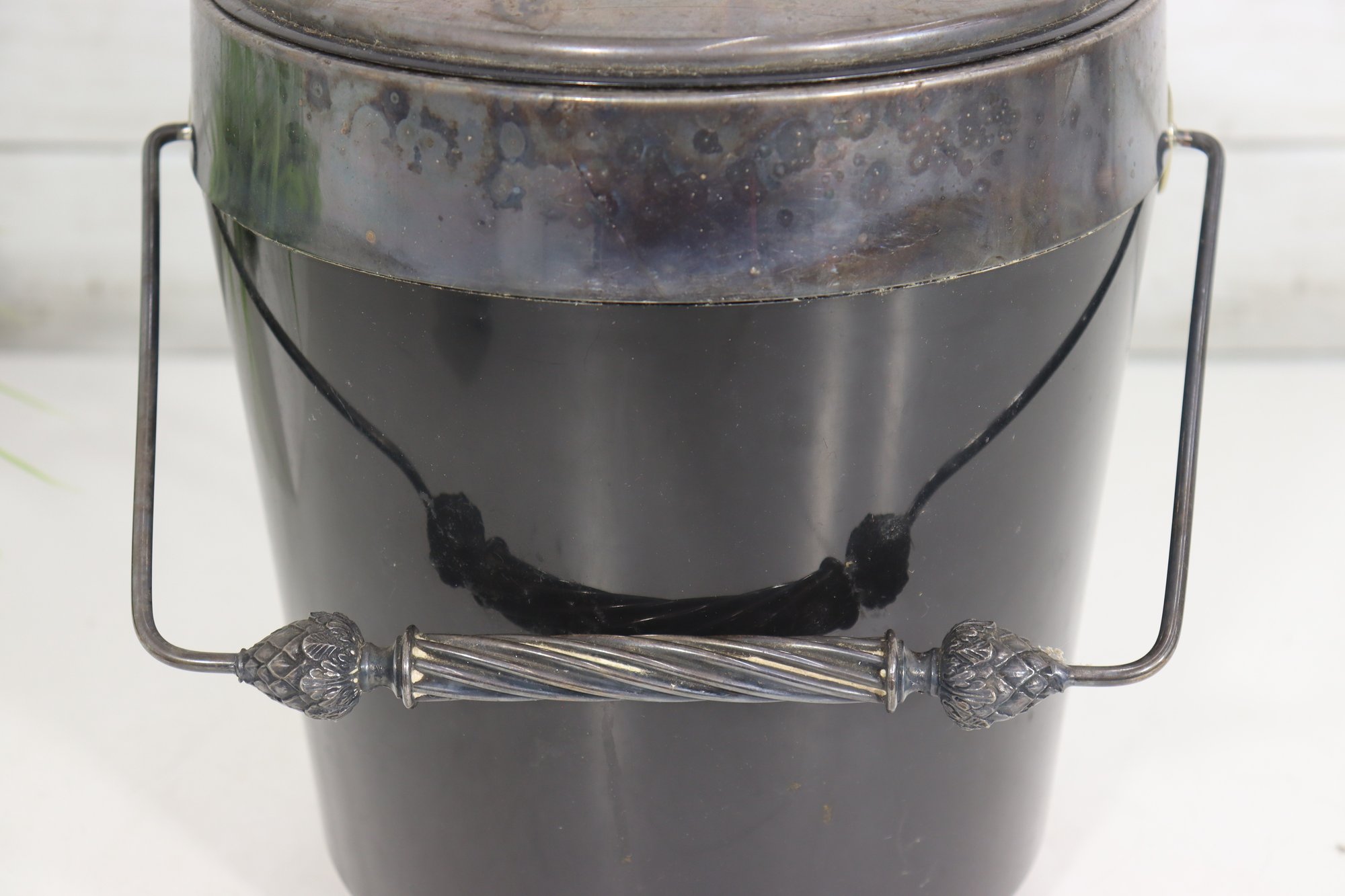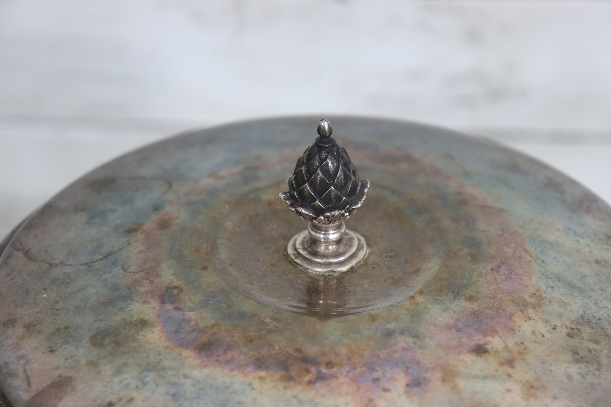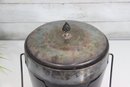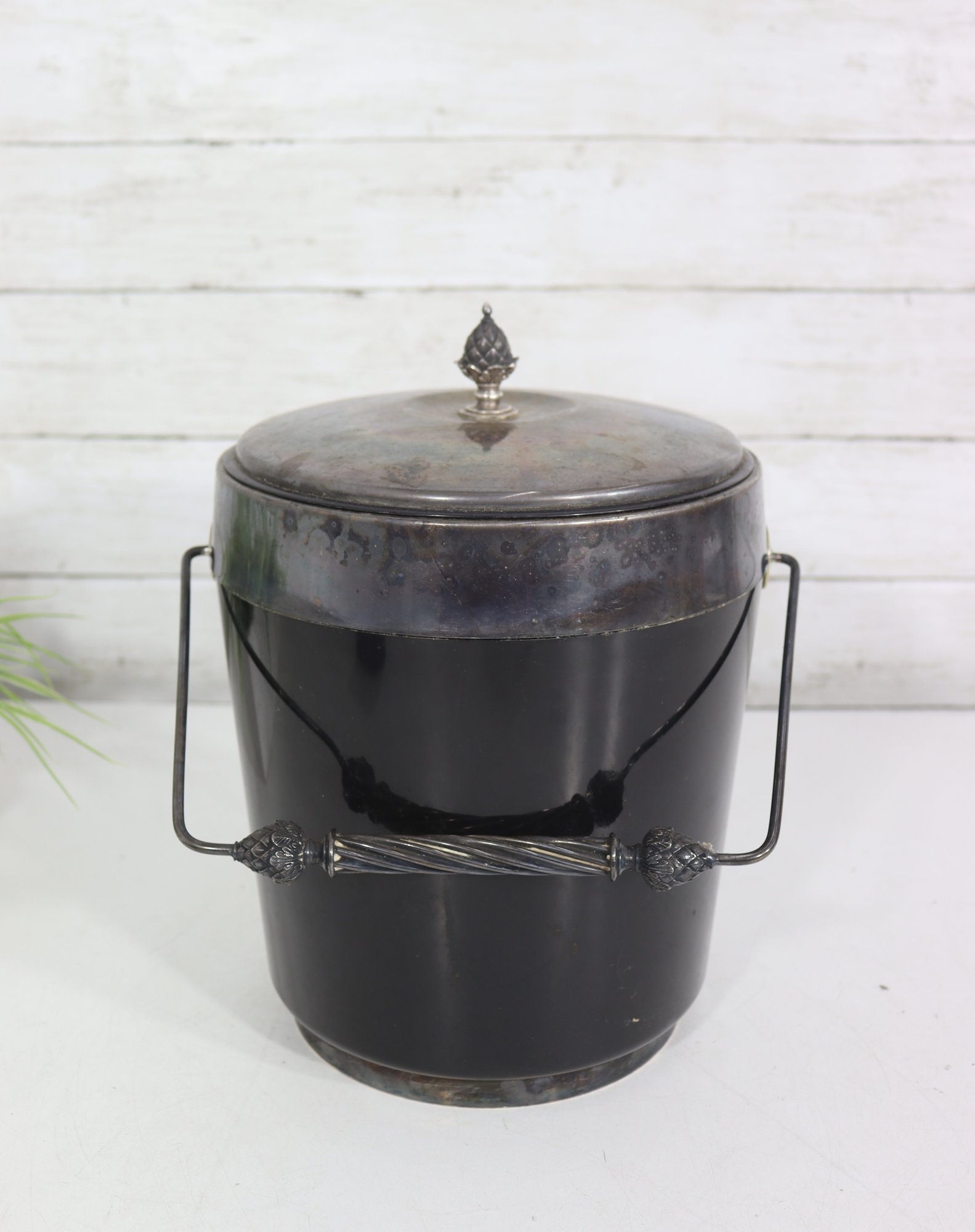 The exterior shows a rich, darkened patina from age and use, while the silverplate lid displays attractive tonal variation. This piece was designed for entertaining and would make an excellent addition to a home bar, cocktail cart, or silver collection.