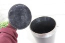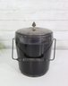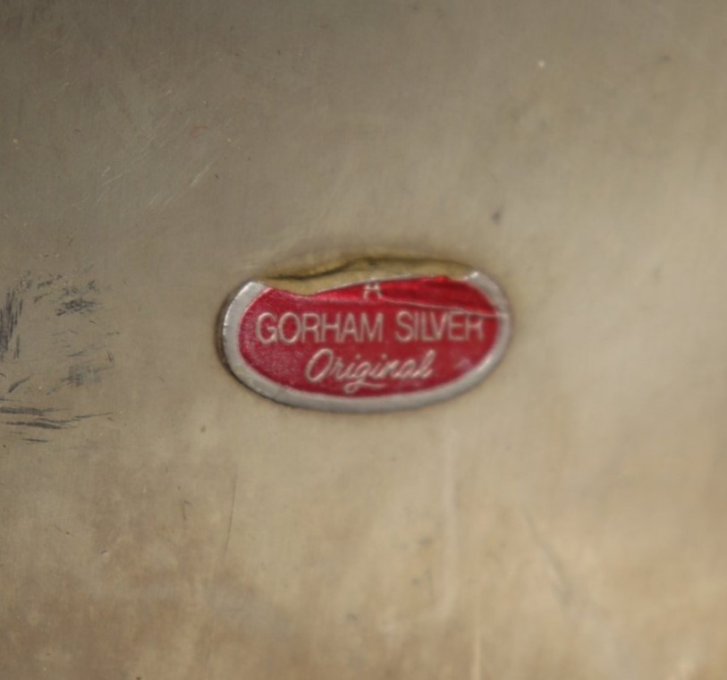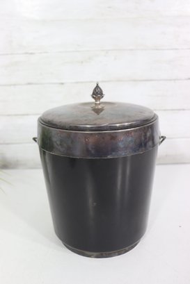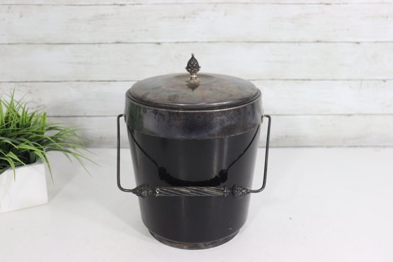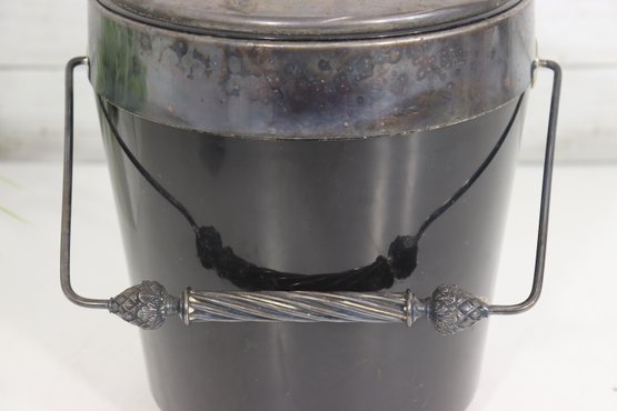 a vintage Gorham silverplate ice bucket, marked “Gorham Silver – Original” on the interior base. This elegant bar accessory features a cylindrical form, side swing handles, and a fitted lid topped with a decorative finial, making it both functional and visually striking.