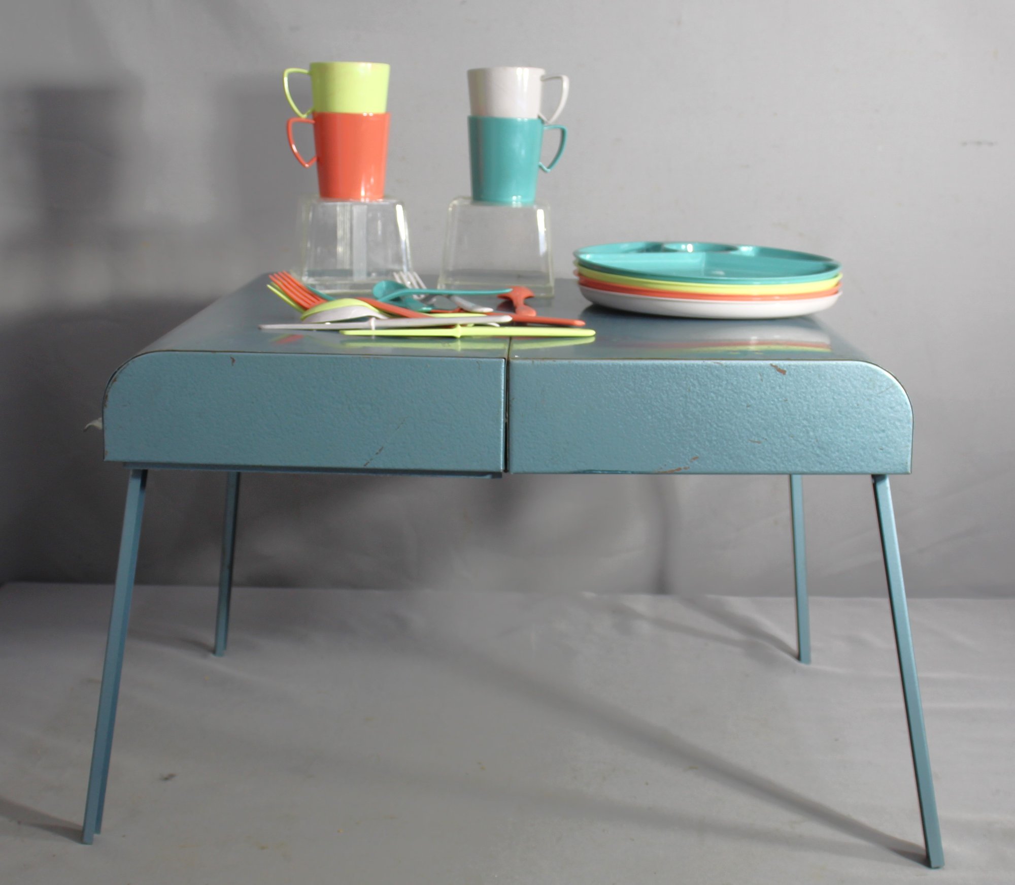 vintage Gotham suitcase picnic set, perfect for adding a touch of retro flair to your outdoor dining experiences. This delightful set features a durable, compact suitcase that unfolds into a convenient picnic table with sturdy metal legs. Included are colorful plastic cups, plates, and cutlery, evoking the vibrant style of mid-century modern design. Ideal for picnics, camping trips, or as a unique display piece, this Gotham picnic set combines practicality with nostalgic appeal.