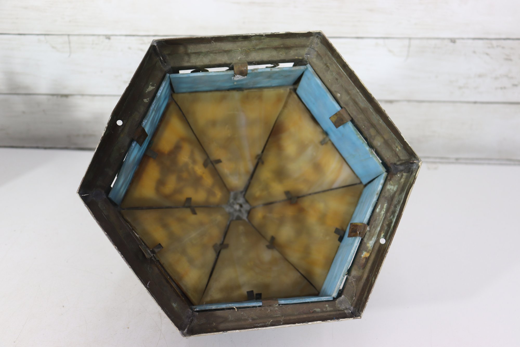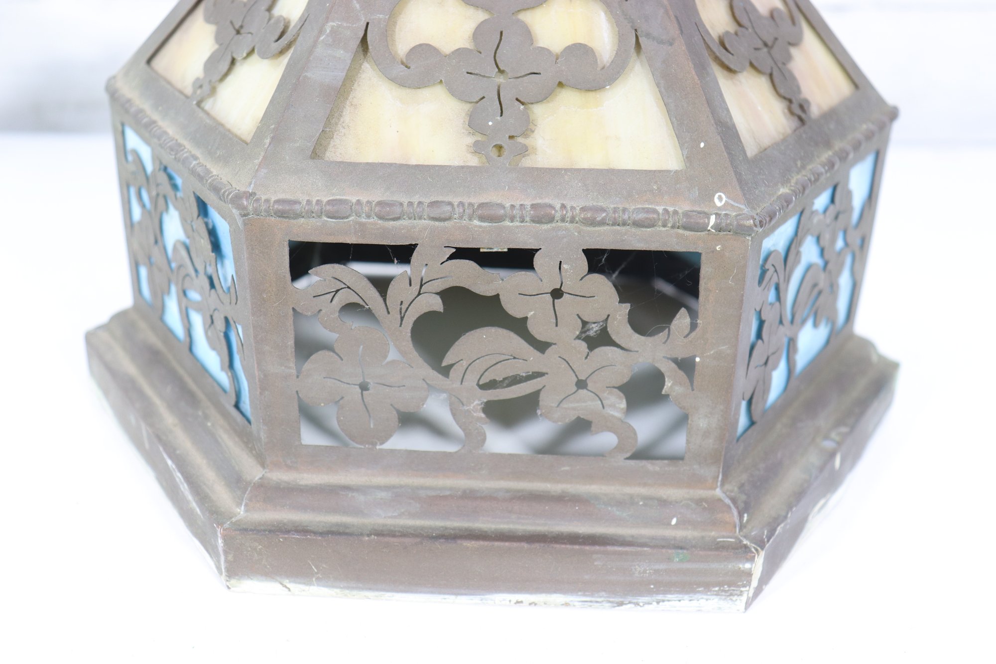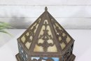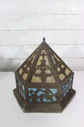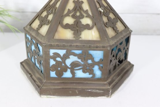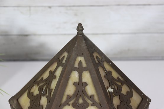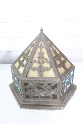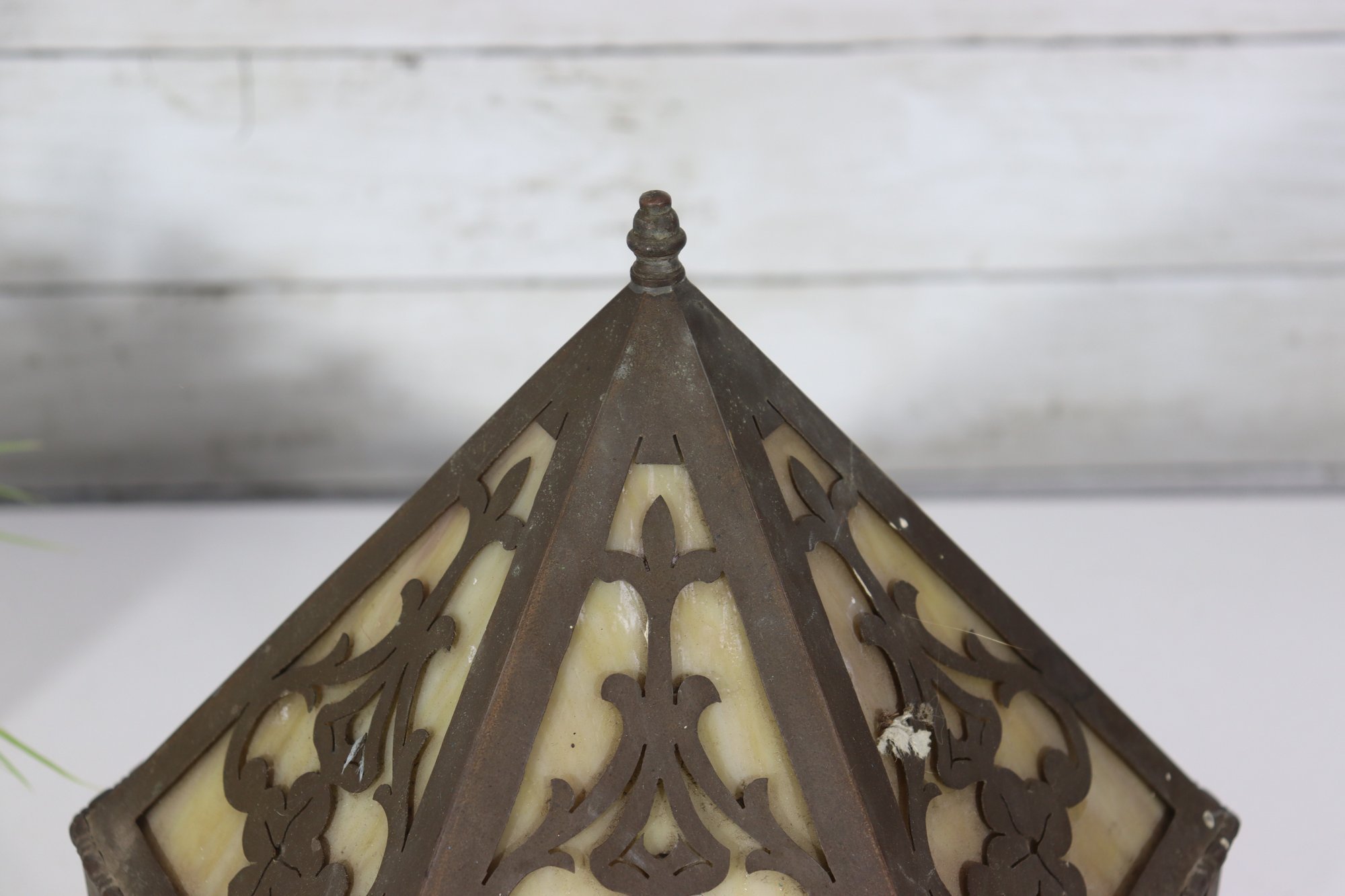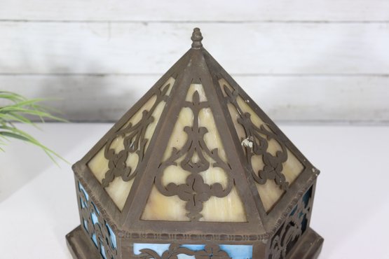 a vintage metal light fixture shade featuring ornate Gothic / Moorish-style cutout detailing and slag glass panels. The fixture has a striking architectural form with a multi-sided design and decorative finial top, making it an excellent piece for restoration, reuse, or decorative display.